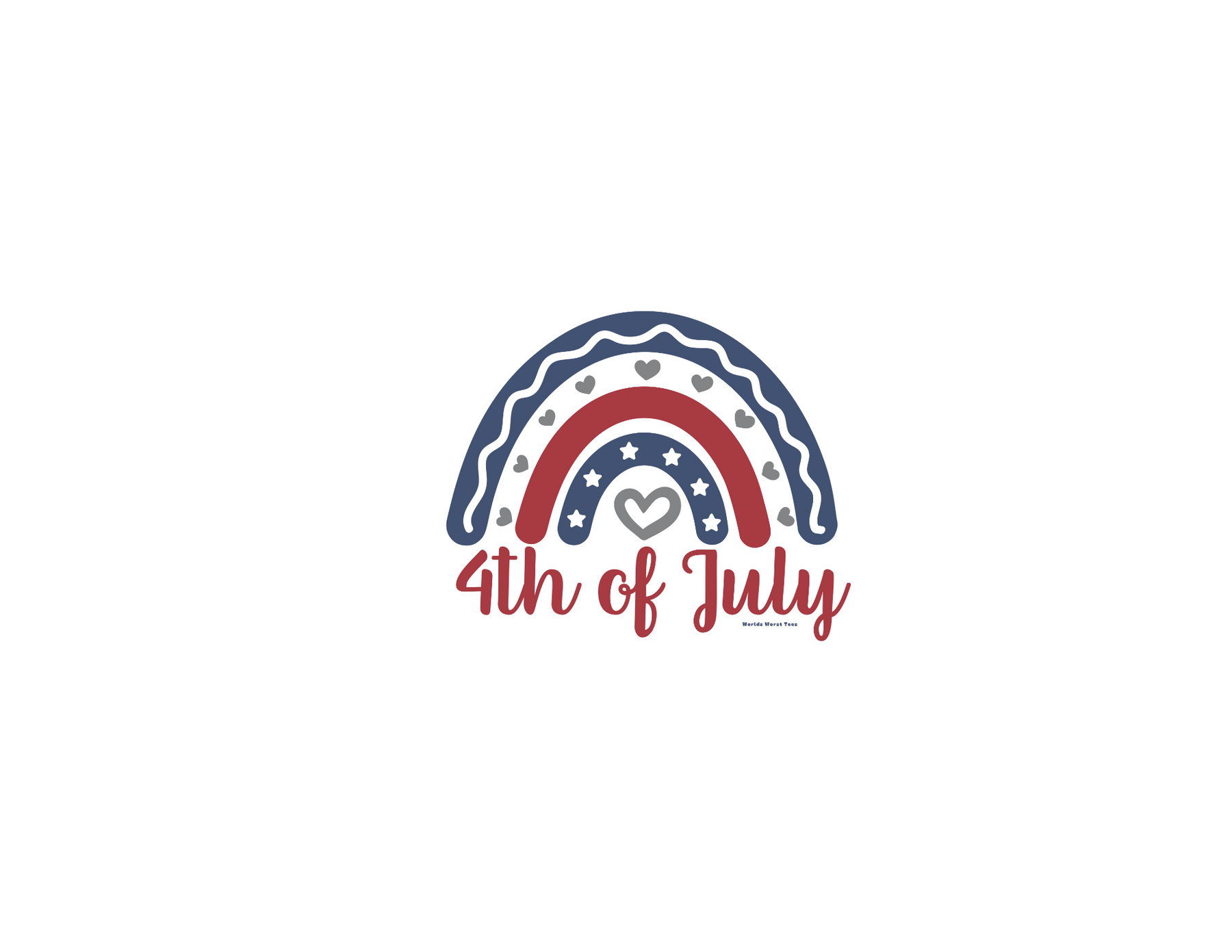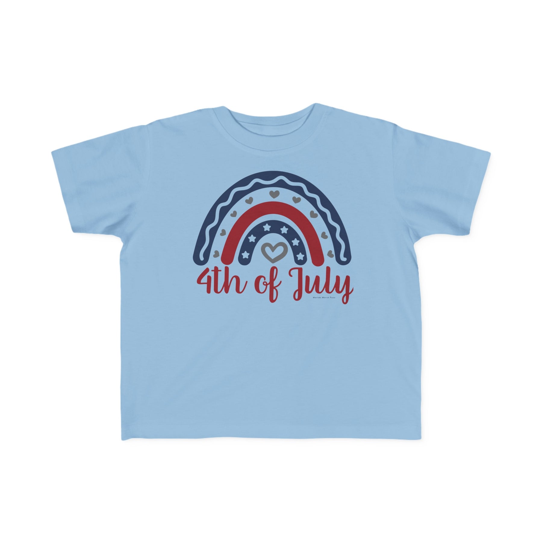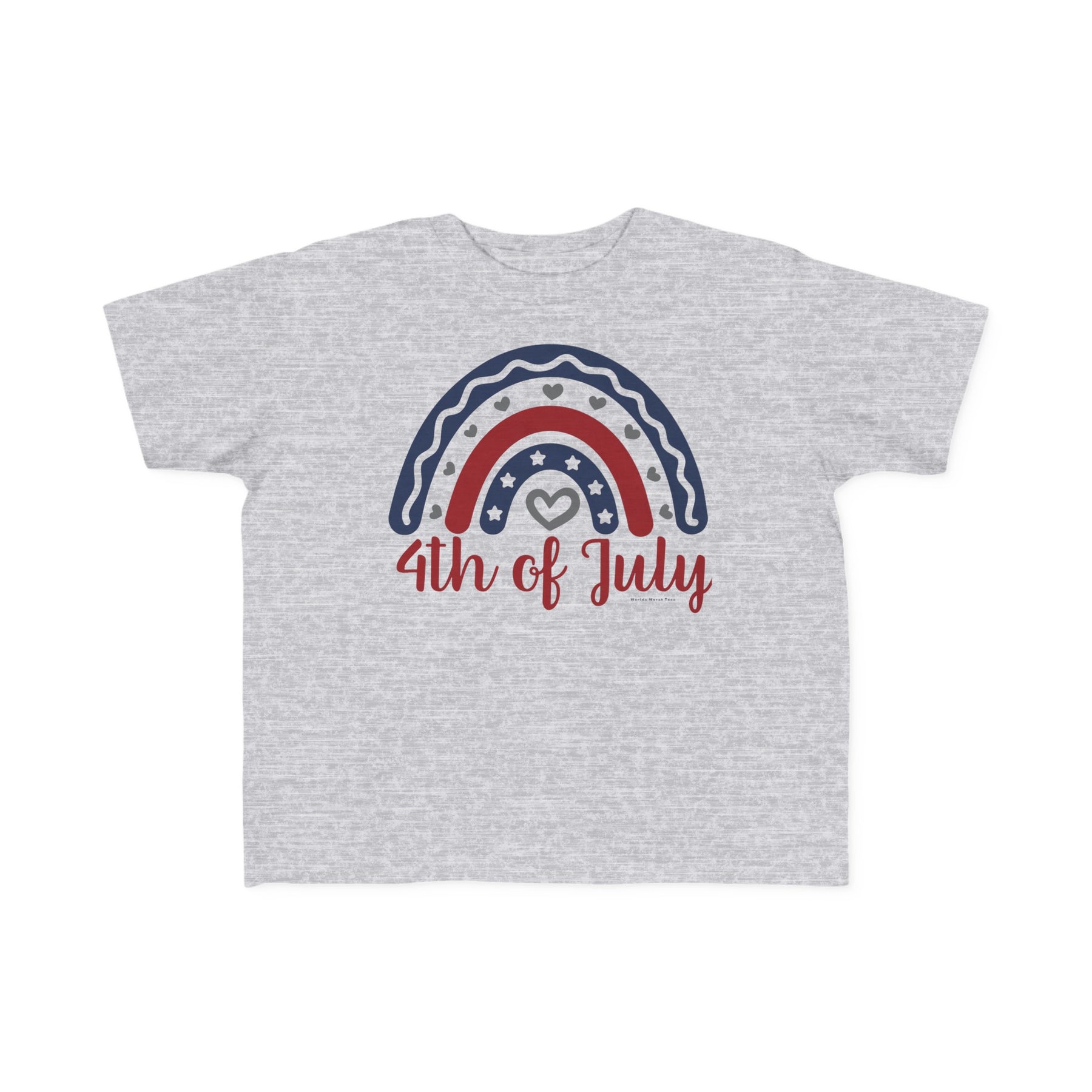 A 4th of July Toddler Tee featuring a rainbow with stars and hearts logo. Made of 100% combed ringspun cotton, light fabric, tear-away label, and a classic fit. Available in sizes 2T to 5-6T.