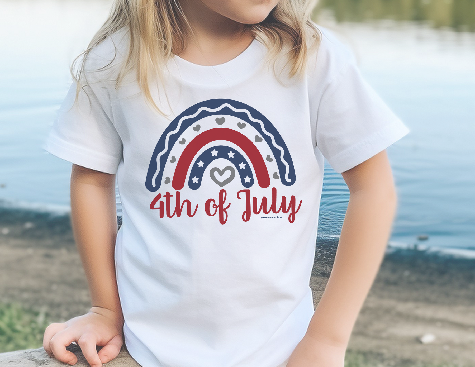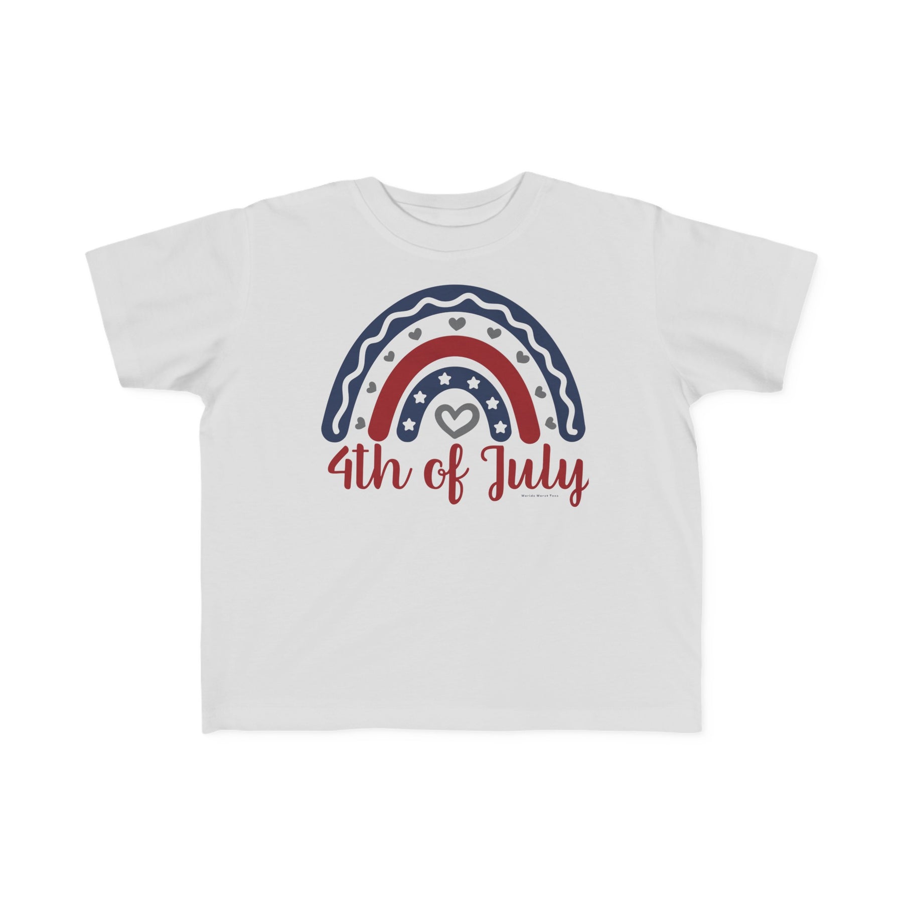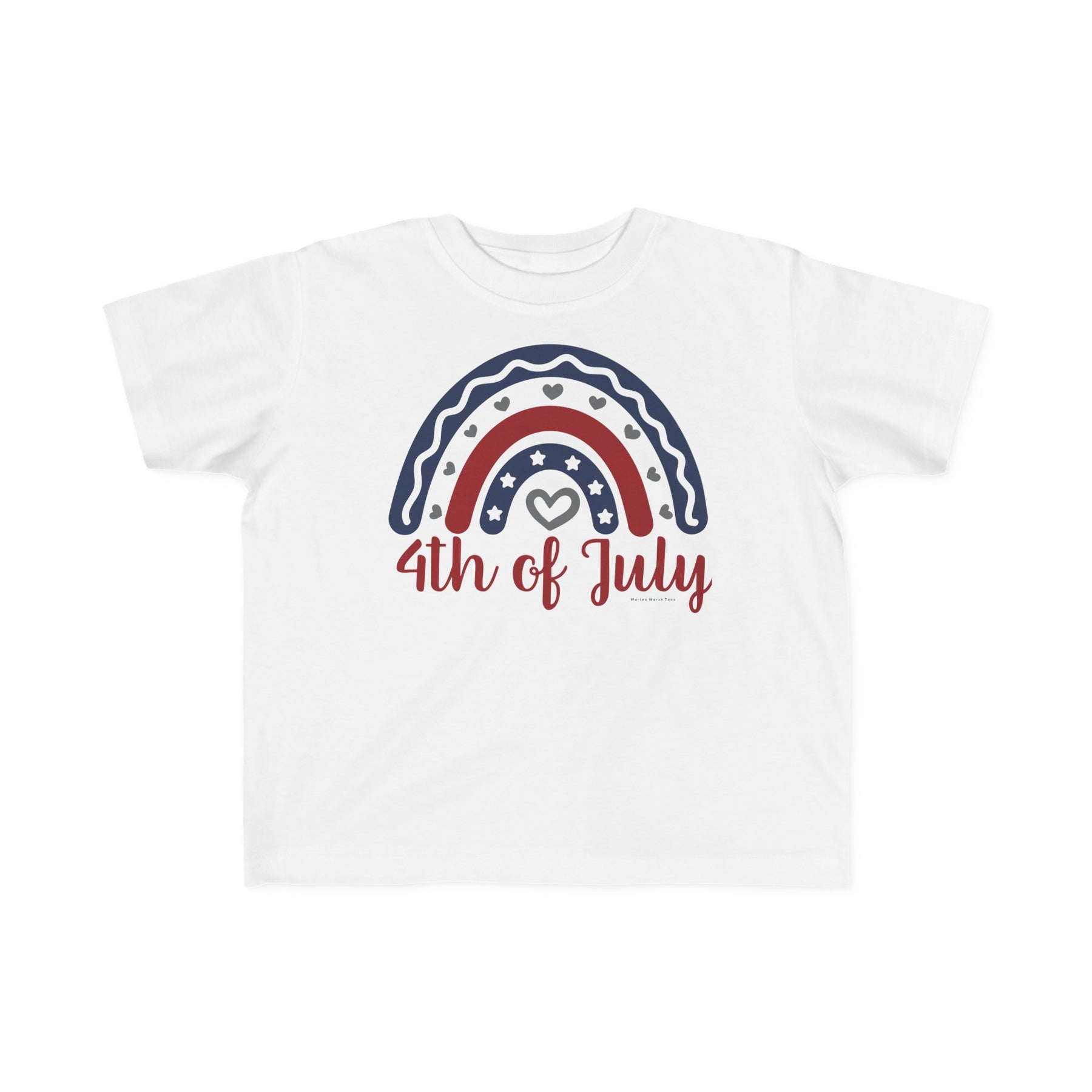 A classic fit 4th of July Toddler Tee in white, featuring a rainbow design with stars and hearts. Made of 100% combed ringspun cotton, light fabric, tear-away label, and true-to-size fit. Sizes: 2T, 3T, 4T, 5-6T.