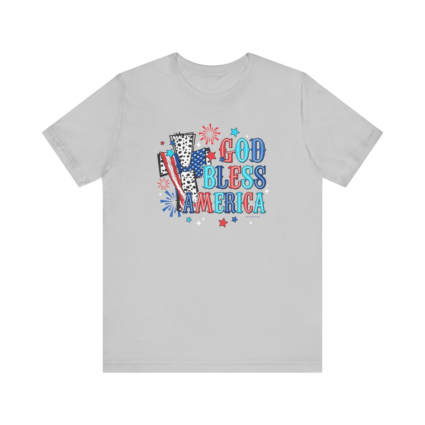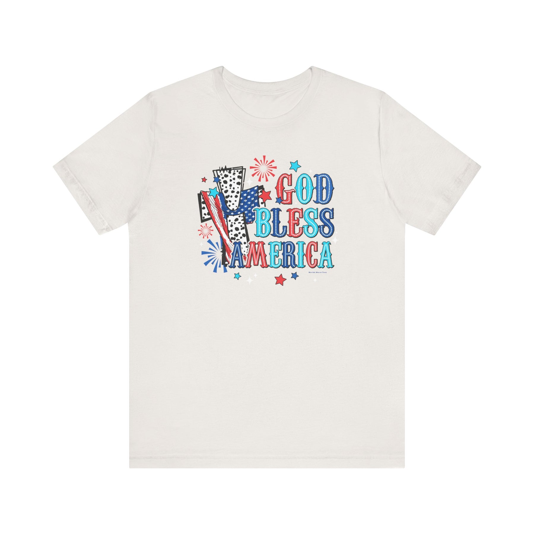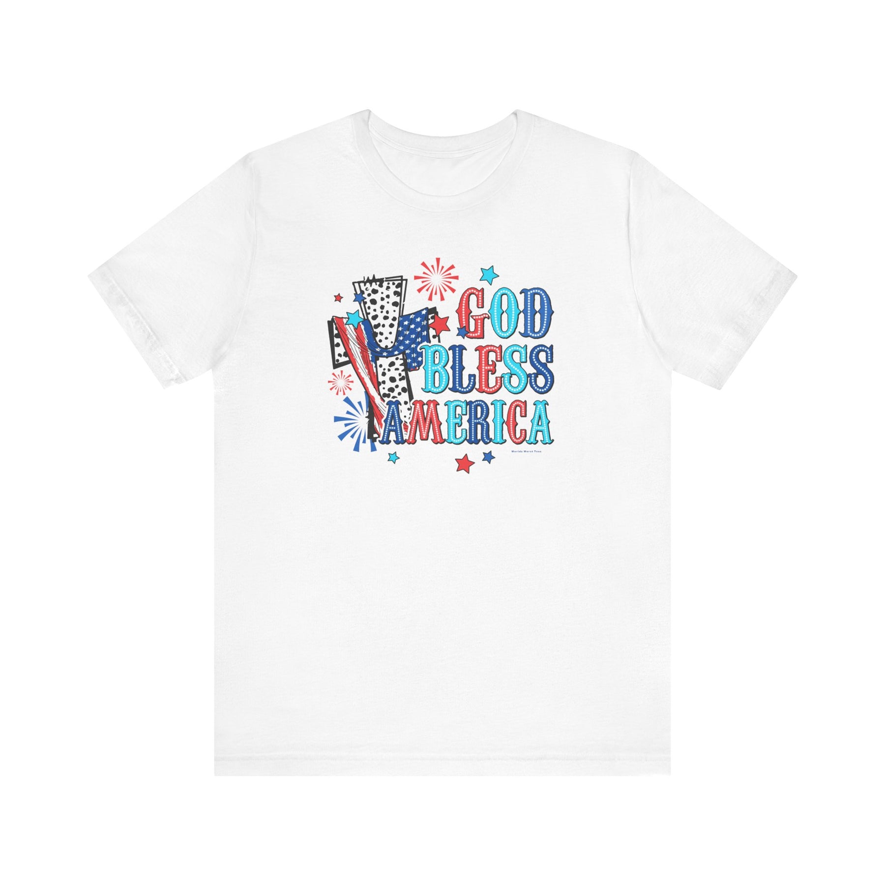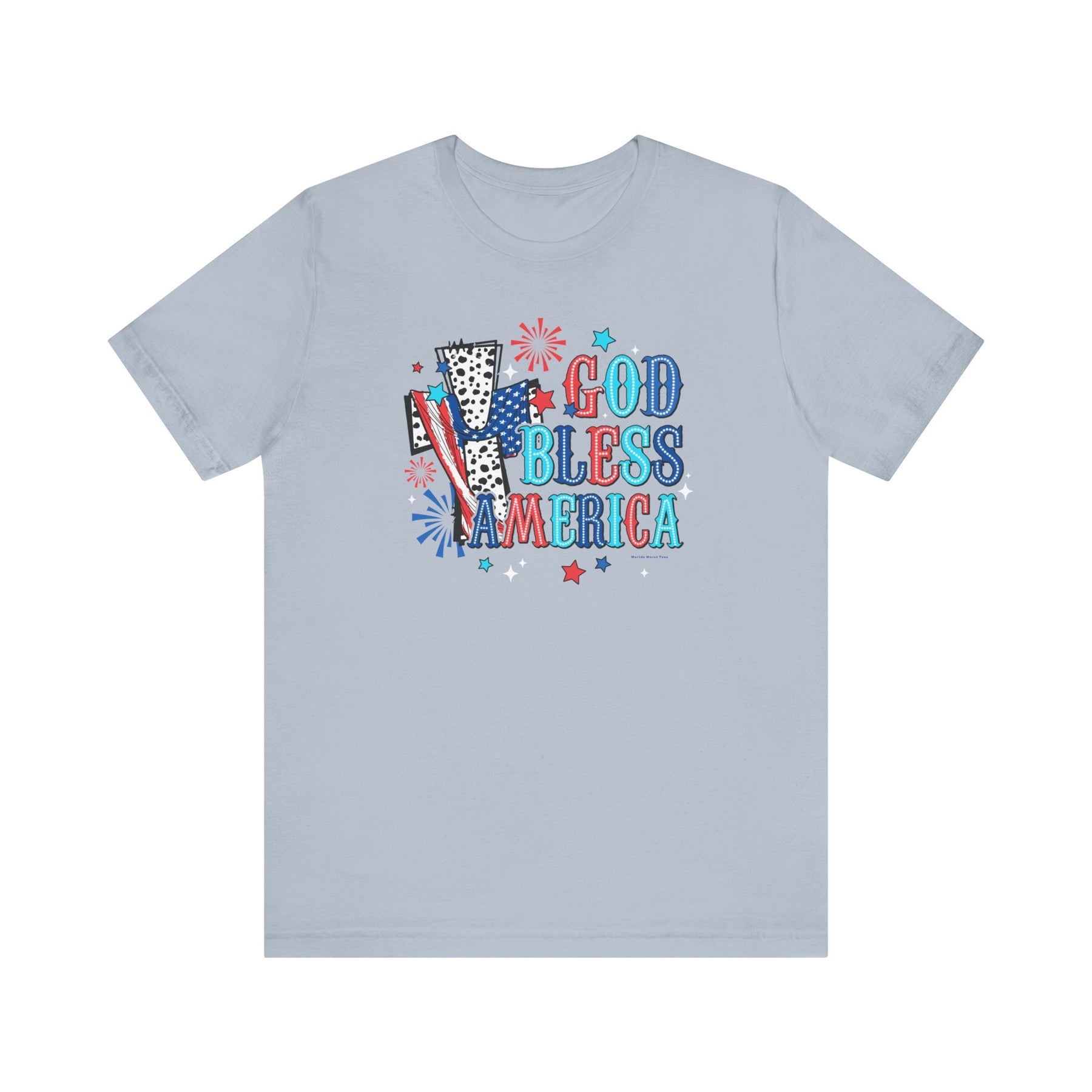 A classic unisex jersey tee featuring a cross and fireworks design, embodying patriotism with God Bless America theme. Made of 100% cotton, with ribbed knit collars and tear-away label. Sizes XS to 3XL.