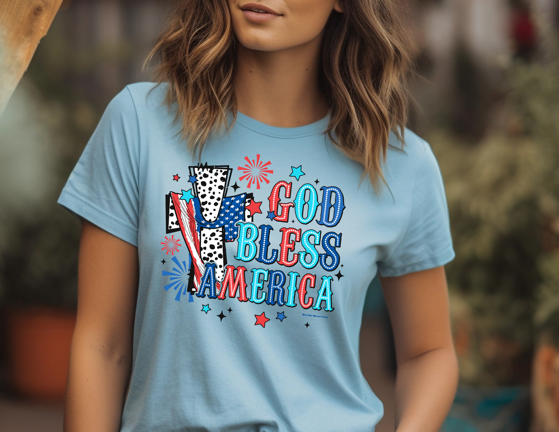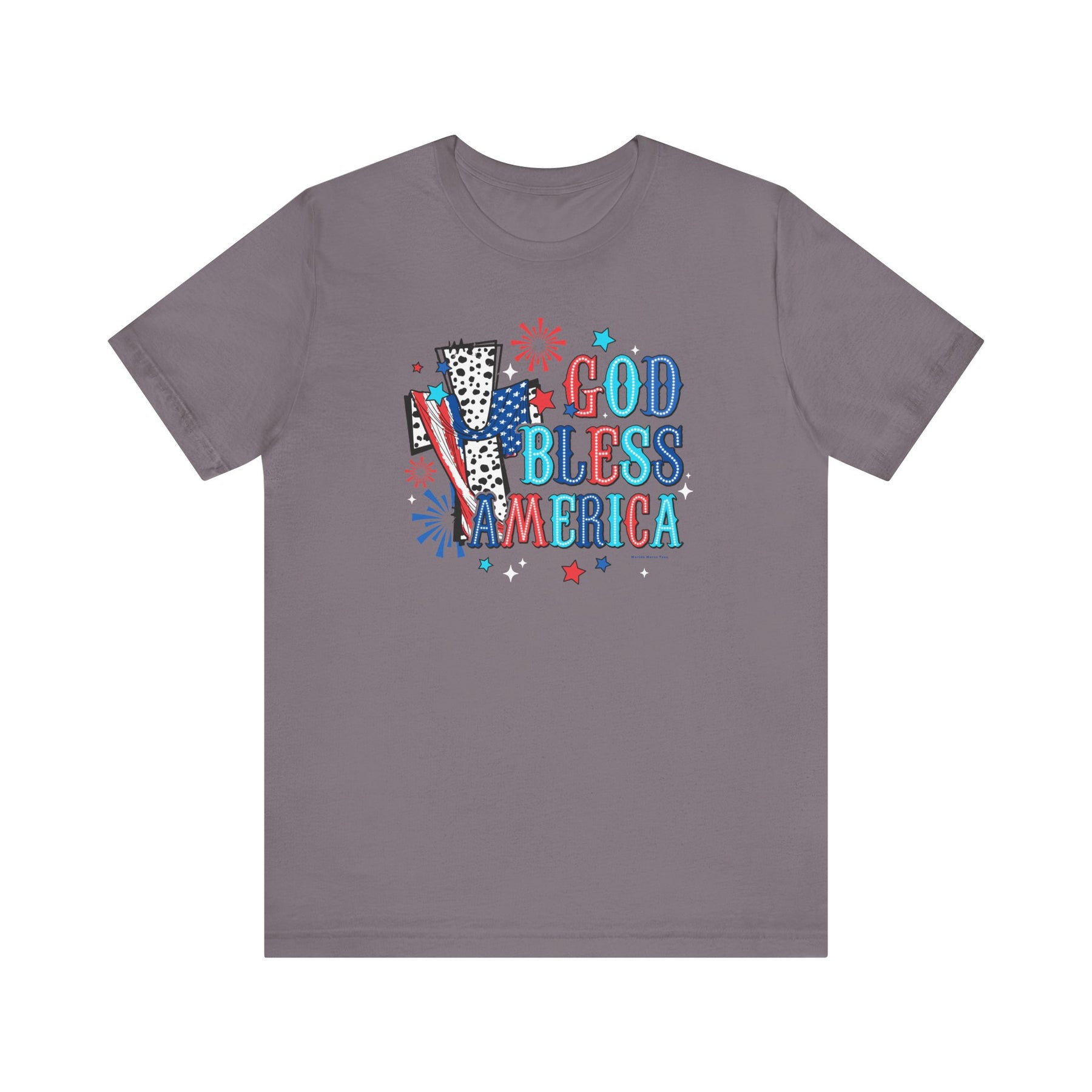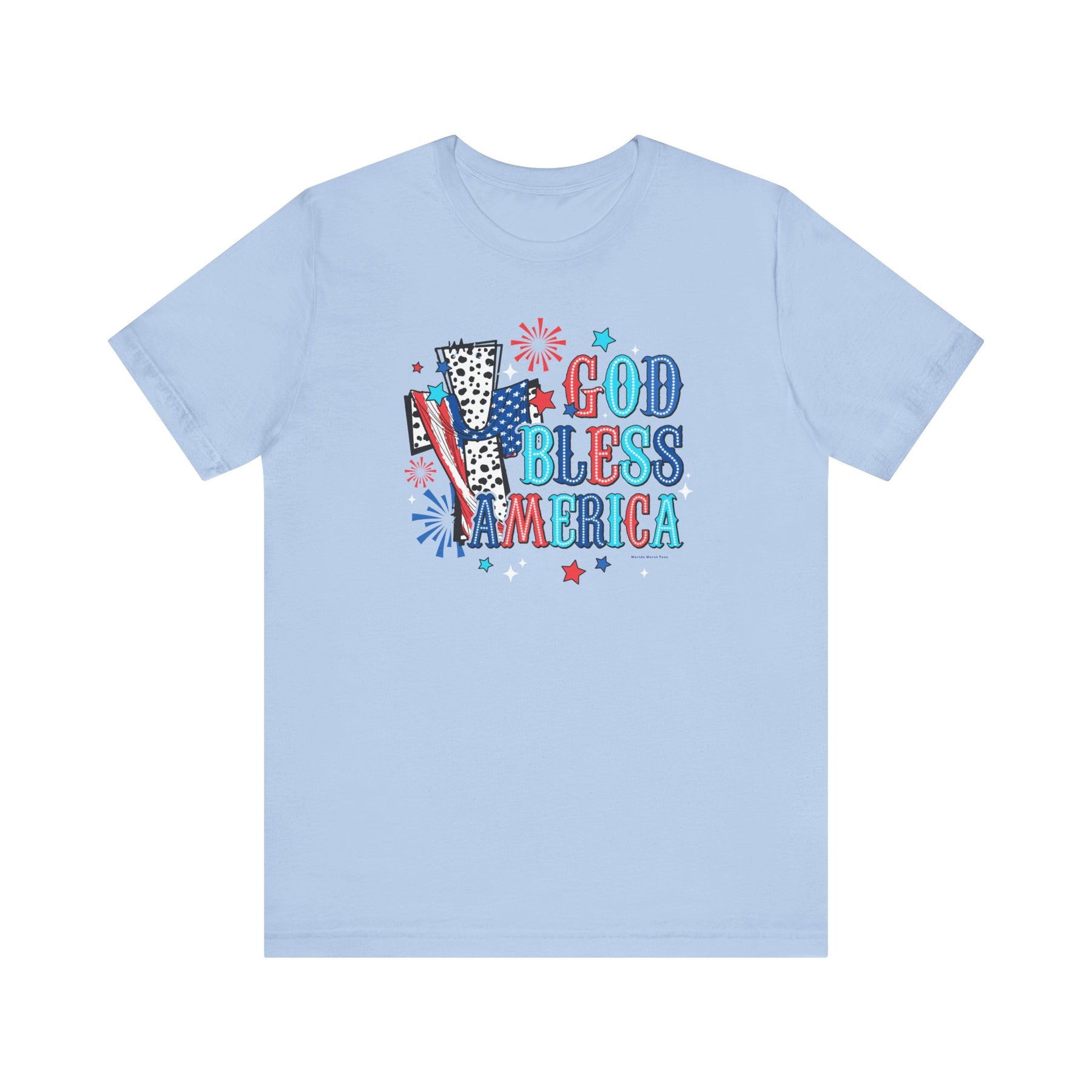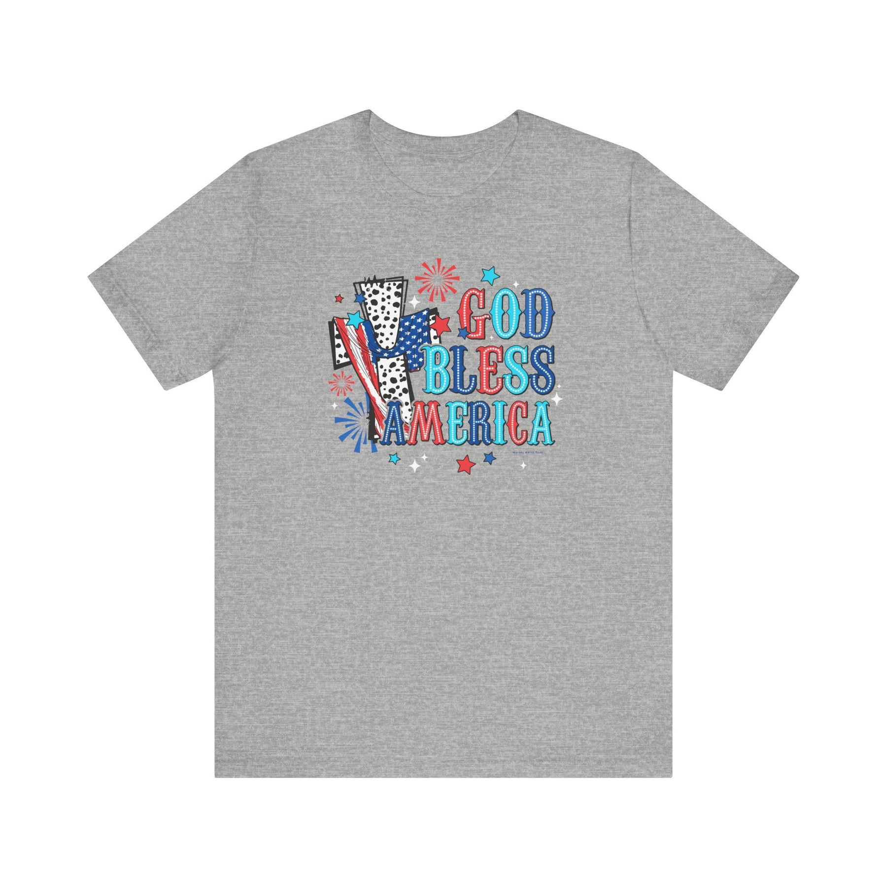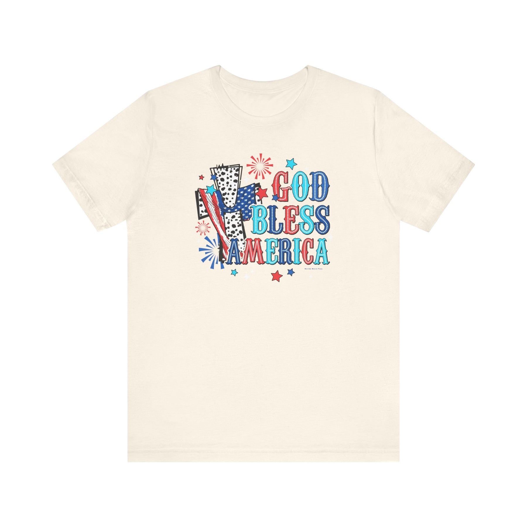 A classic unisex jersey tee featuring a cross and fireworks design, embodying patriotism with God Bless America theme. Made of 100% cotton, with ribbed knit collars and tear-away label. Sizes XS to 3XL.