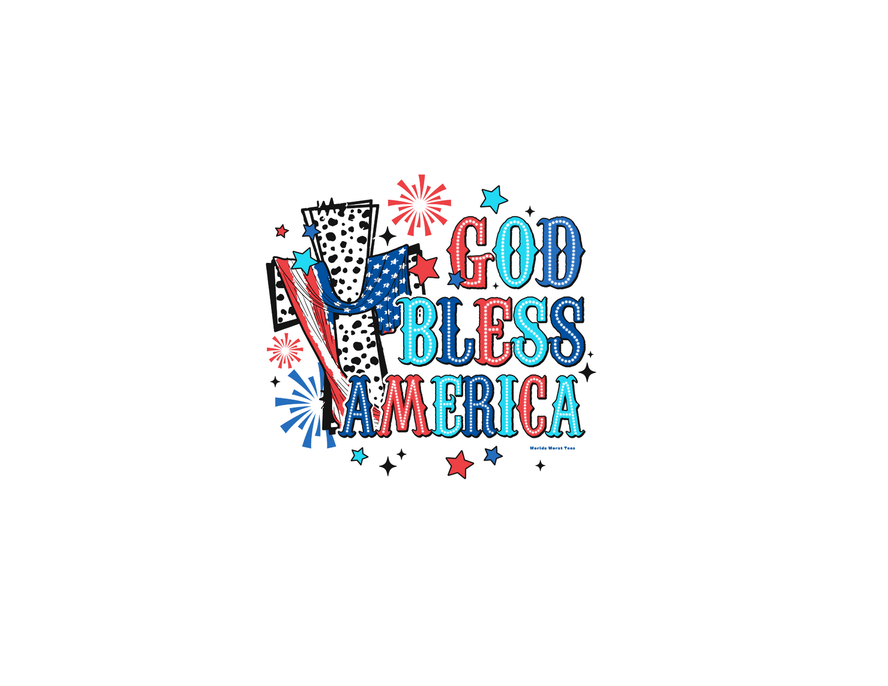 A white t-shirt featuring a cross and fireworks design, embodying the title God Bless America Cross Tee from Worlds Worst Tees. Unisex jersey tee with ribbed knit collars, taping on shoulders, and 100% Airlume combed cotton.