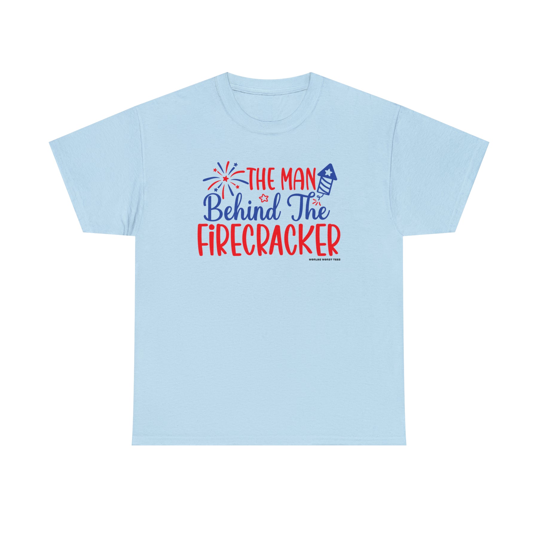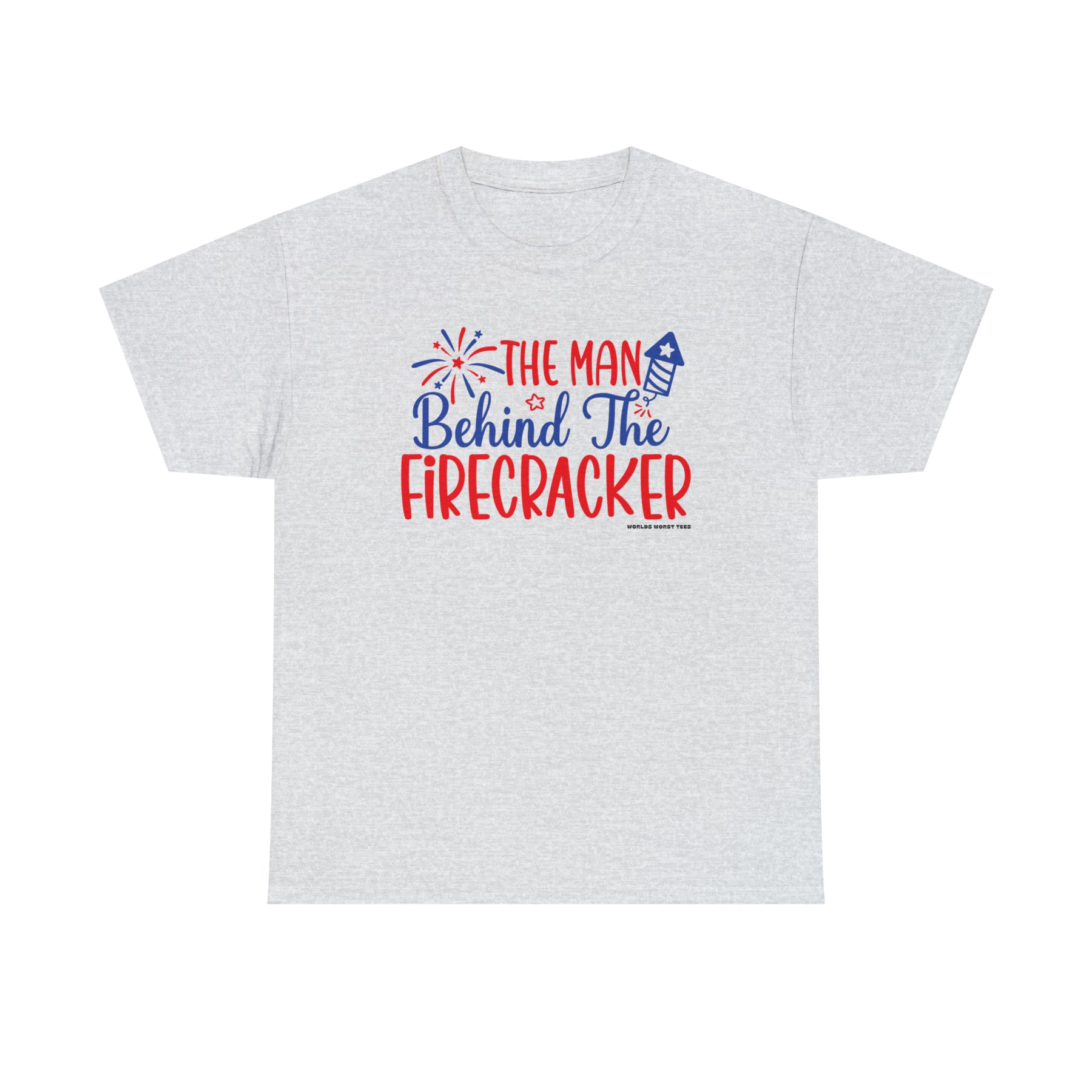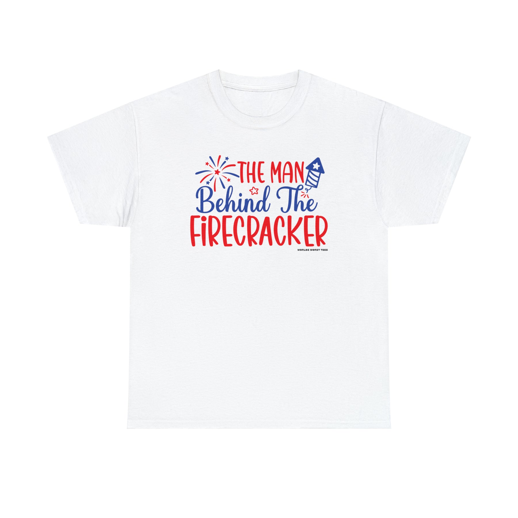 Man Behind the Firecracker Tee: Unisex heavy cotton t-shirt with red and blue text and fireworks design. Classic fit, ribbed knit collar, no side seams. Sizes S-5XL. Ideal staple for casual fashion.