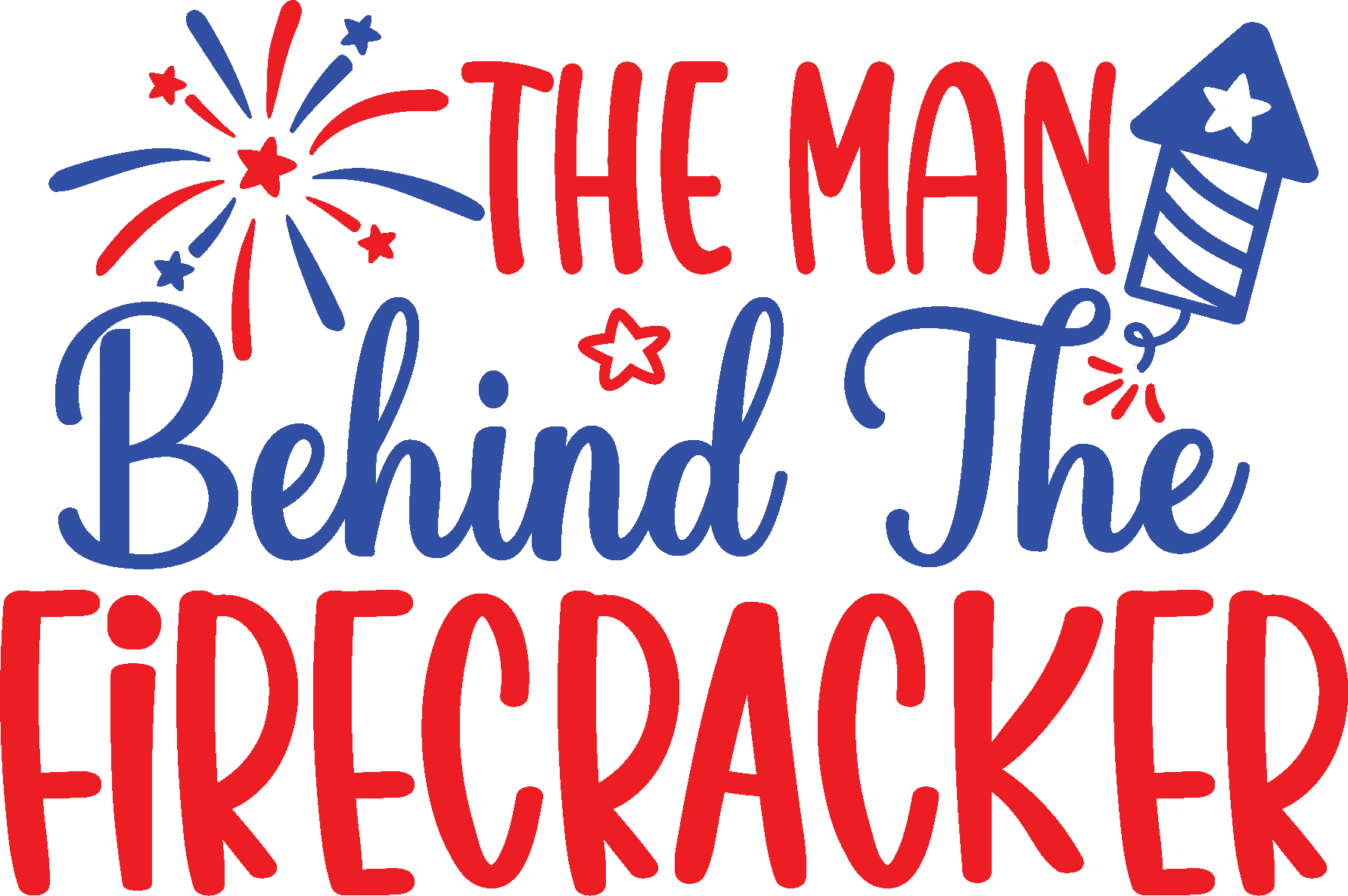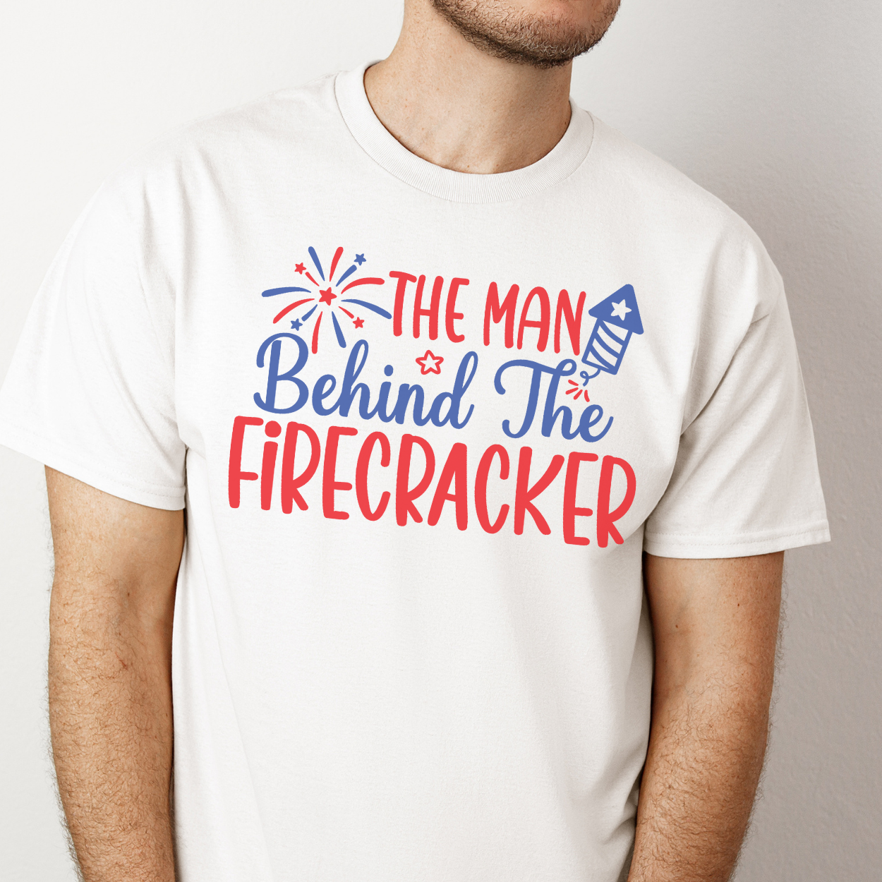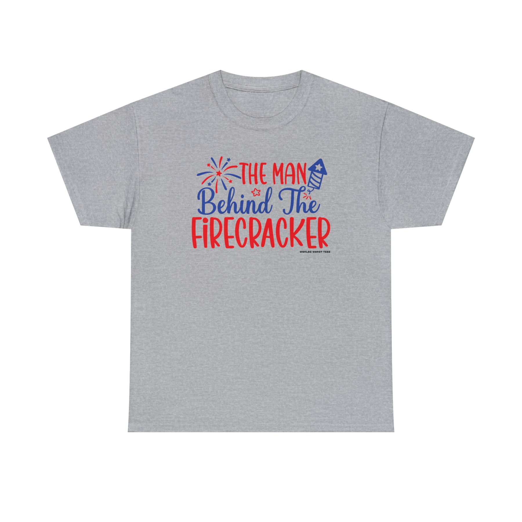 Man Behind the Firecracker Tee: Unisex heavy cotton t-shirt with red and blue text and fireworks design. Classic fit, ribbed knit collar, no side seams. Sizes S-5XL. Ideal staple for casual fashion.