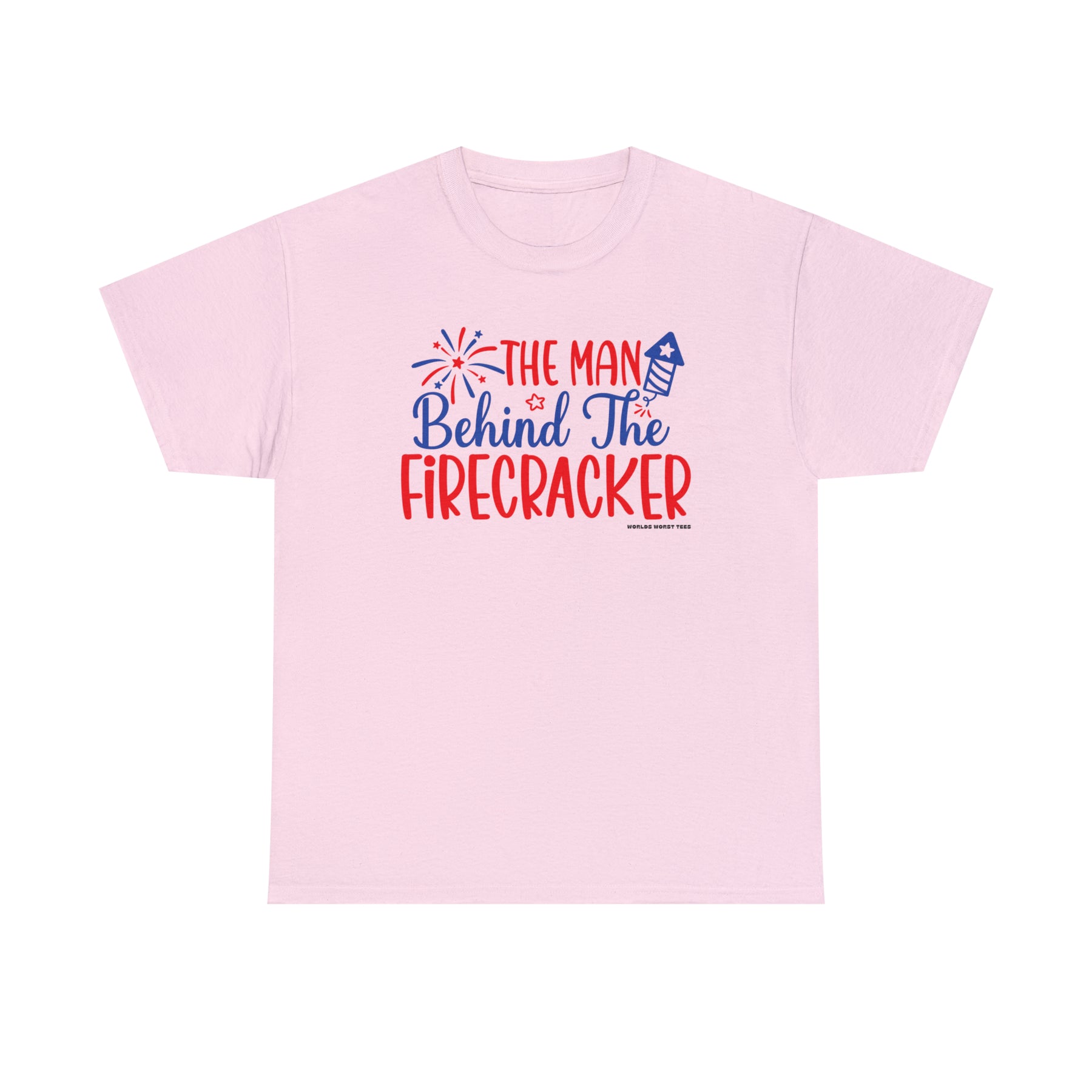 Man Behind the Firecracker Tee: Unisex heavy cotton t-shirt with red and blue text on pink background. Classic fit, ribbed knit collar, no side seams. Ideal staple for casual fashion.