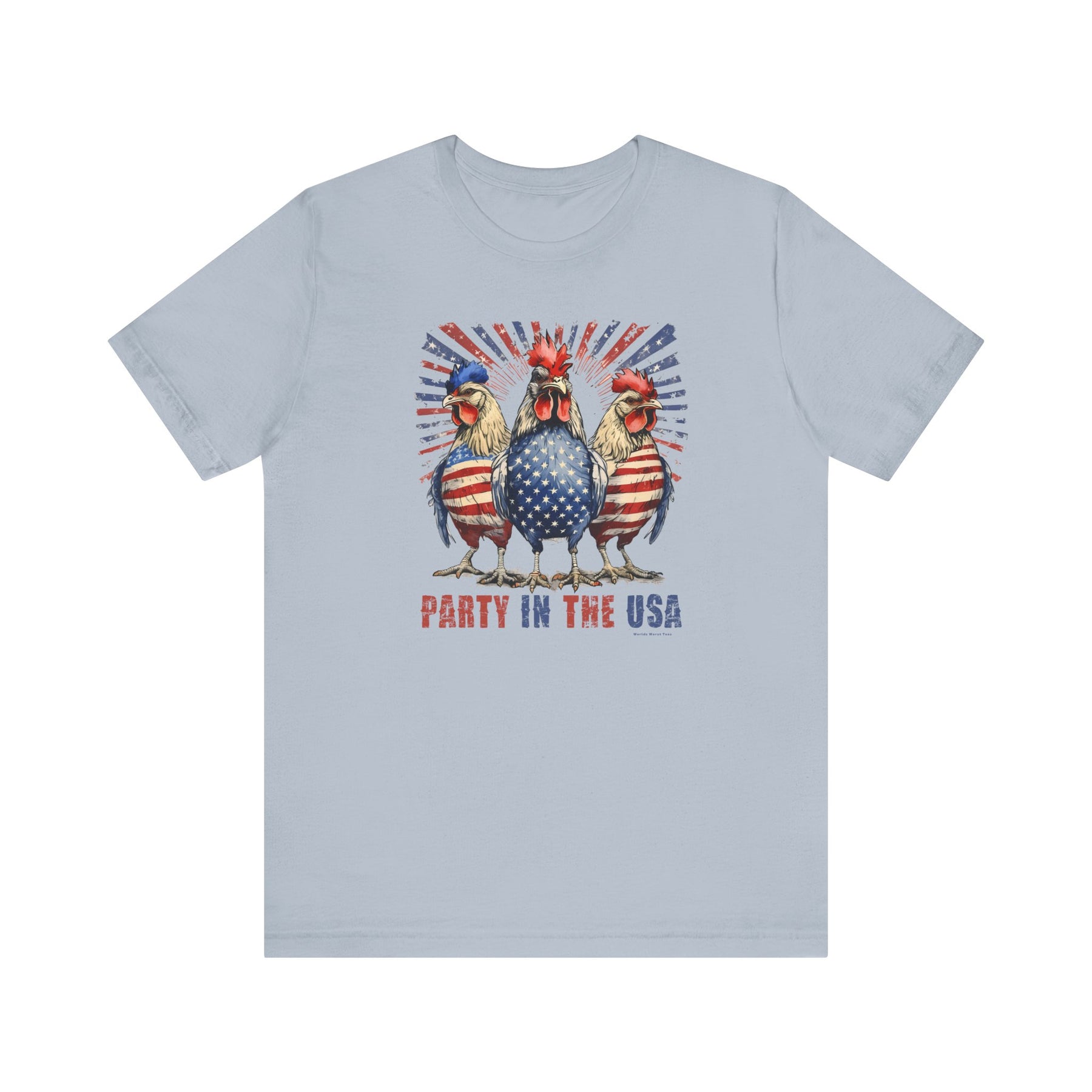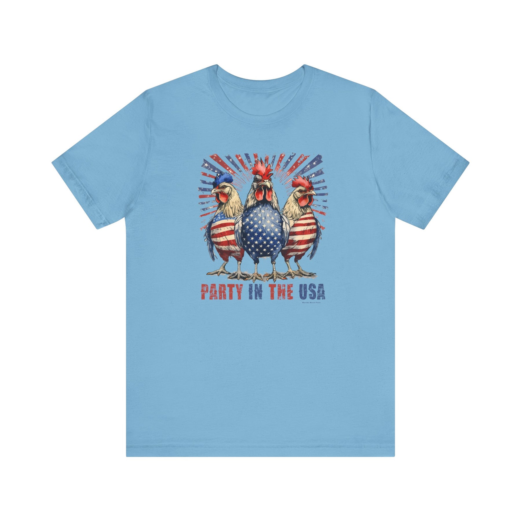 A blue Party In the USA Tee featuring three chickens, made of 100% Airlume combed cotton. Retail fit with ribbed knit collar, taping on shoulders, and tear away label. Sizes XS to 3XL.