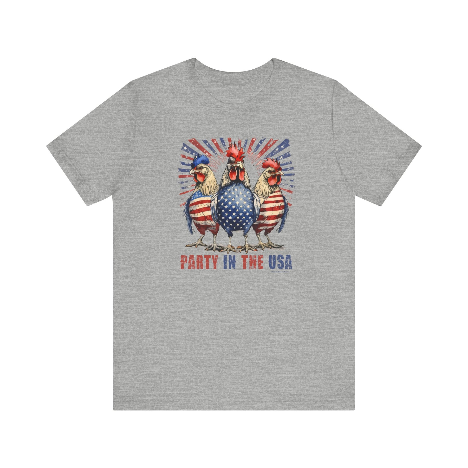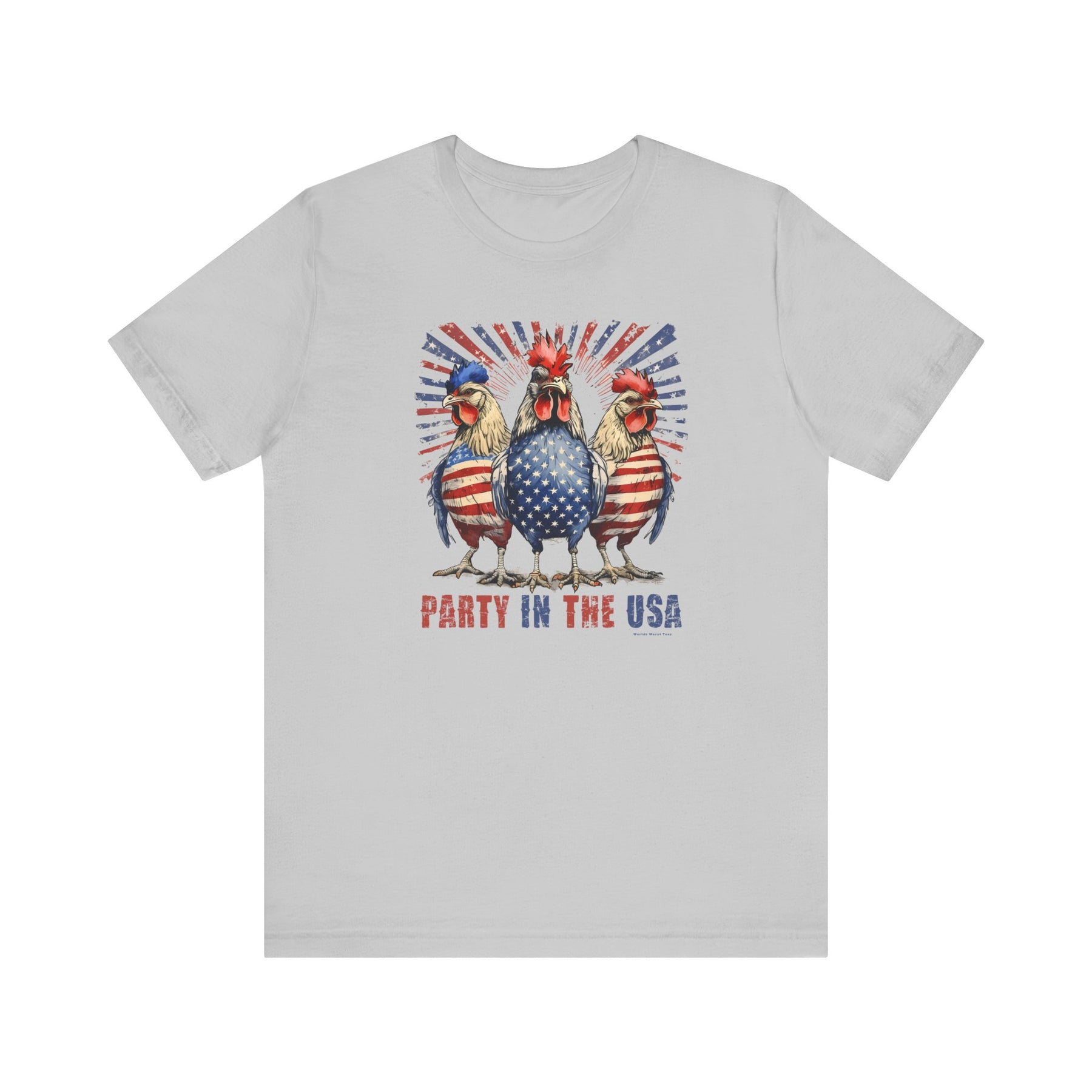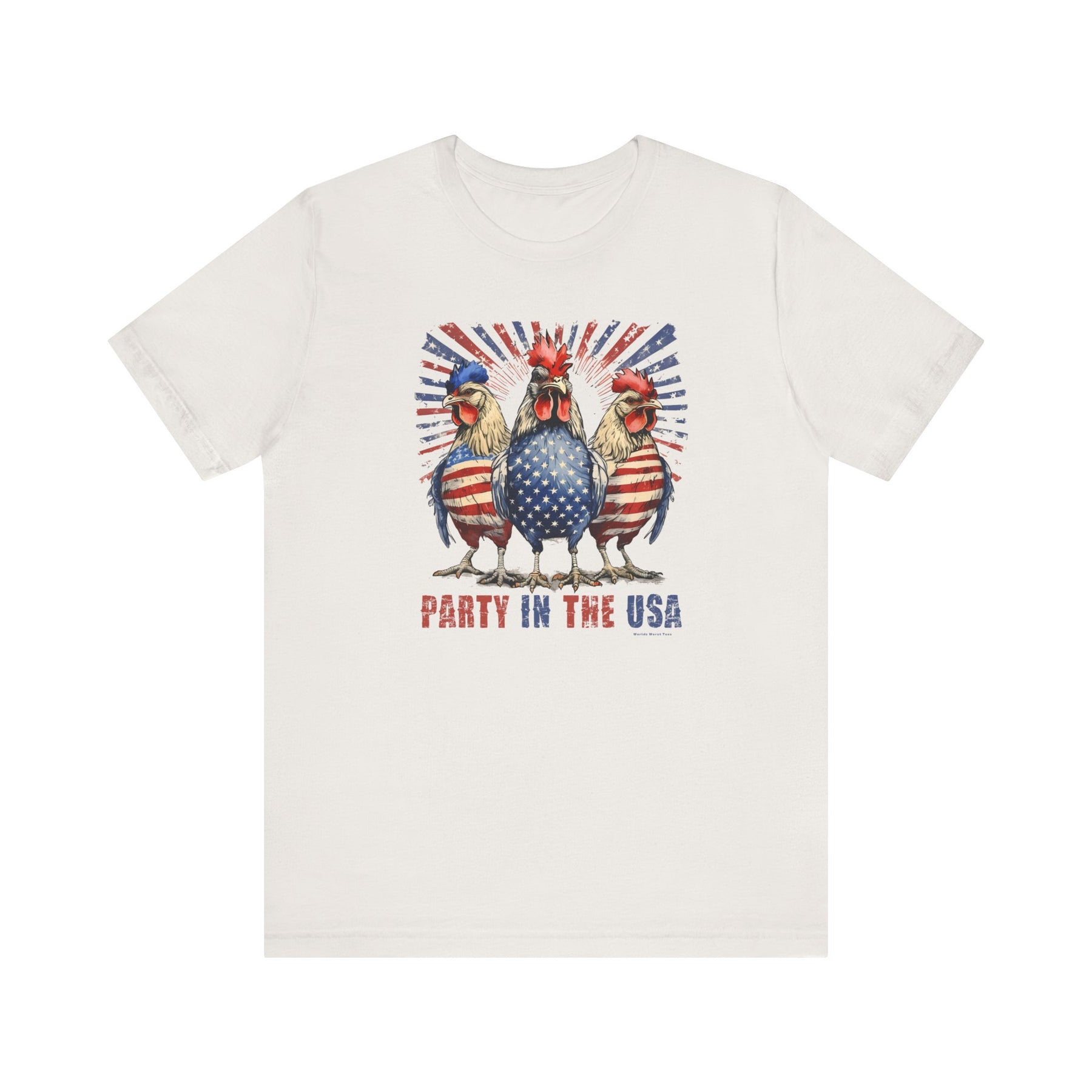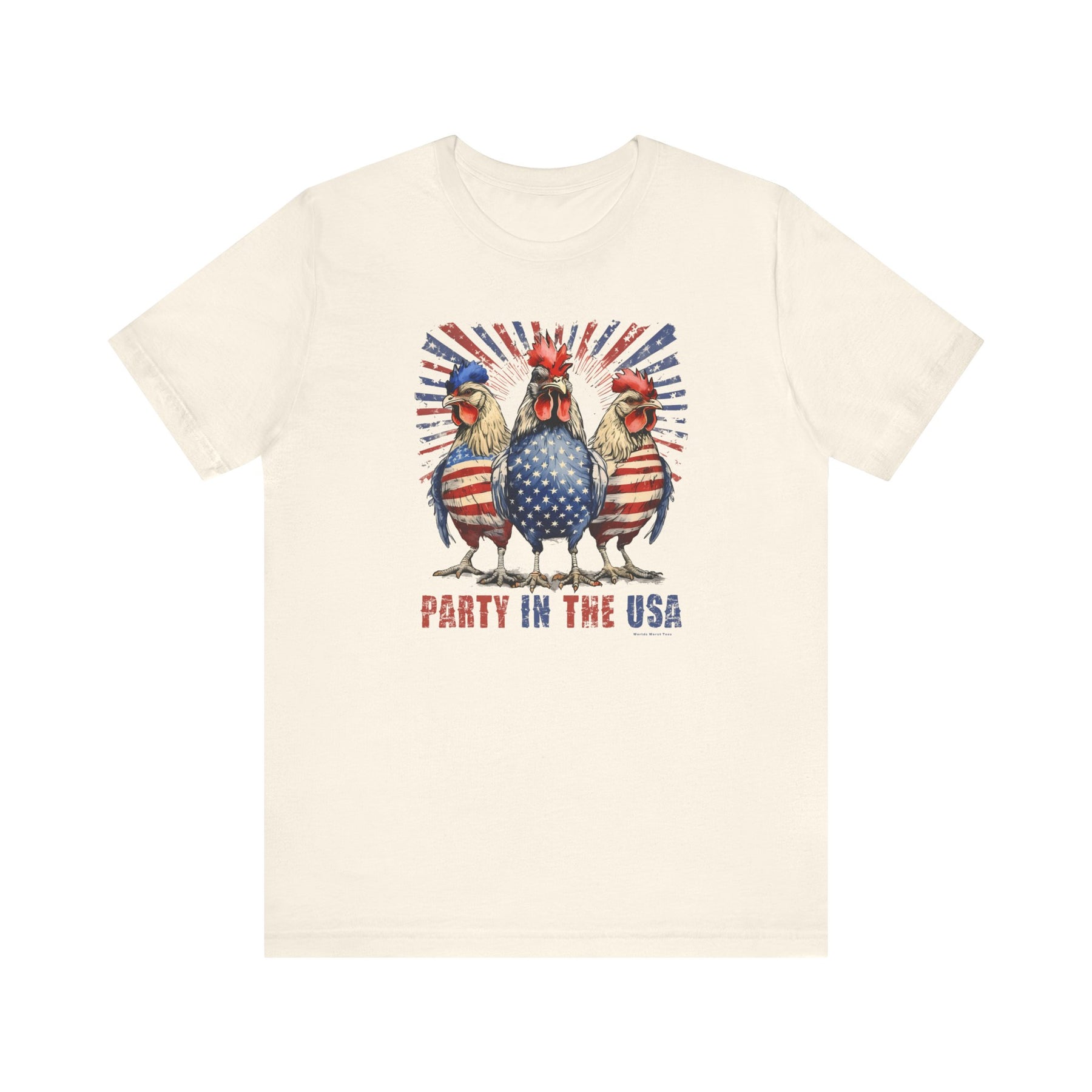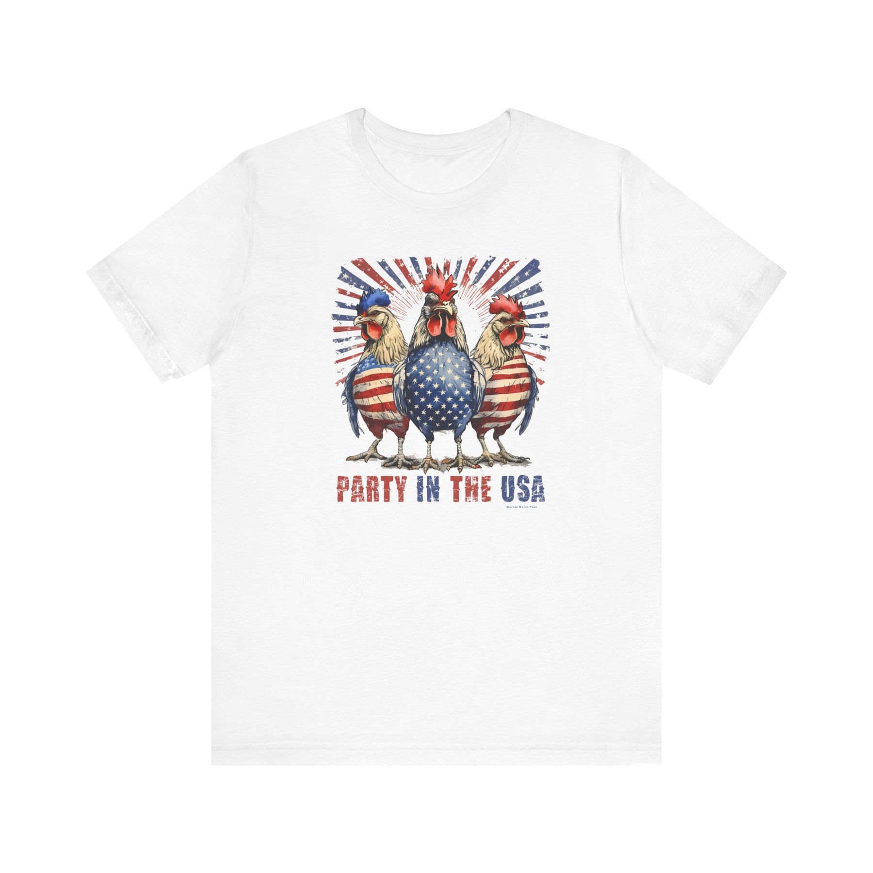 A Party In the USA Tee featuring a fun chicken design on a soft, 100% cotton jersey shirt. Unisex fit with ribbed knit collars, taping on shoulders, and dual side seams for durability.
