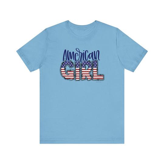 A classic American Girl Tee featuring red, white, and blue graphics with stars and stripes. Unisex jersey tee made of 100% Airlume combed cotton, light fabric, and ribbed knit collars for a retail fit.