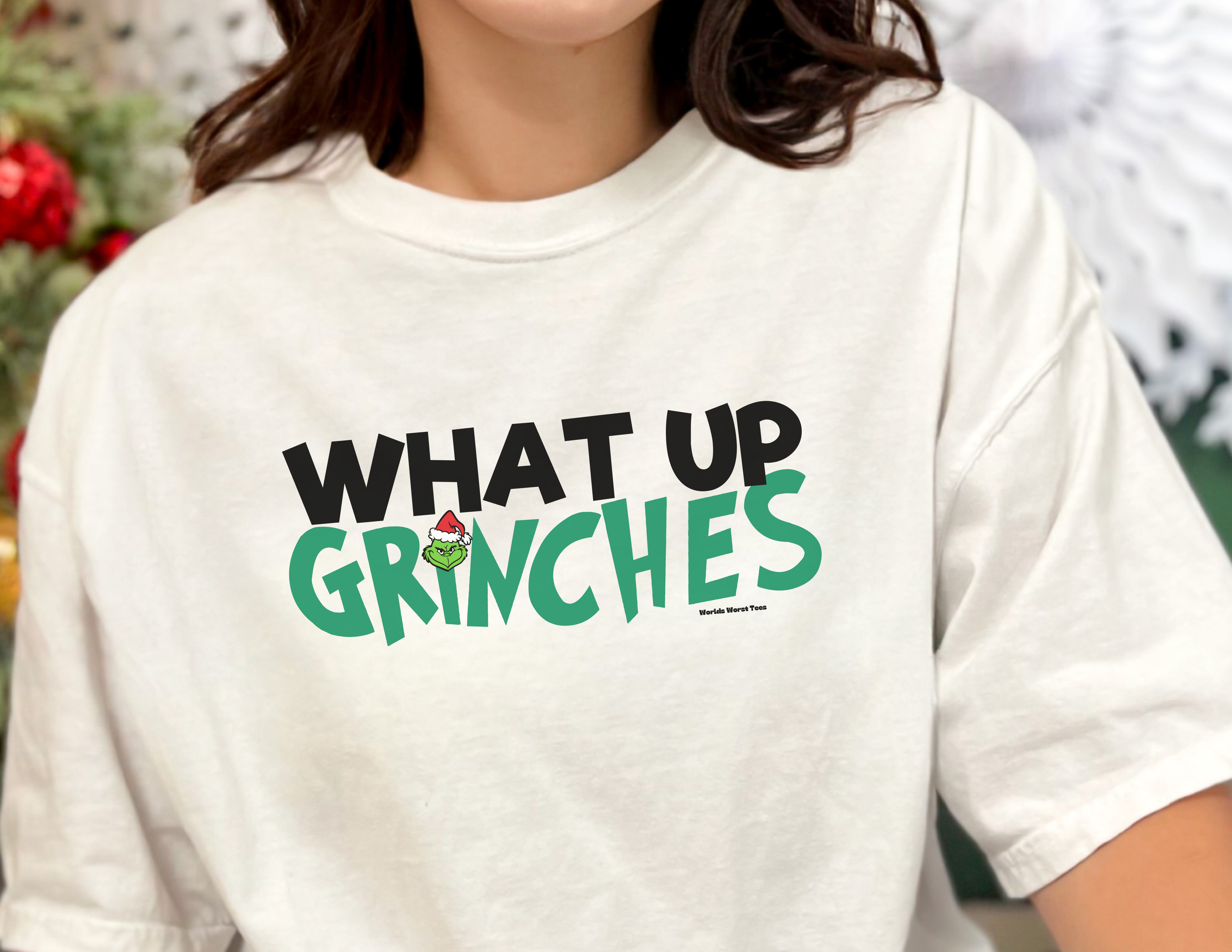 A green t-shirt with a playful What up Grinches logo, embodying comfort and style. Unisex, ring-spun cotton blend with a relaxed fit and rolled-forward shoulder. From Worlds Worst Tees.