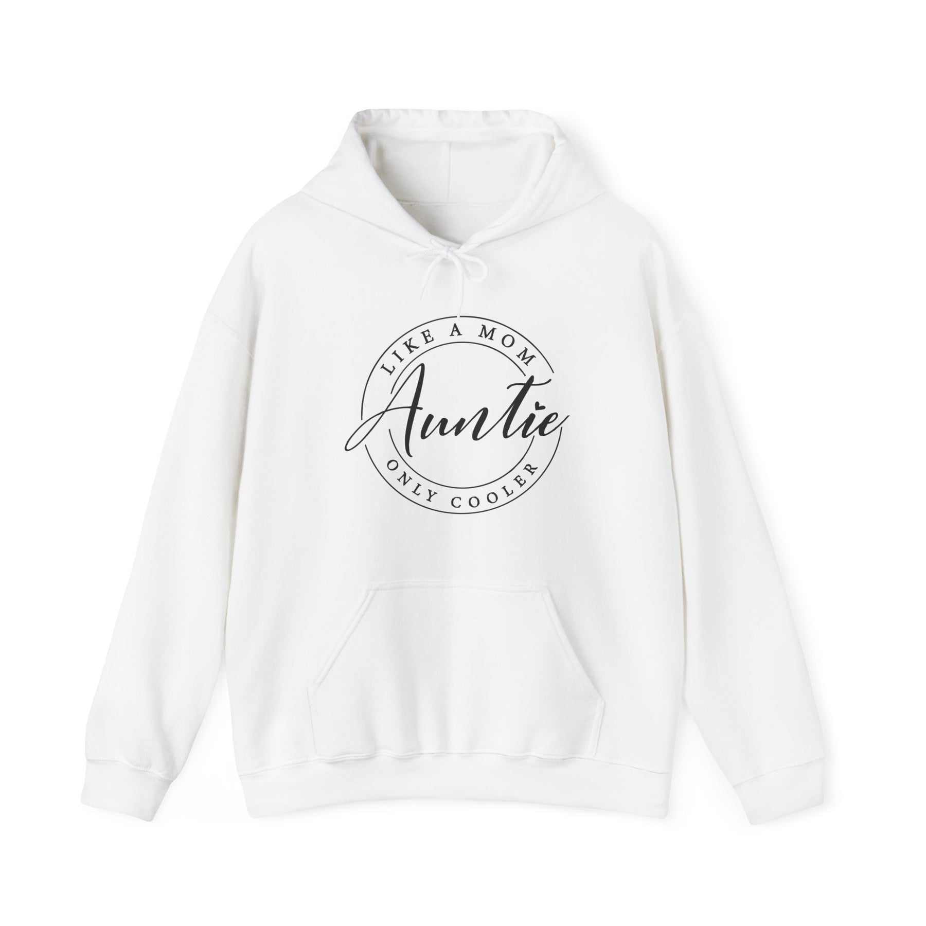 Auntie Hoodie: White sweatshirt with bold black text, featuring a cozy kangaroo pocket and drawstring hood, ideal for comfort and style.