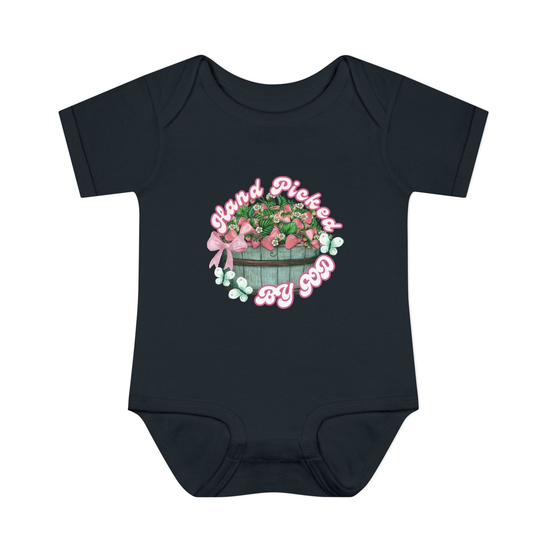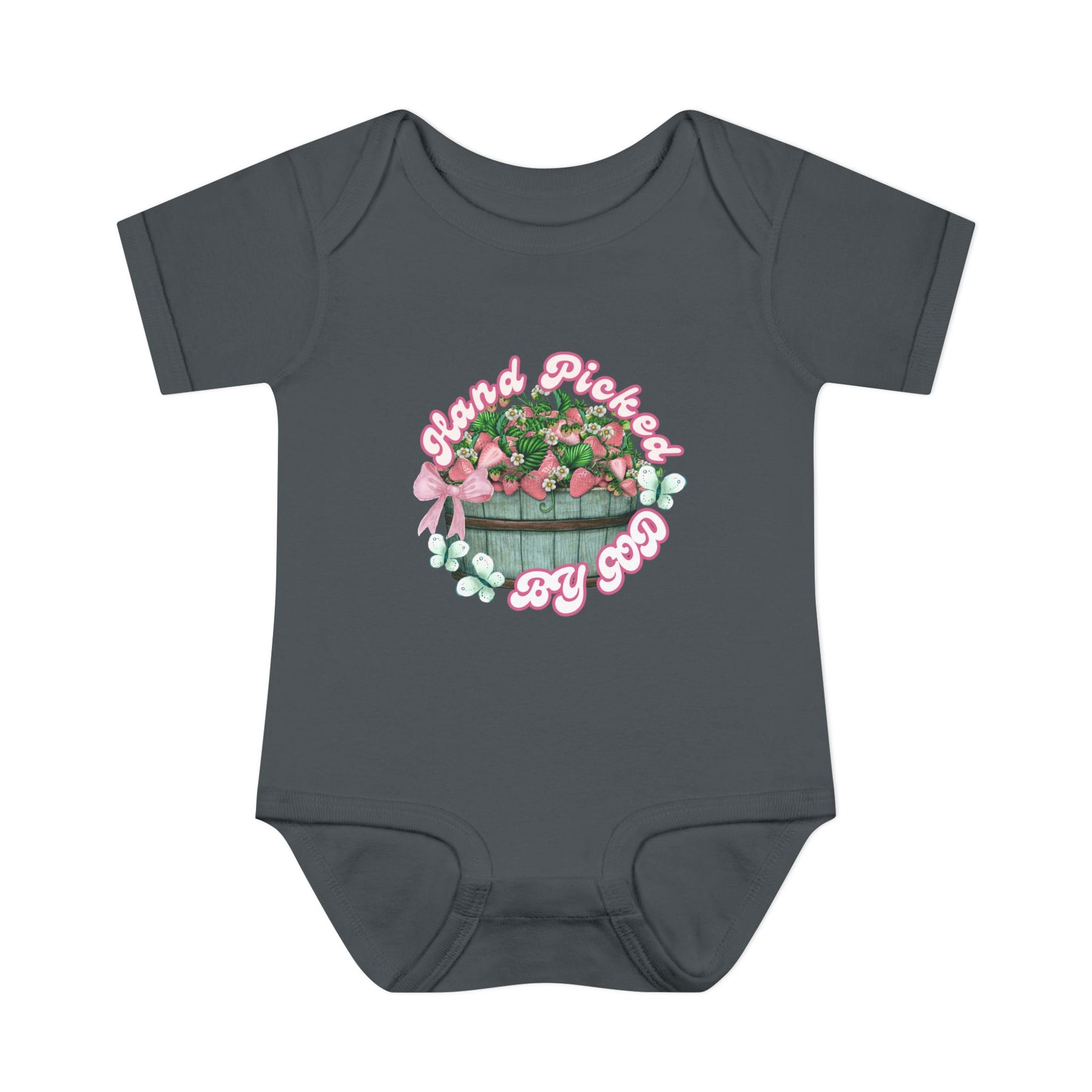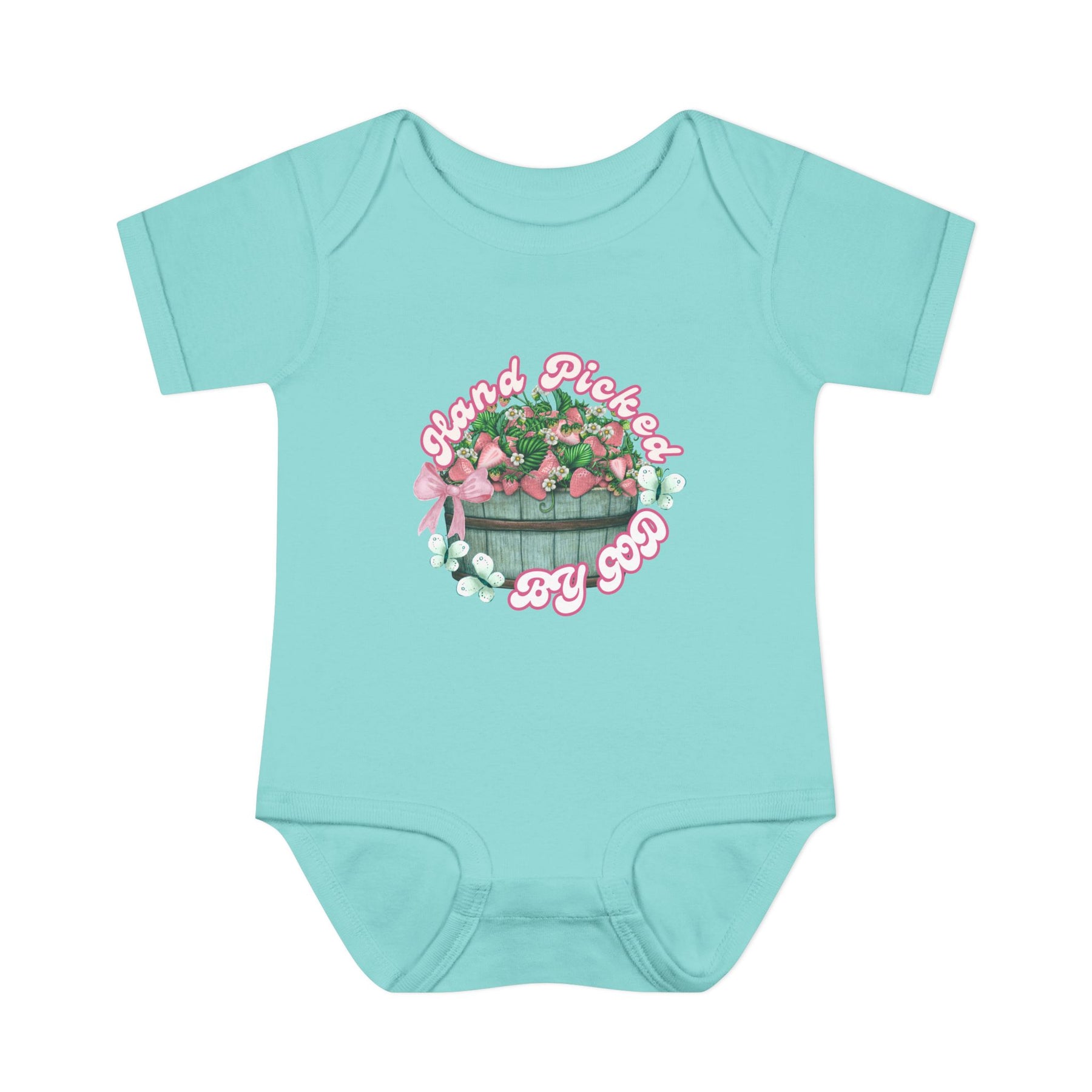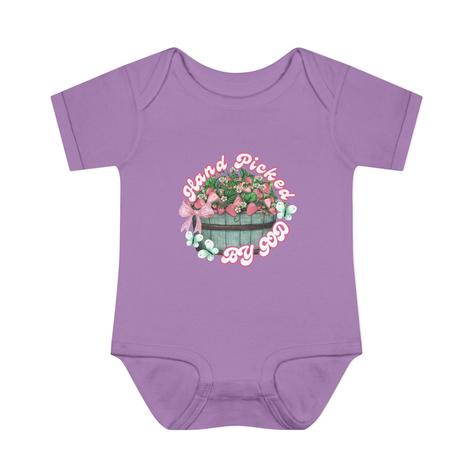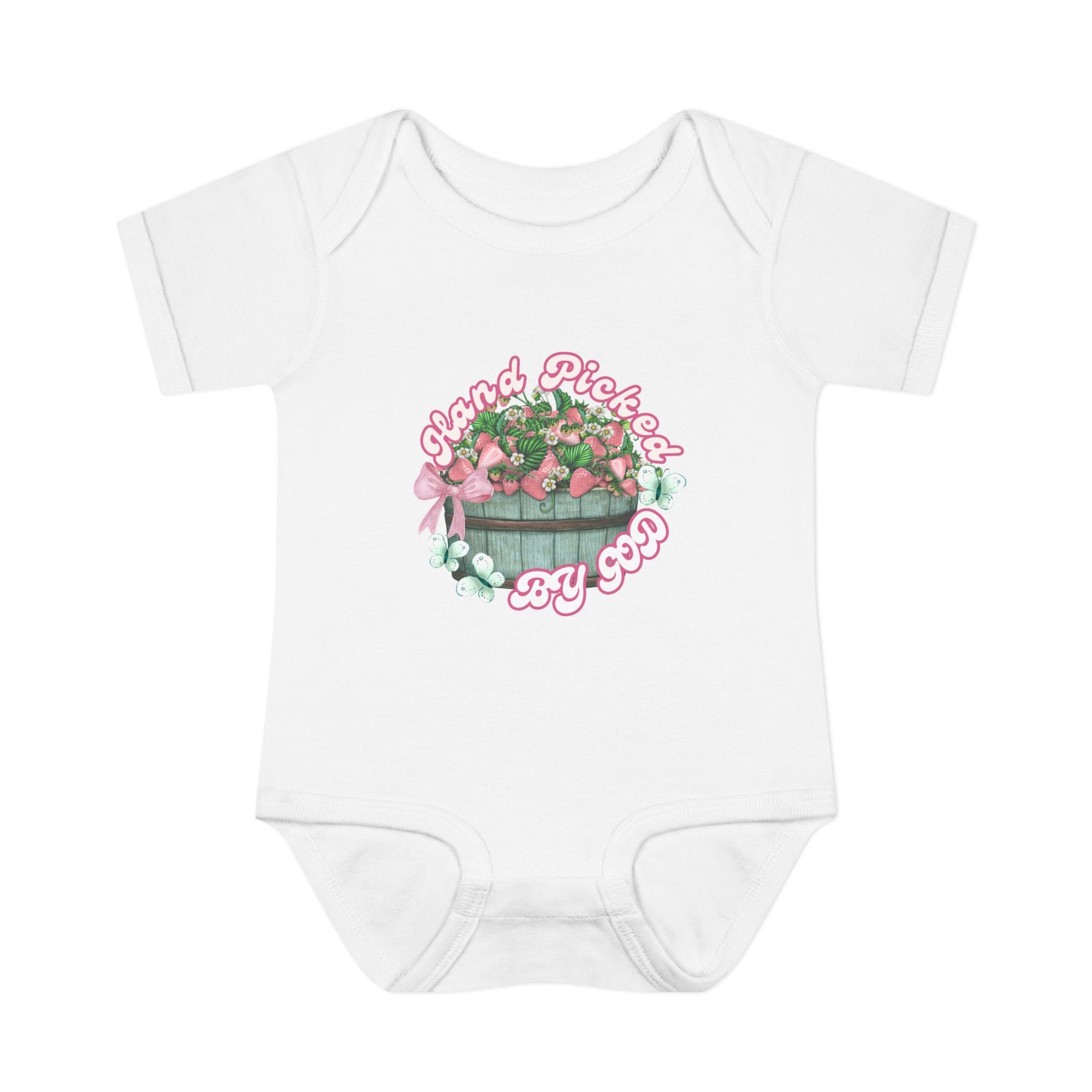 Infant unisex onesie with Hand Picked by GOD design, featuring lap shoulders and soft ring-spun cotton for comfort, suitable for fidgeting infants.