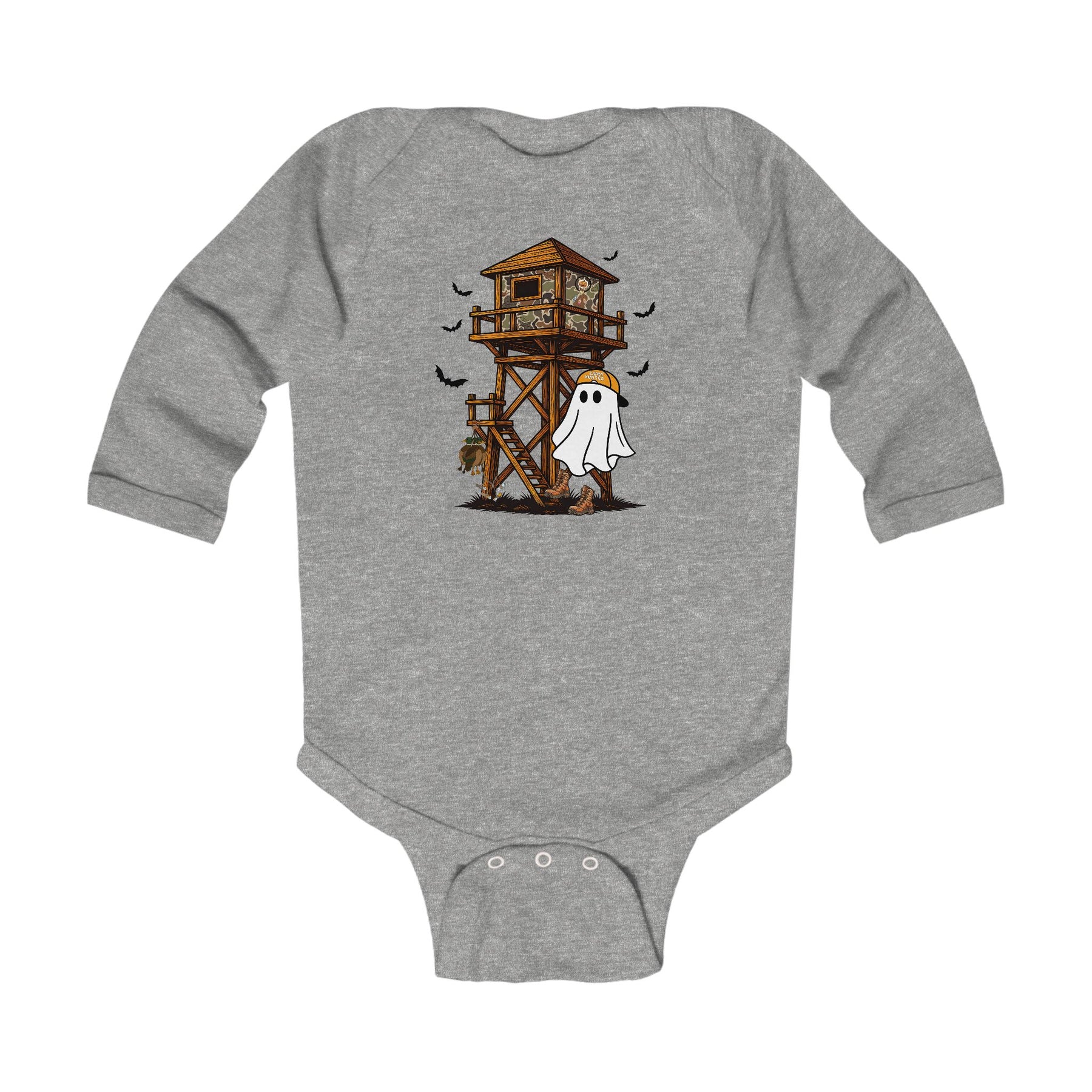 Heather-gray Ghost Hunter Long Sleeve Onesie with a camo deer stand, friendly ghost in an orange cap, and bats. Durable, soft fabric for babies.