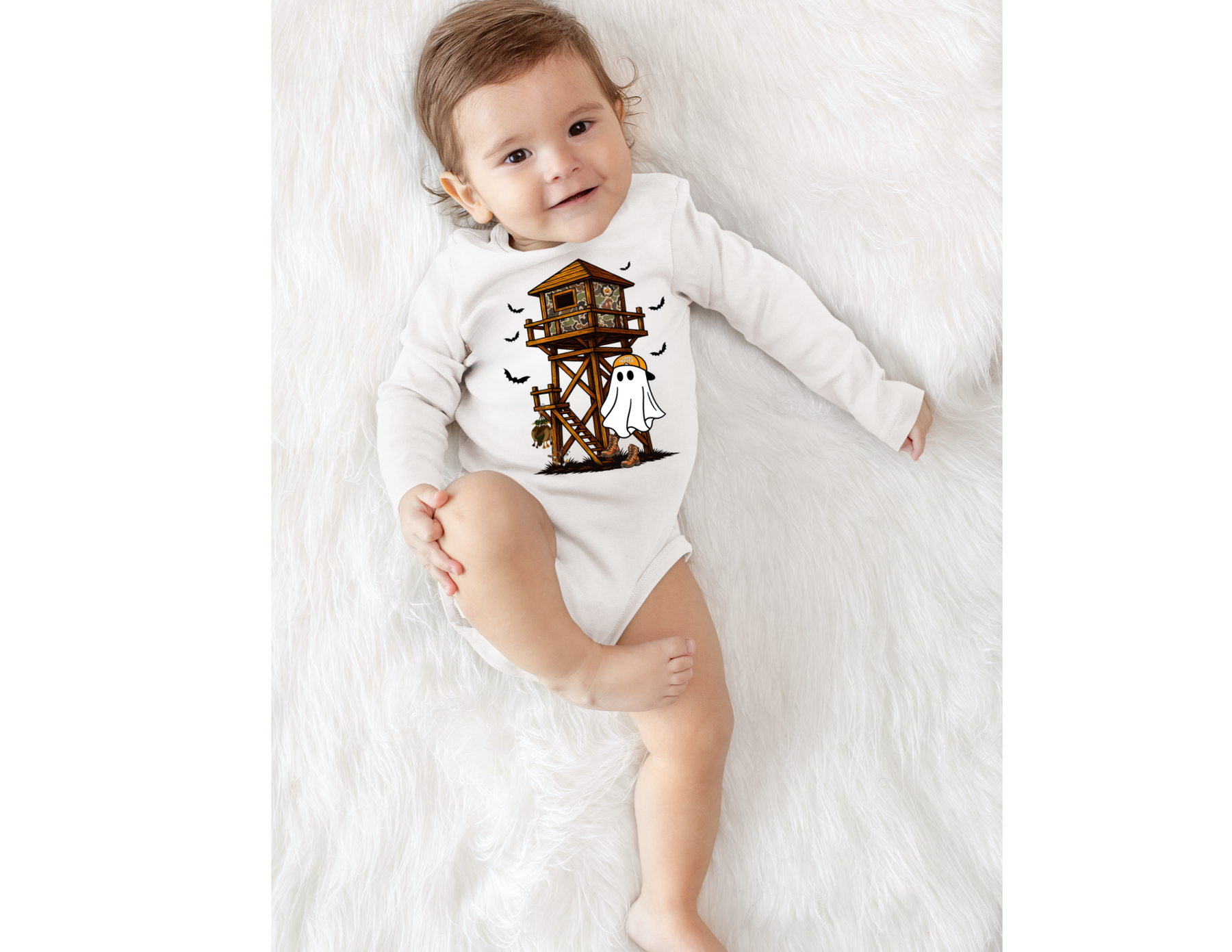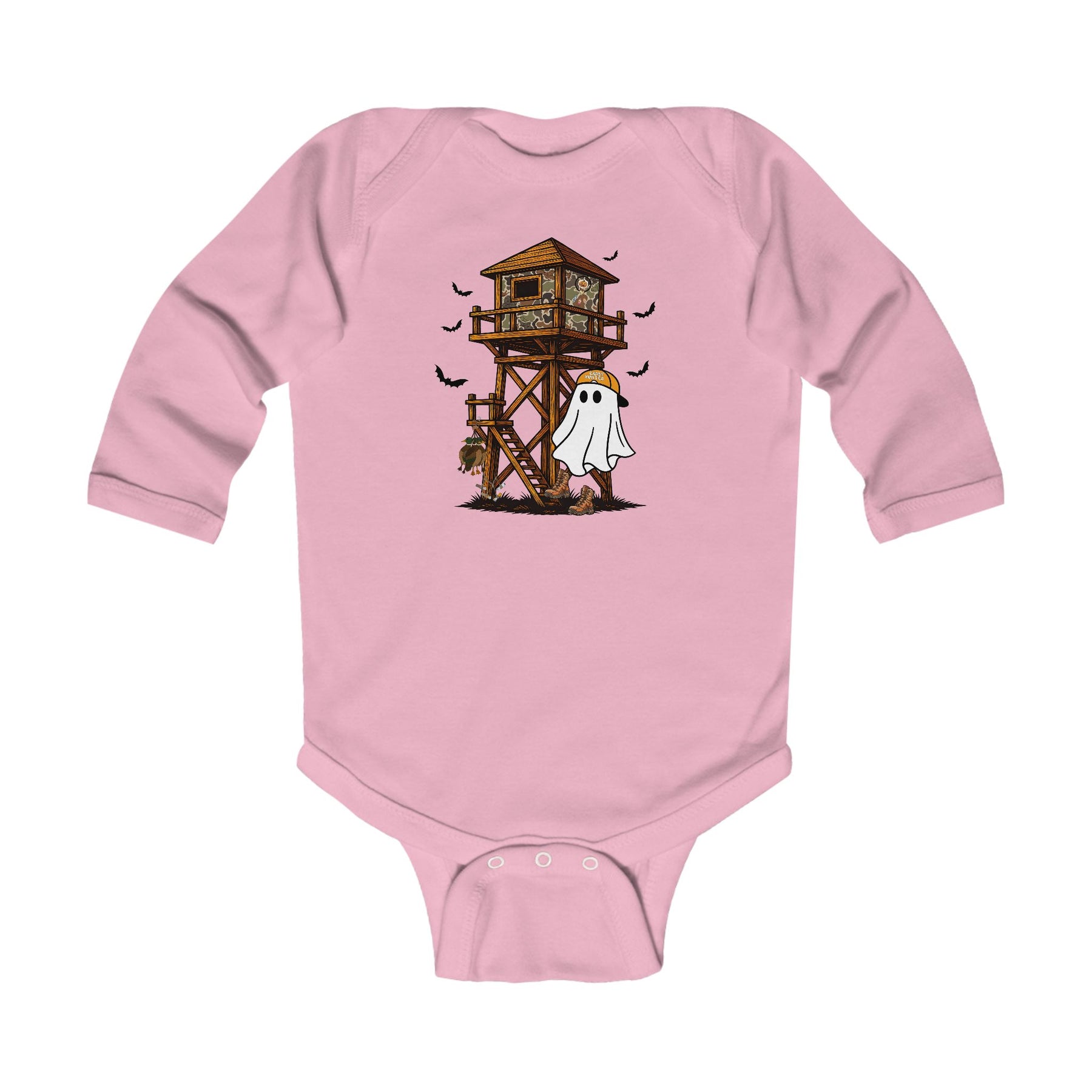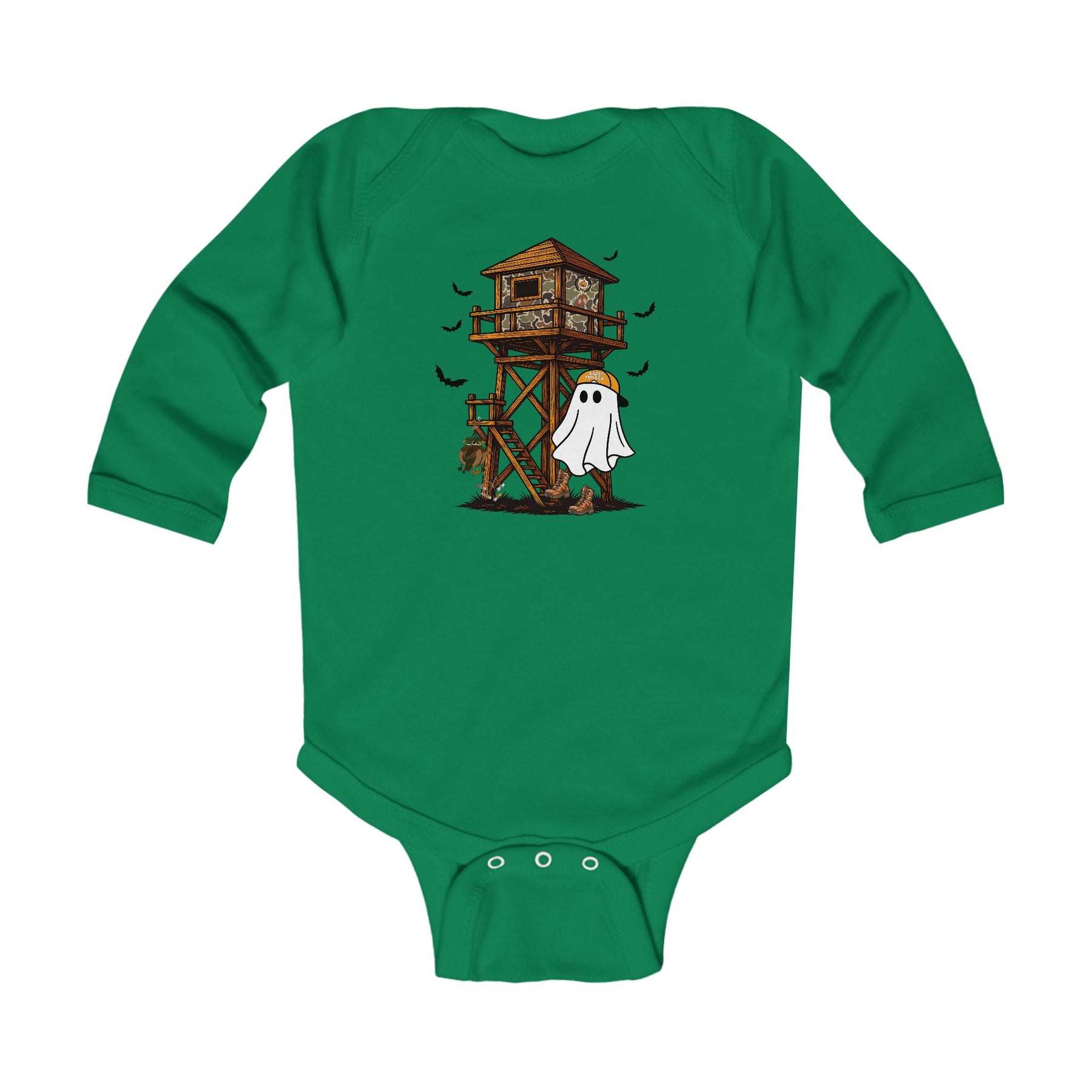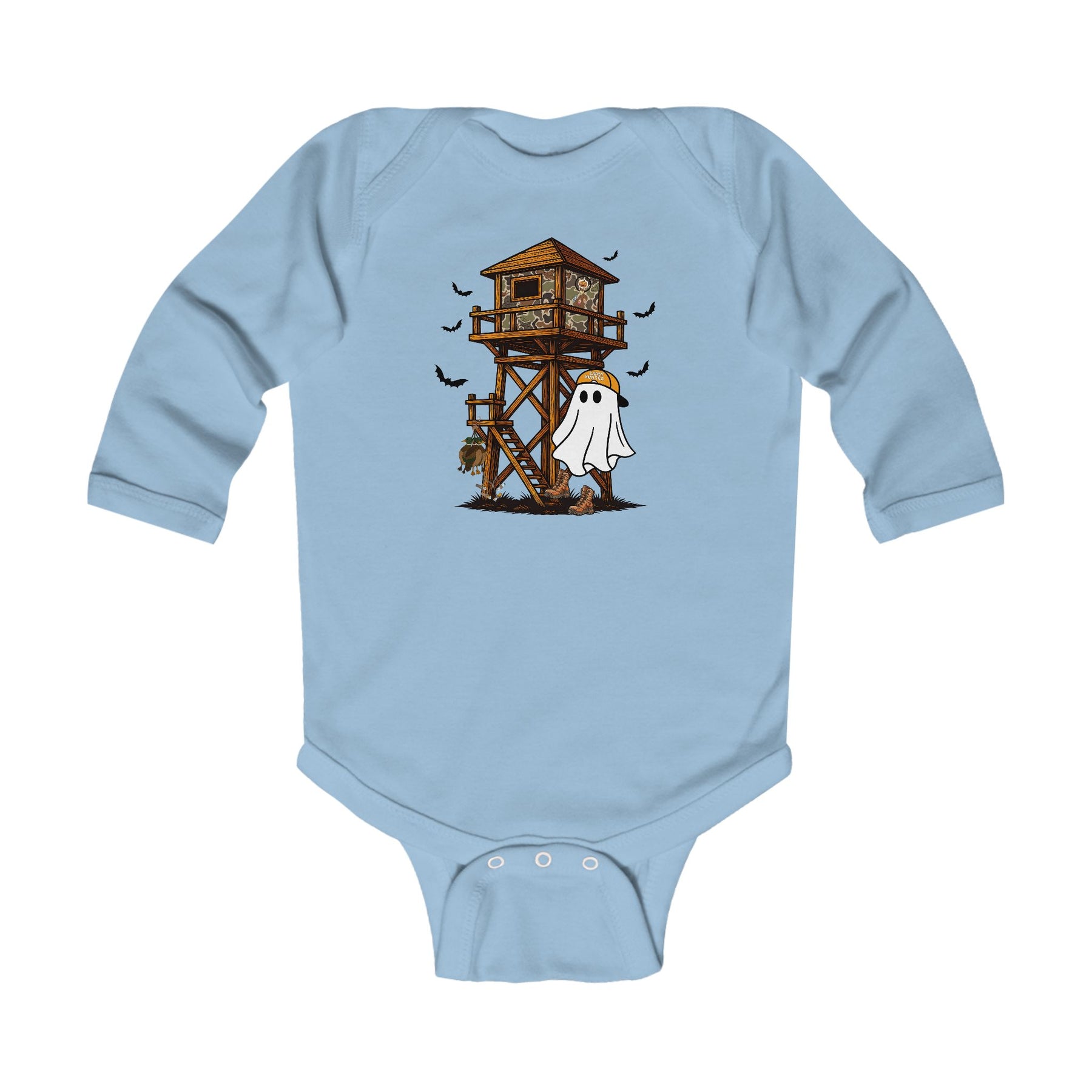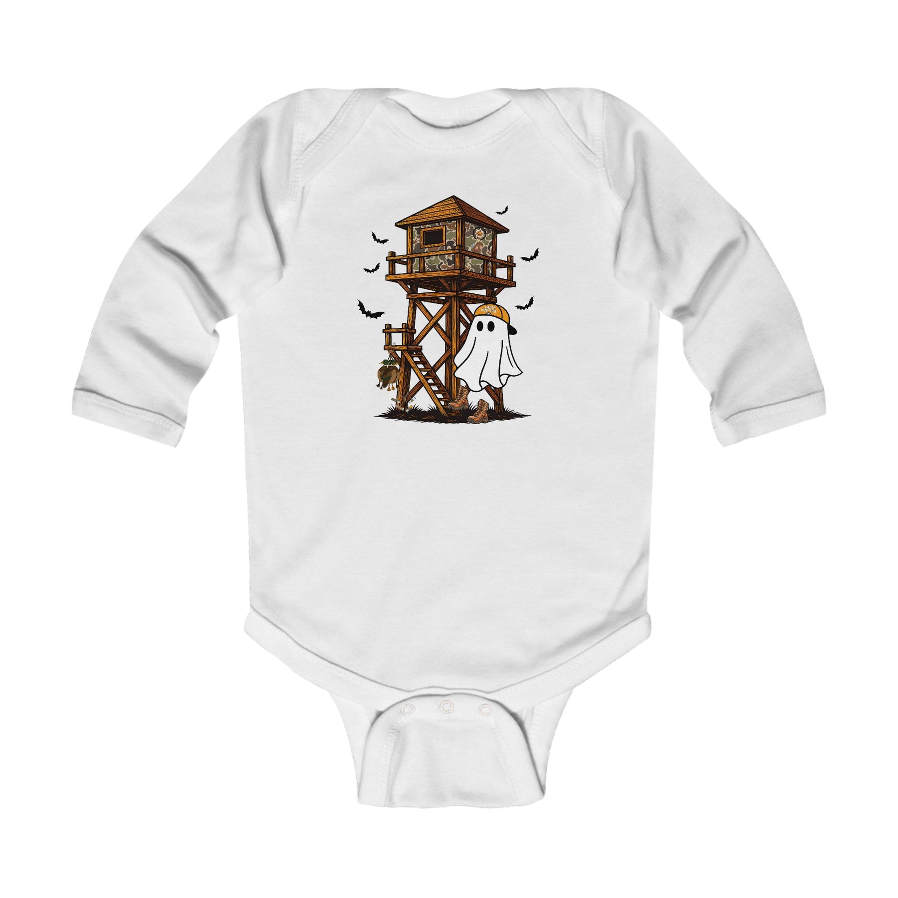 Ghost Hunter Long Sleeve Onesie features a playful hunting scene with a camo tree stand, bats, and a ghost in hunting gear, perfect for infants.