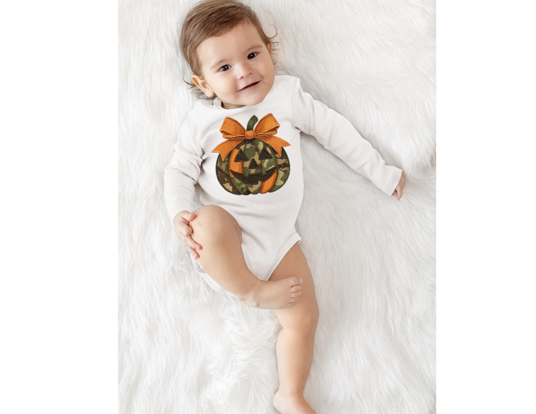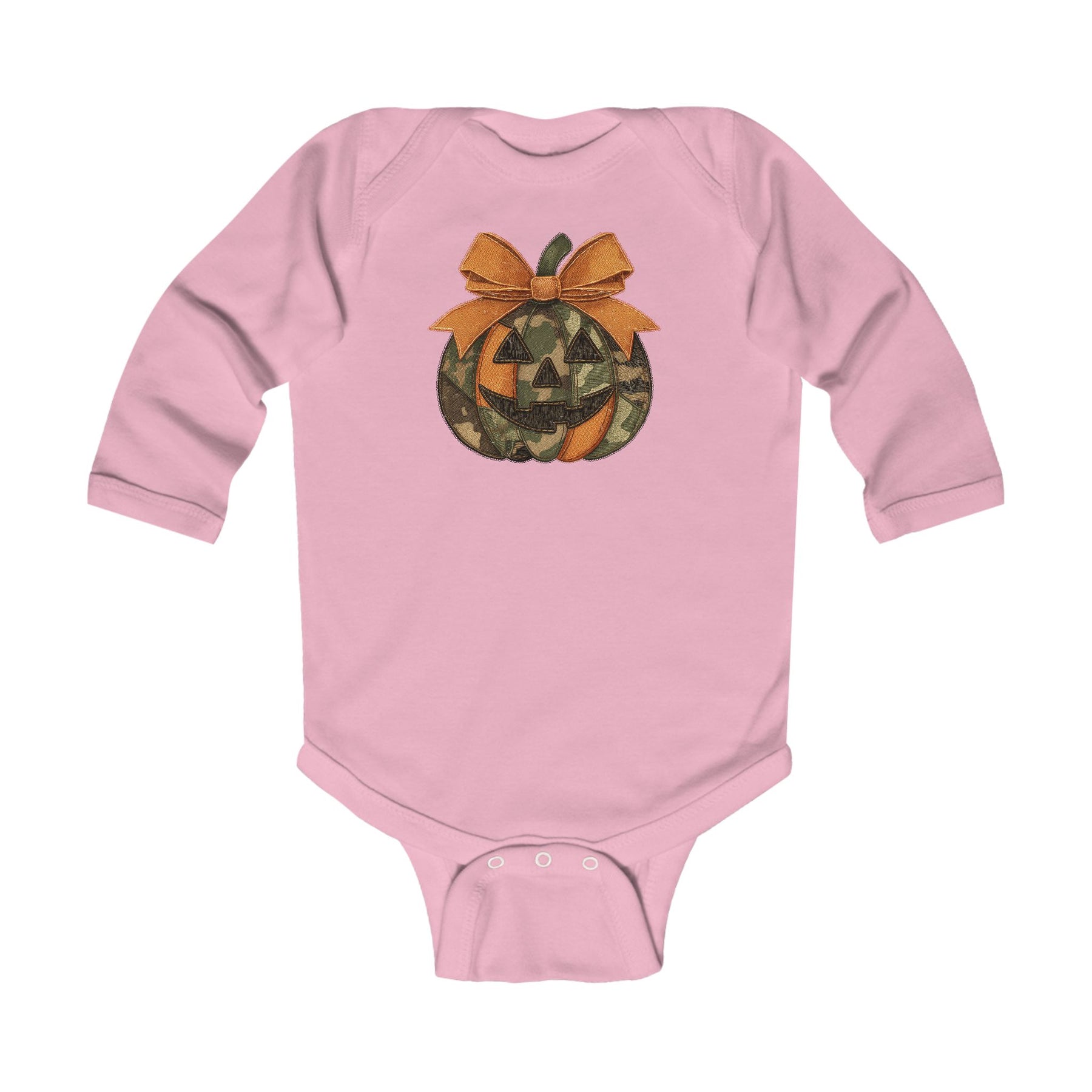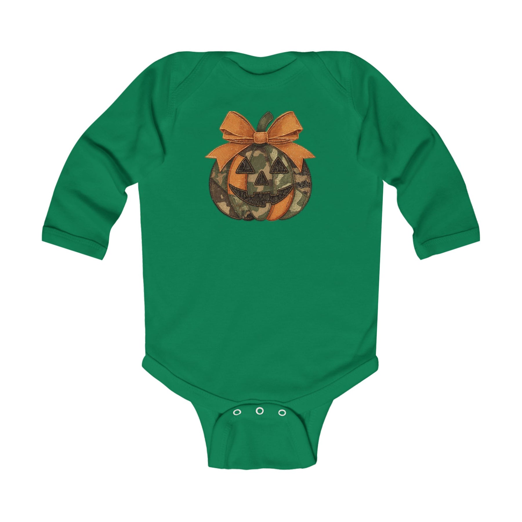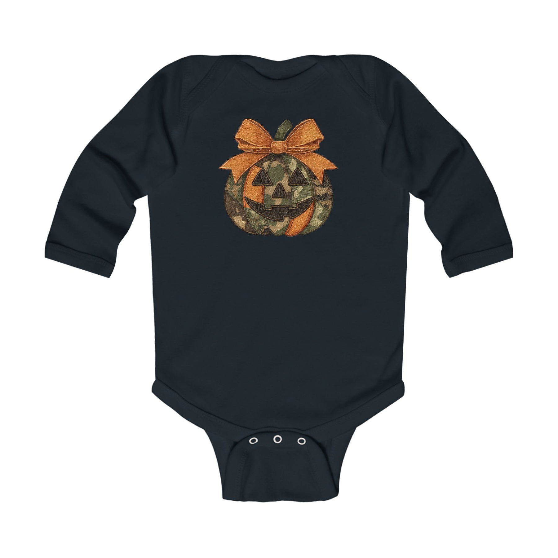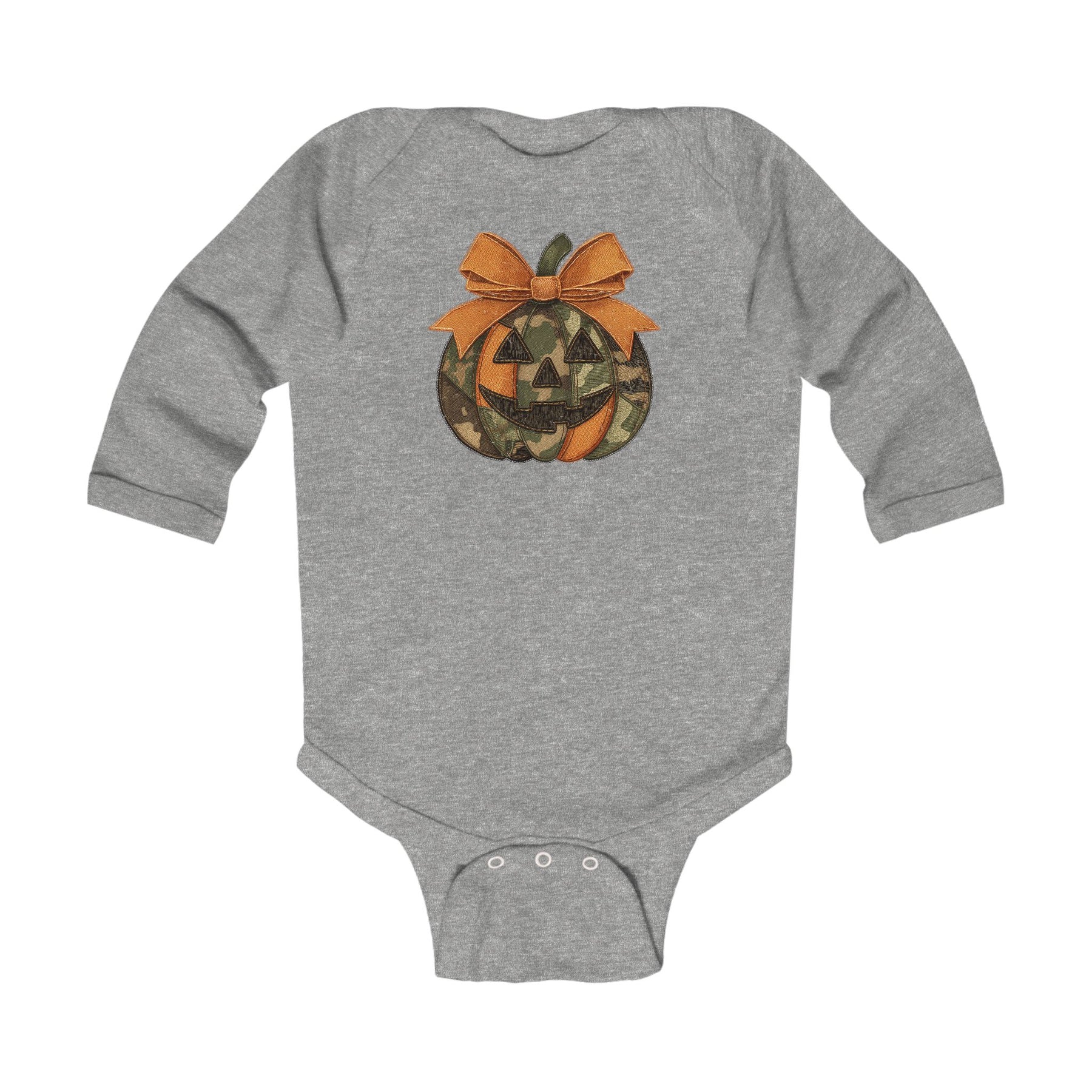 Jackie O Long Sleeve Onesie featuring a camouflage jack-o’-lantern with an orange bow, perfect for infants, combines durability with comfort and ease of changing.
