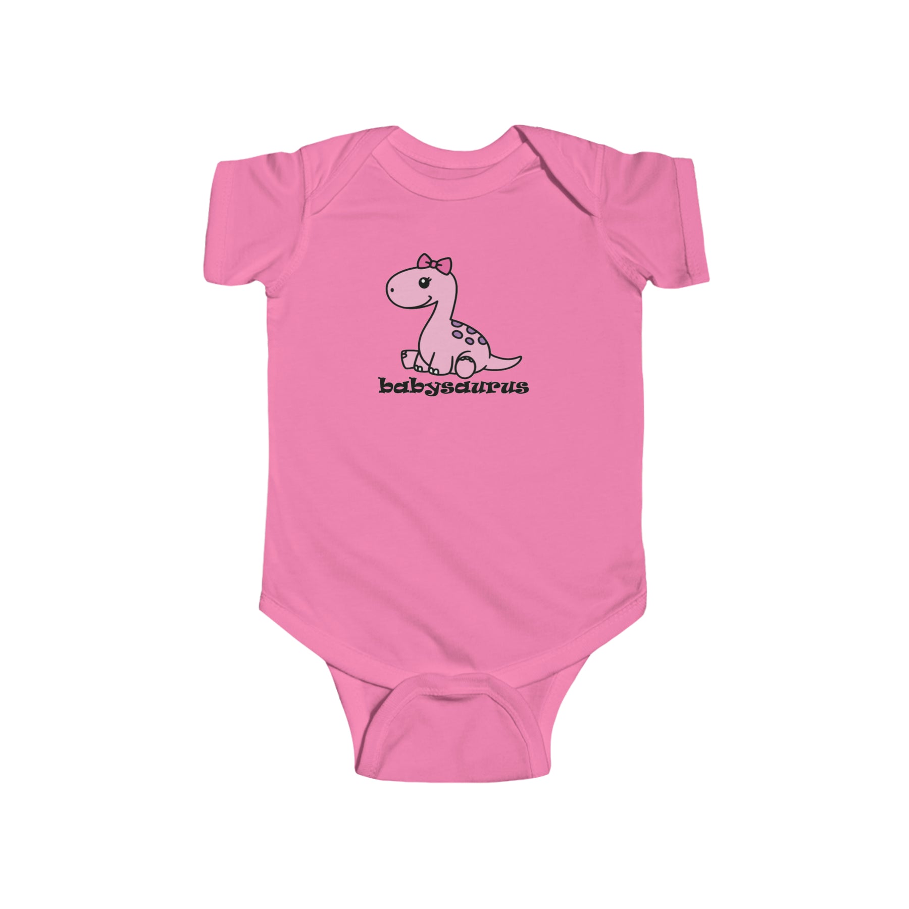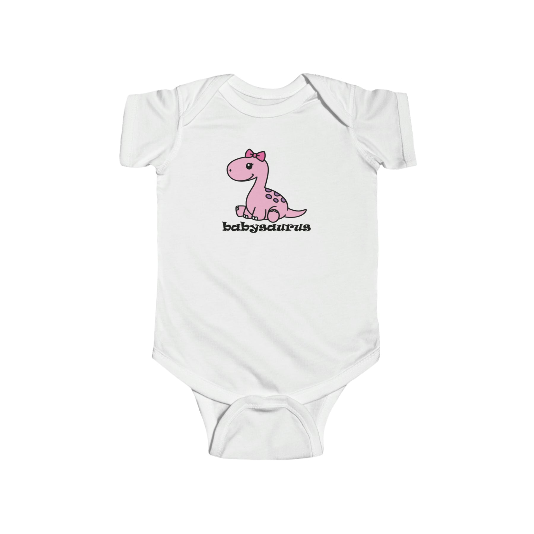 A durable and soft Babysaurus Girls Onesie, featuring a cartoon dinosaur design on a baby girl shirt. Made of 100% cotton fabric, with ribbed bindings and plastic snaps for easy changing access.