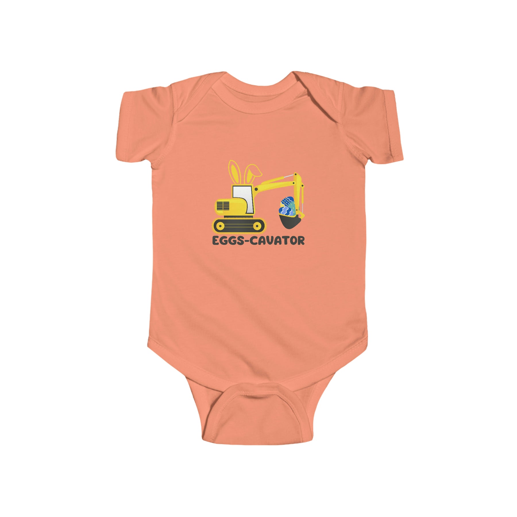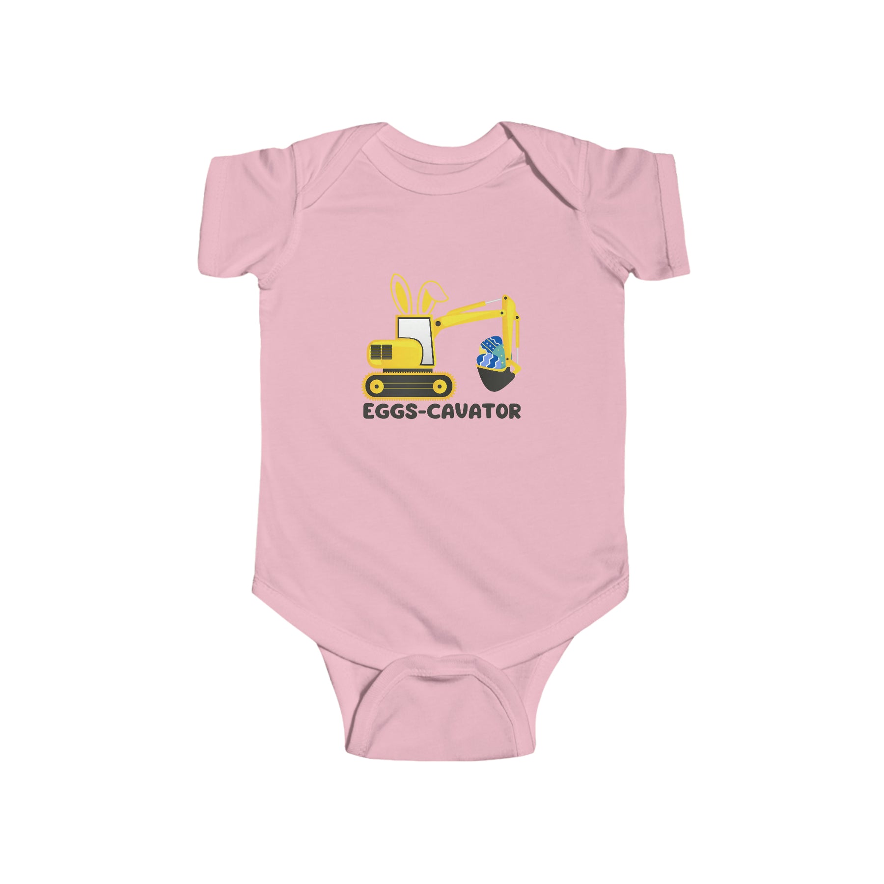 A durable and soft infant fine jersey bodysuit featuring an Eggs-Cavator design. 100% cotton fabric, ribbed knitting for durability, plastic snaps for easy changing. Light fabric, tear away label.