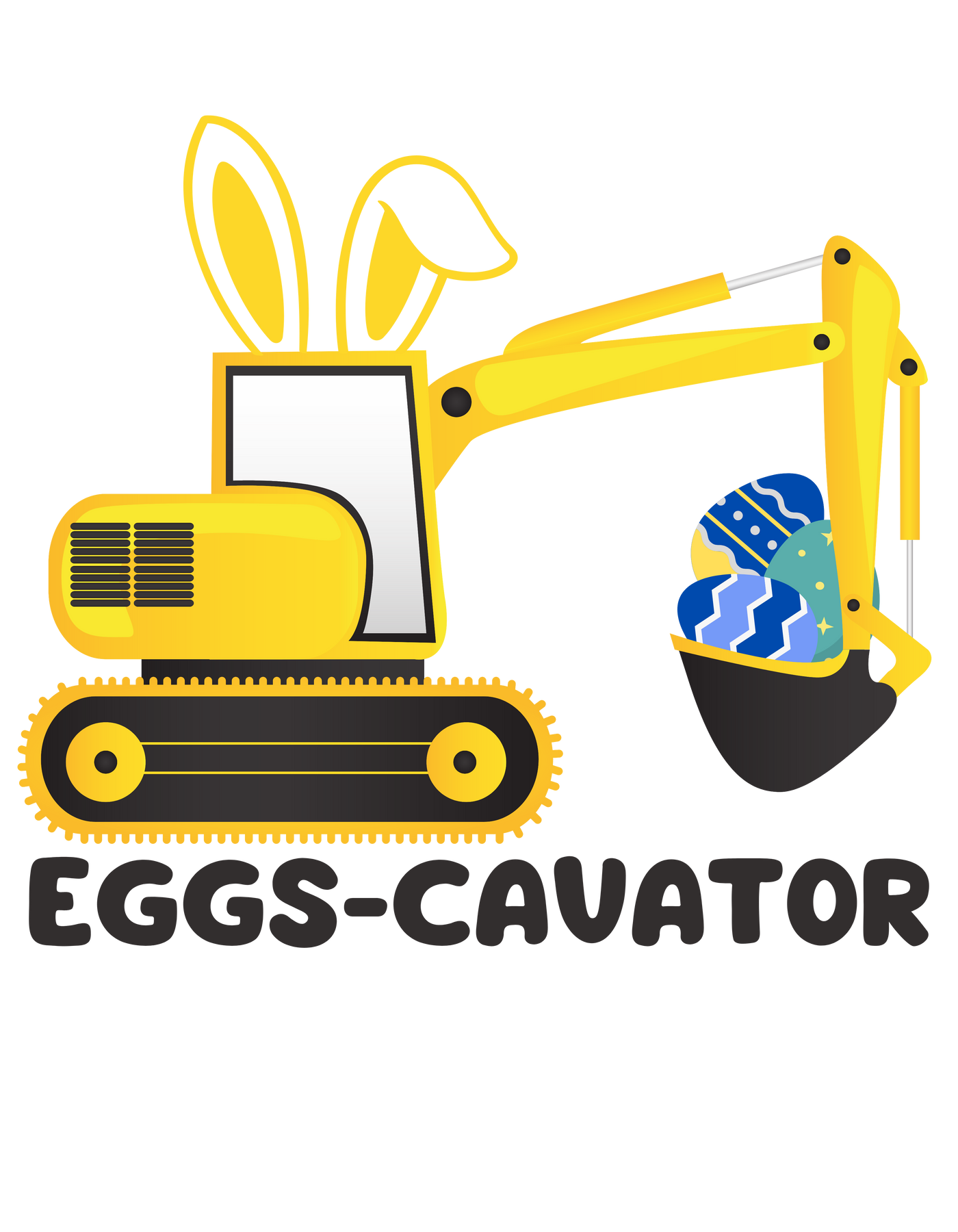 A baby bodysuit featuring a cartoon bulldozer with bunny ears and eggs, named Eggs-Cavator Onesie. Made of 100% cotton, light fabric, with ribbed knitting for durability and plastic snaps for easy changing access.