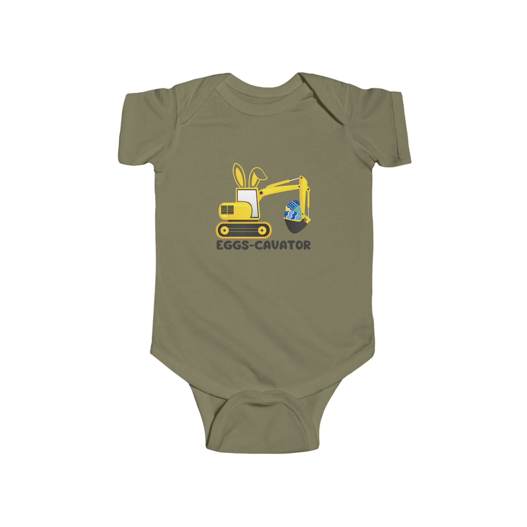 Infant fine jersey bodysuit featuring a yellow excavator and bunny design. Durable 100% cotton fabric with ribbed knit bindings and plastic snaps for easy changing. Eggs-Cavator Onesie by Worlds Worst Tees.