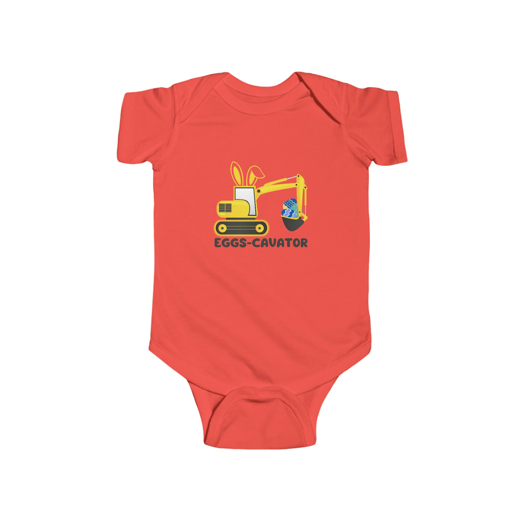A red baby bodysuit featuring a cartoon bulldozer and bunny, ideal for infants. Made of 100% cotton, with ribbed bindings for durability and plastic snaps for easy changing. Title: Eggs-Cavator Onesie.
