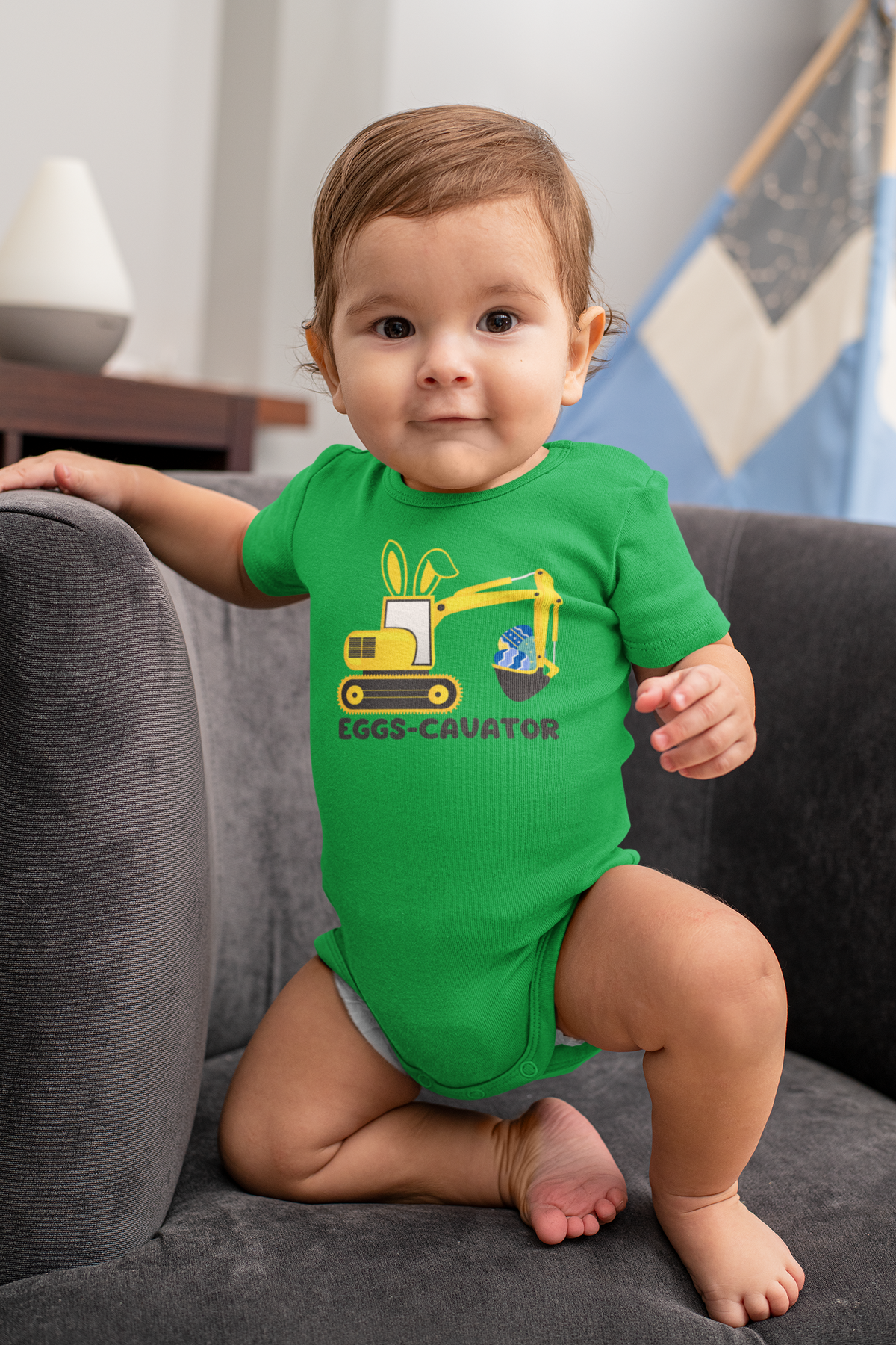 A baby in a green shirt wearing an Eggs-Cavator Onesie. Infant fine jersey bodysuit made of 100% cotton (fiber content may vary), with ribbed knitting for durability and plastic snaps for easy changing access.