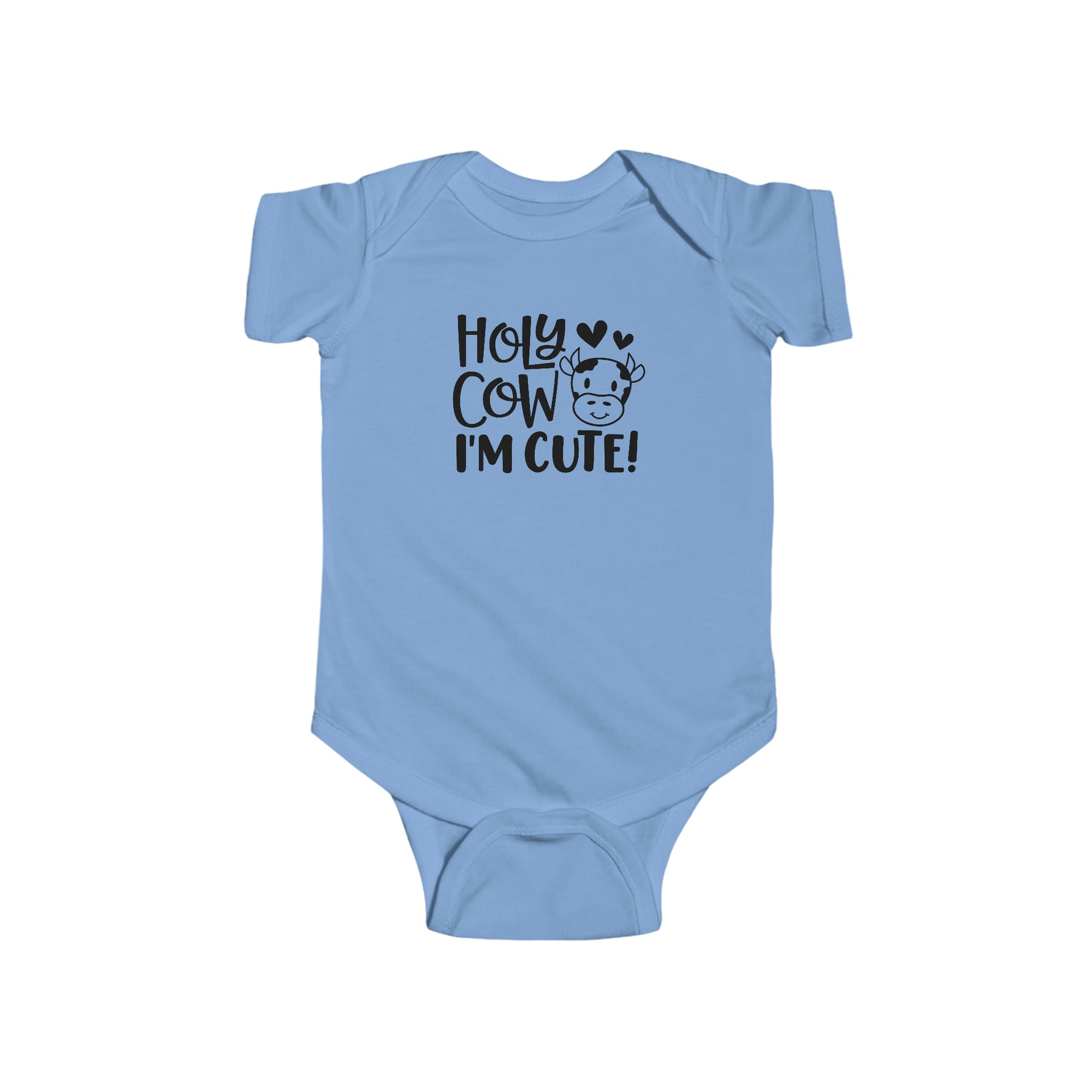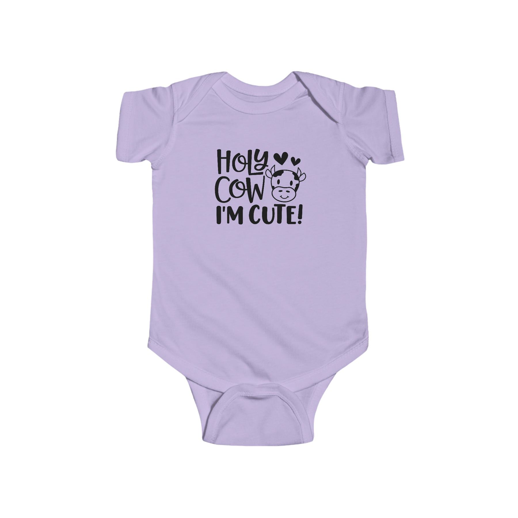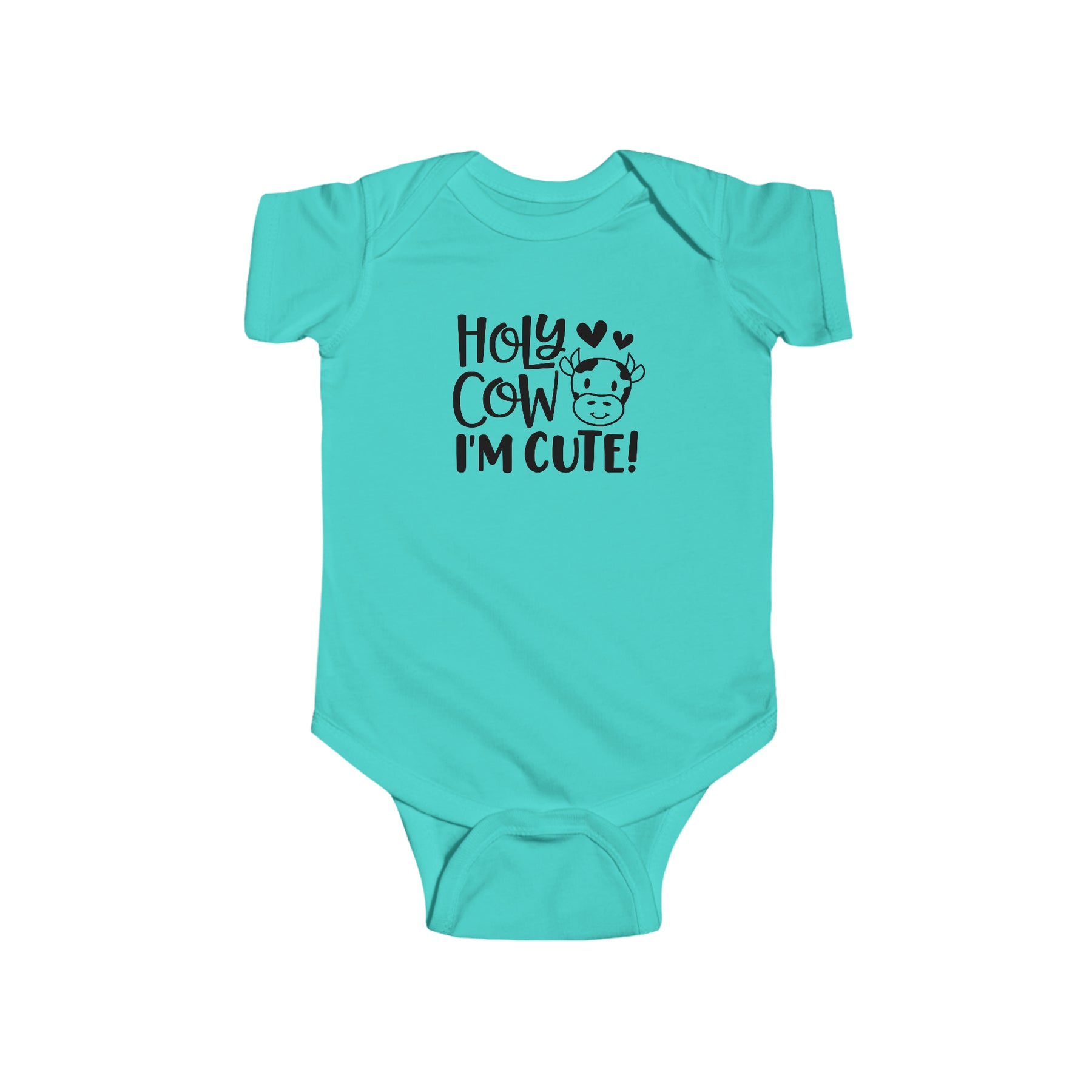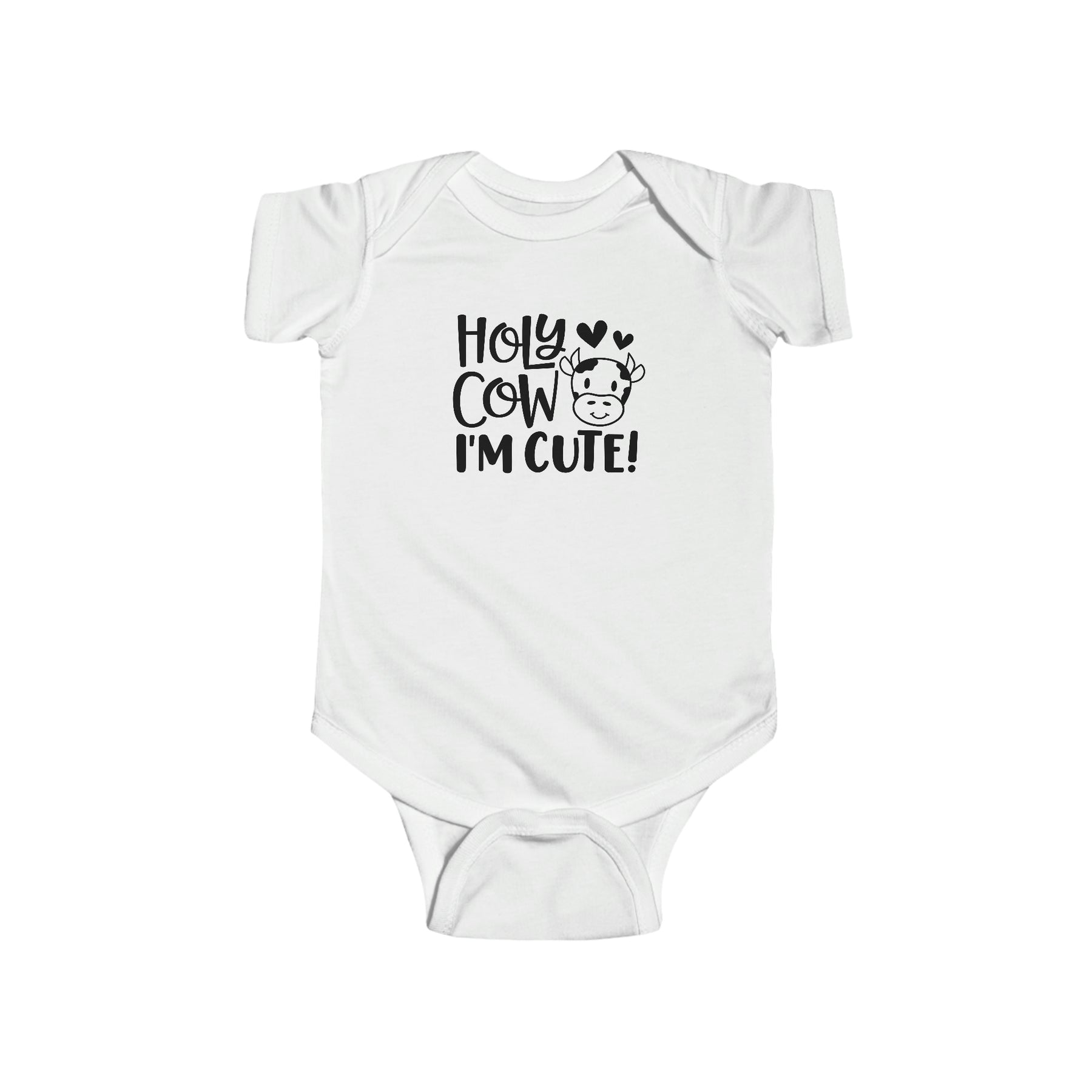 Infant fine jersey bodysuit featuring Holy Cow I'm Cute text. 100% cotton fabric with ribbed knit bindings and plastic snaps for easy changing. Light, durable, tear-away label included.