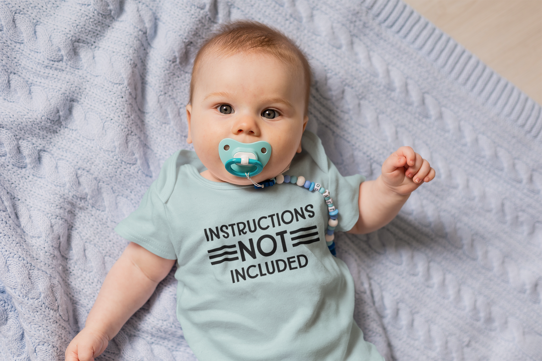 A baby lies on a blanket, wearing an Instructions Not Included Onesie from Worlds Worst Tees. This infant fine jersey bodysuit is 100% cotton, featuring ribbed knitting for durability and plastic snaps for easy changing access.