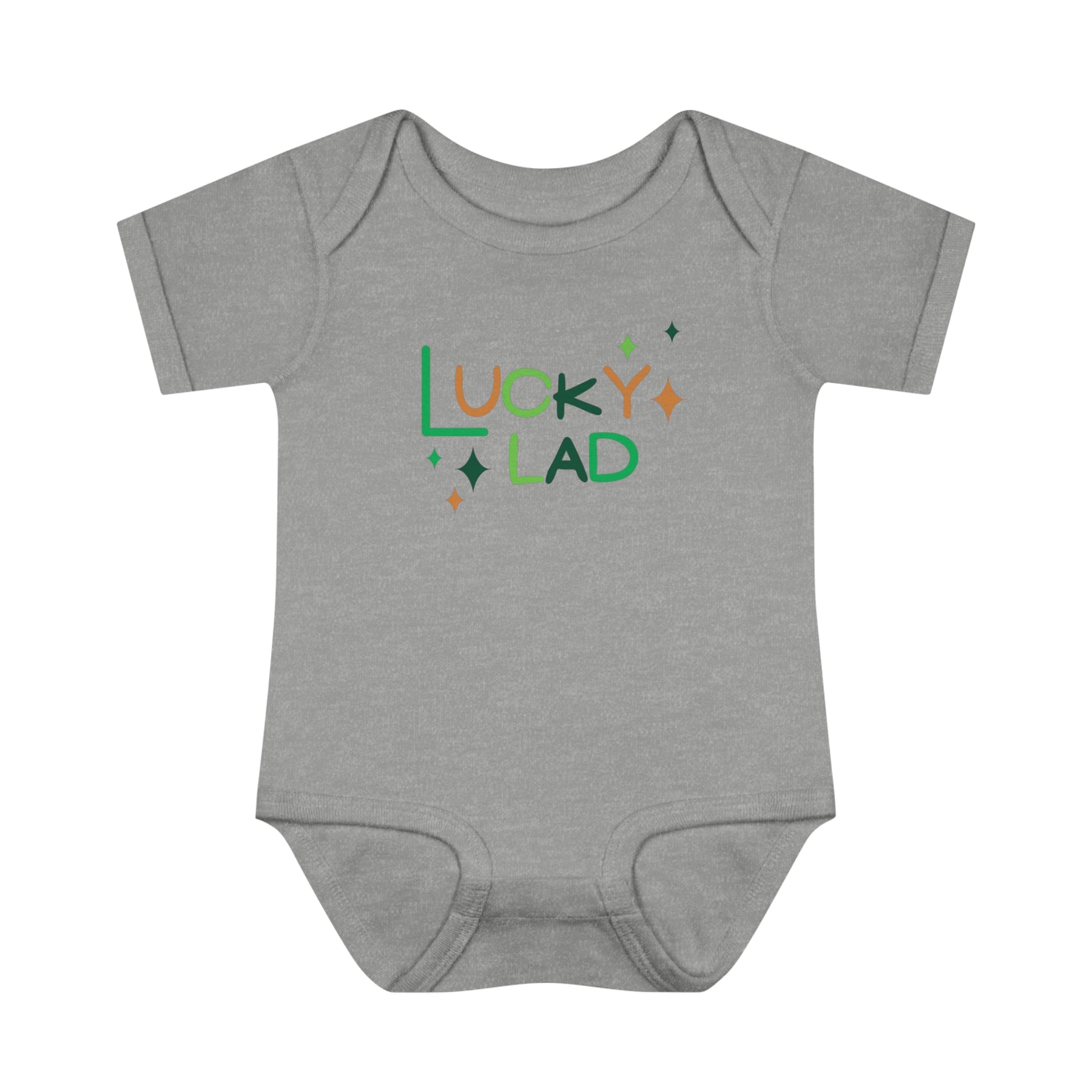 A Lucky Lad Onesie for infants, featuring ring-spun cotton for softness and comfort. Lap shoulders for easy dressing. Unisex fit, light fabric, tear-away label. Ideal for younglings.