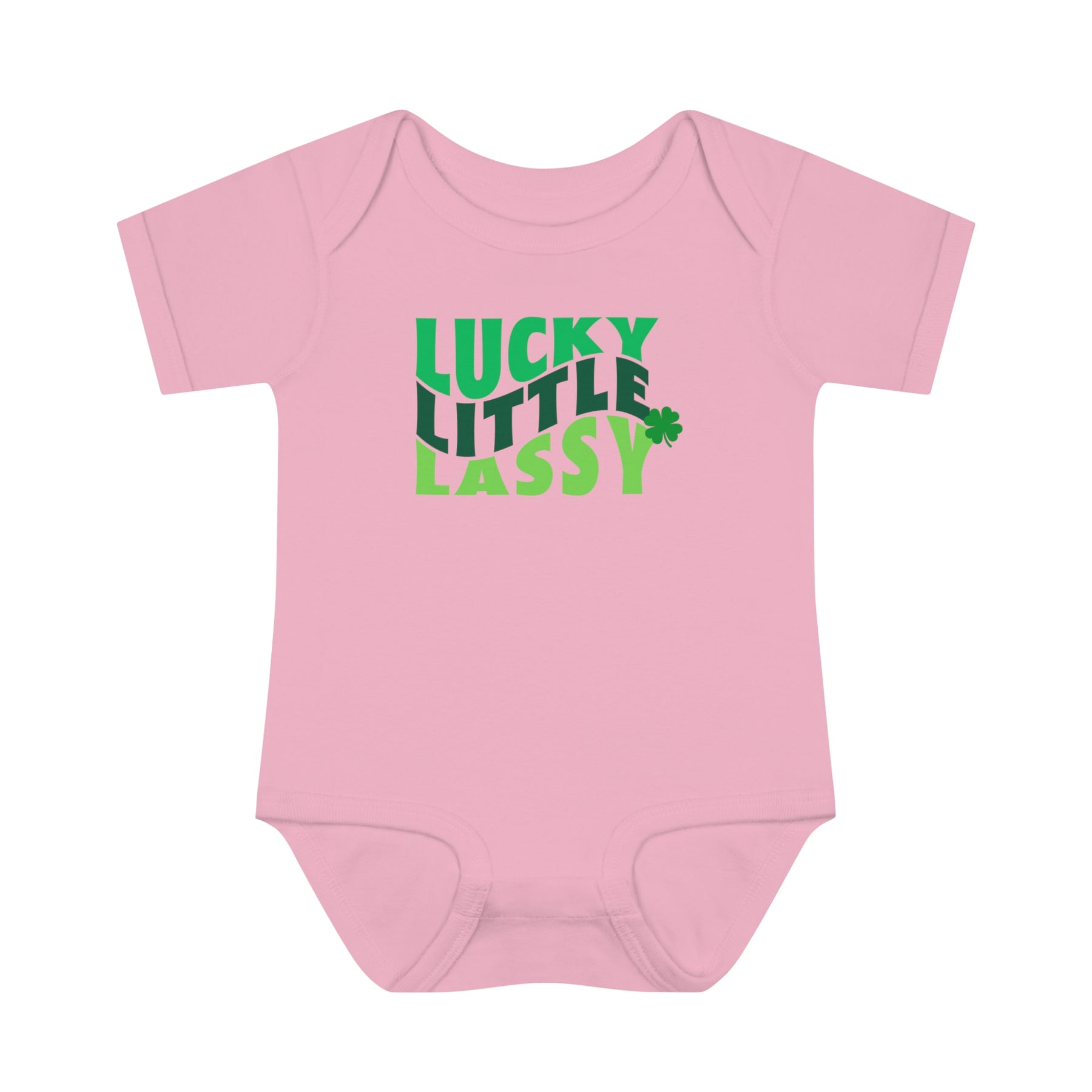 A Lucky Little Lassy Onesie for infants, featuring soft ring-spun cotton and lap shoulders for comfort and easy dressing. Unisex fit, light fabric, tear-away label. Ideal for younglings.