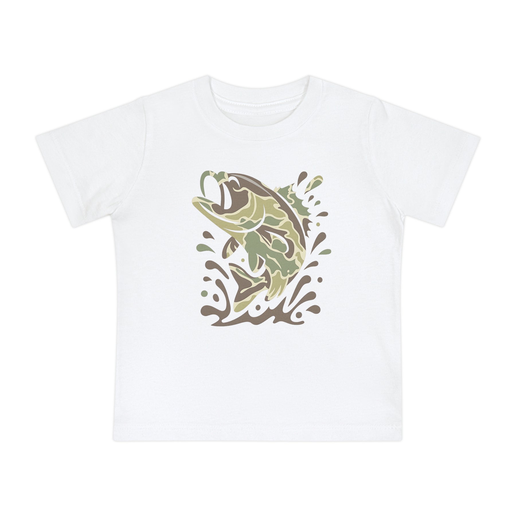 Camo Fish Toddler Crew T-shirt features a leaping fish in camouflage colors on a soft, durable white fabric, perfect for stylish comfort.