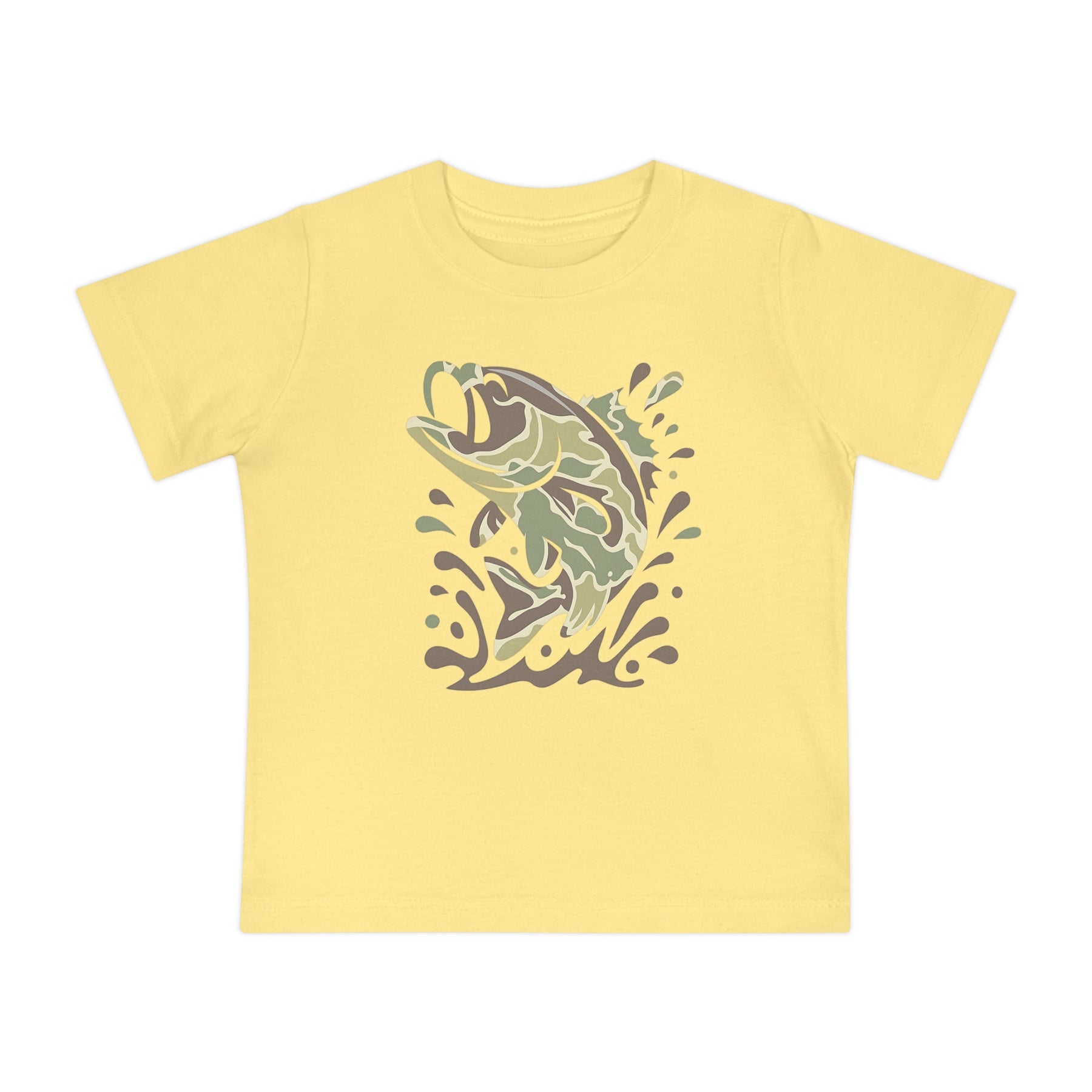 Camo Fish Baby Tee: Pale yellow kids' T-shirt featuring a stylized camo fish graphic leaping with water splash motifs, made from soft, durable cotton for comfort.