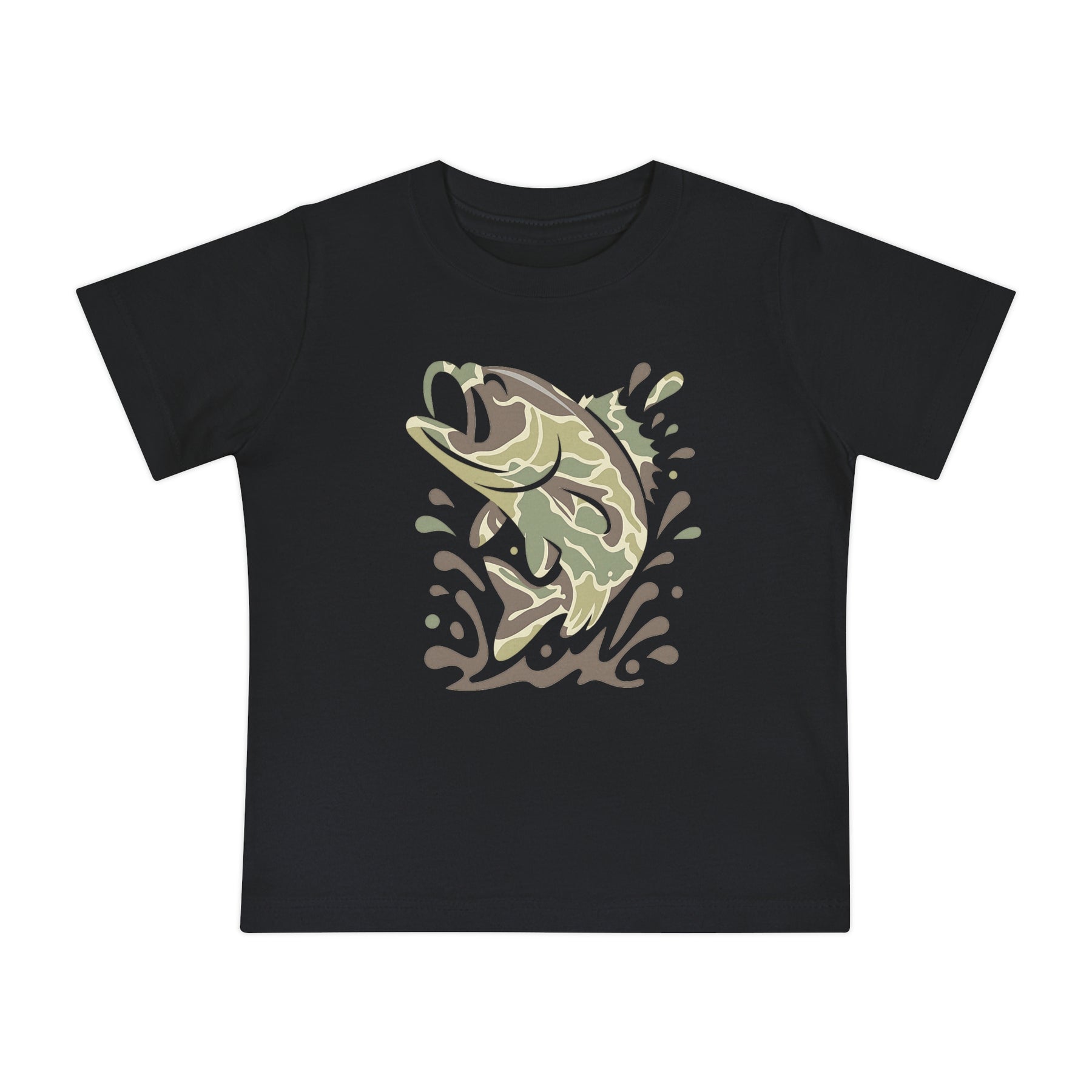 Camo Fish Baby Tee: A kids' black T-shirt featuring a stylized trout-like fish in muted camouflage tones, leaping with water splashes, highlighting comfort and durability.