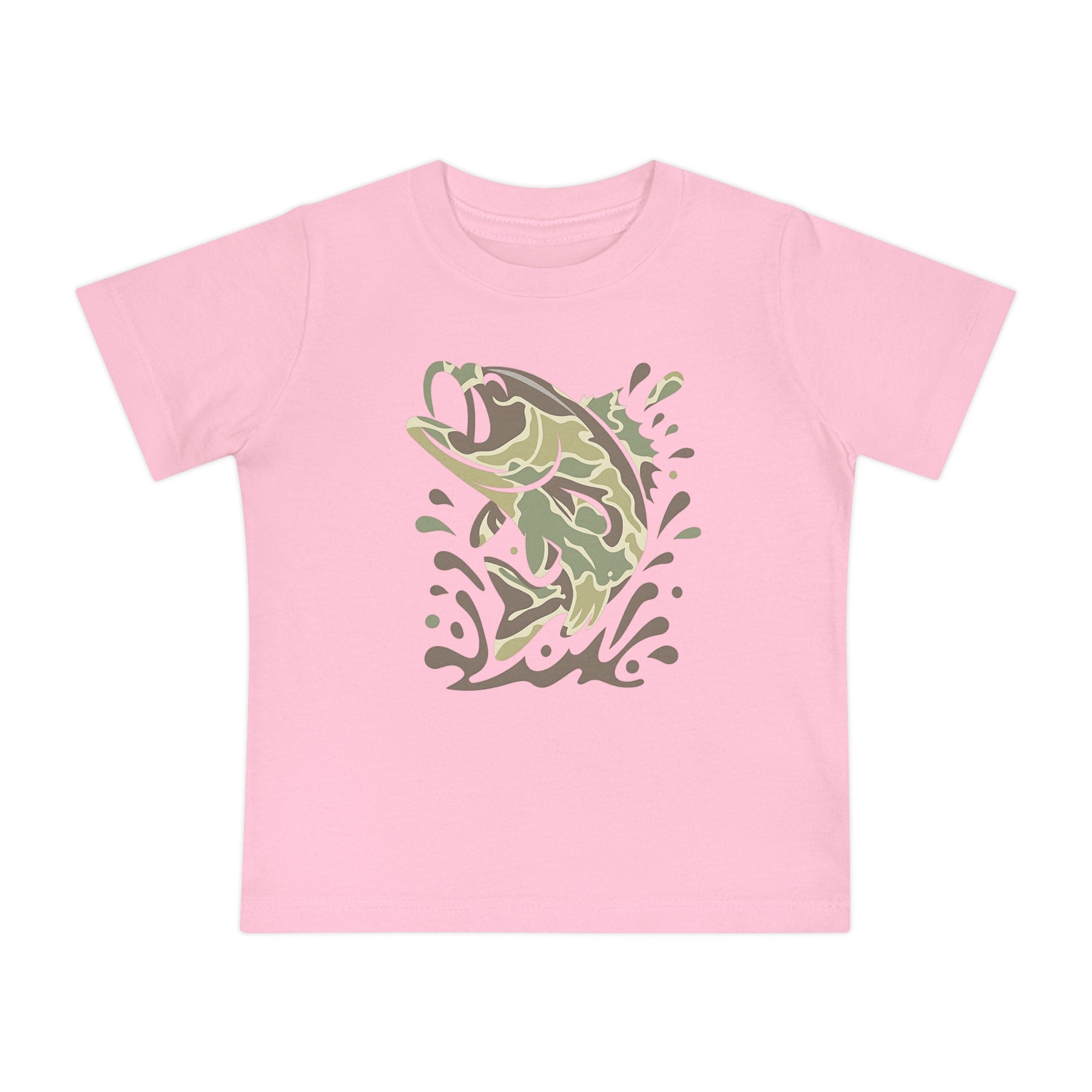 Camo Fish Baby Tee: Light pink kids' T-shirt with a stylized bass in camouflage pattern leaping from water. Soft, shrink-resistant, 100% cotton, available in baby sizes.