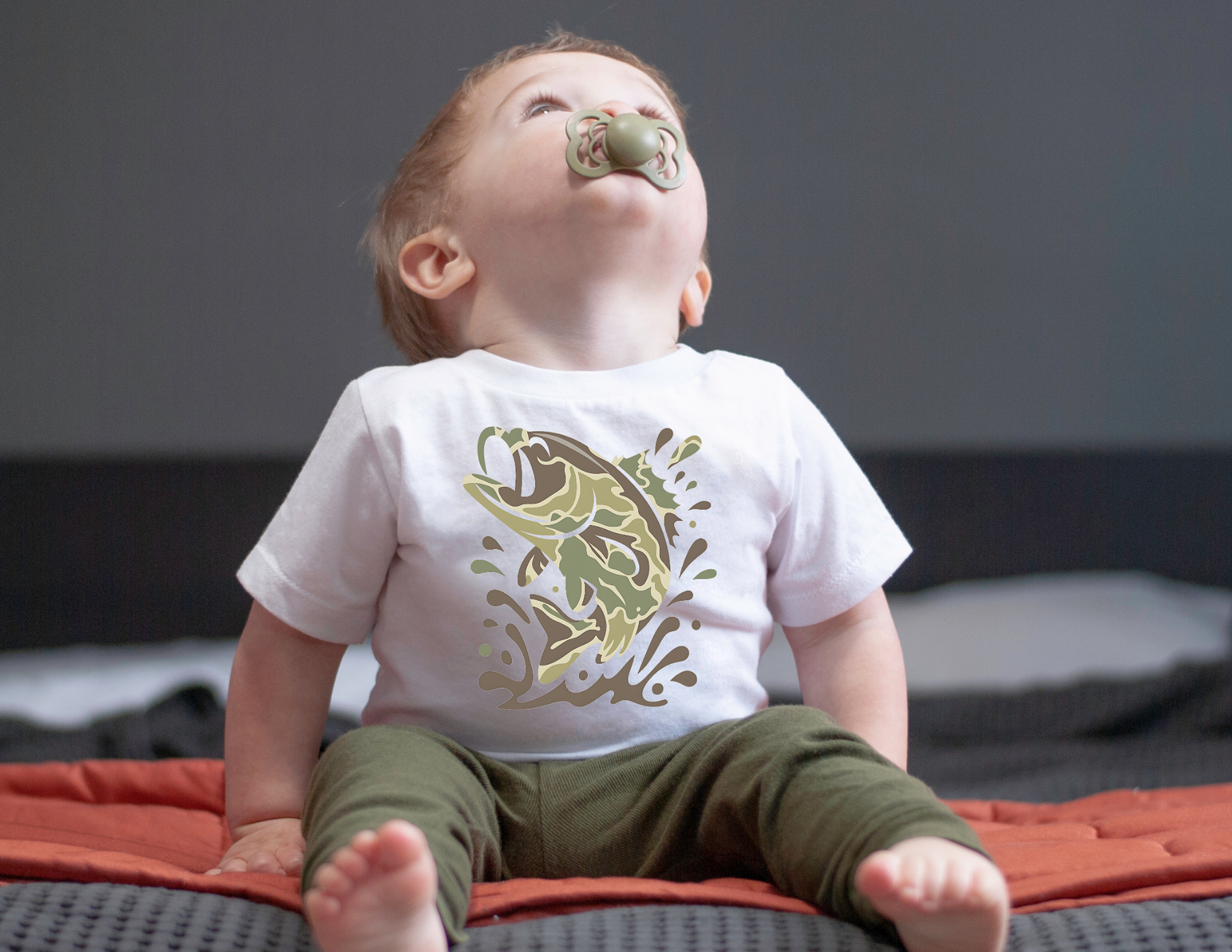 Baby wearing a Camo Fish Baby Tee sits on a bed, featuring a stylized jumping fish design. The white tee is soft, durable, and shrink-resistant.