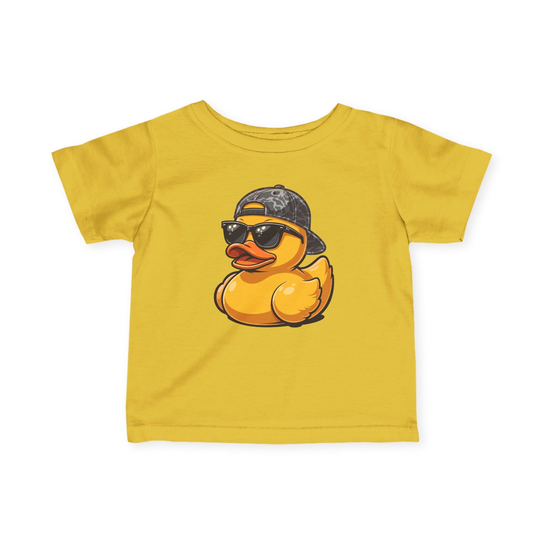 Ducky Baby Tee: Bright yellow infant T-shirt featuring a cartoon rubber duck with sunglasses and a backward camo cap, offering comfort and durability with 100% ring-spun cotton.