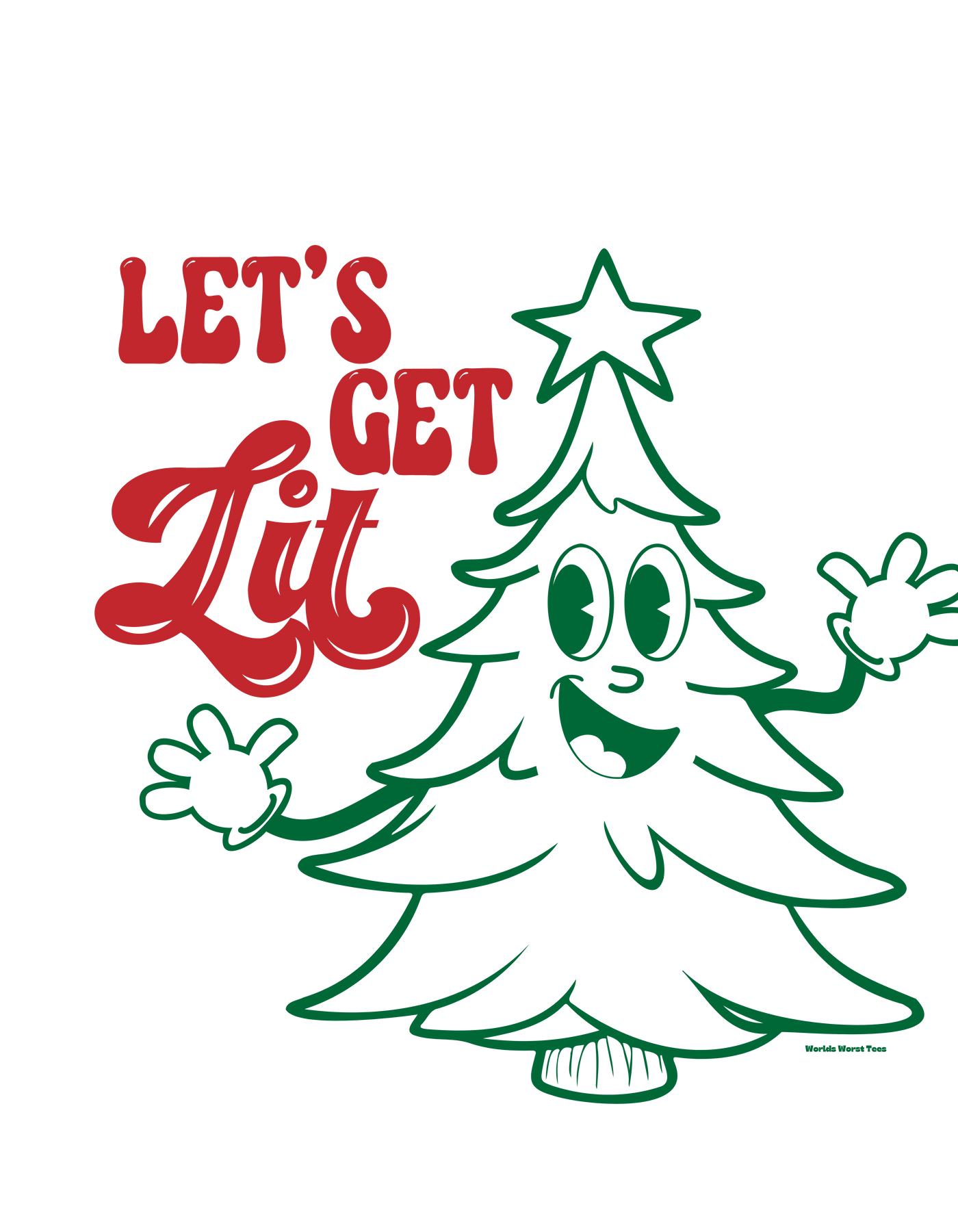 A white t-shirt featuring a cartoon Christmas tree design, part of the Let's Get Lit Tee collection at Worlds Worst Tees. Unisex, relaxed fit, made of 80% ring-spun cotton and 20% polyester.