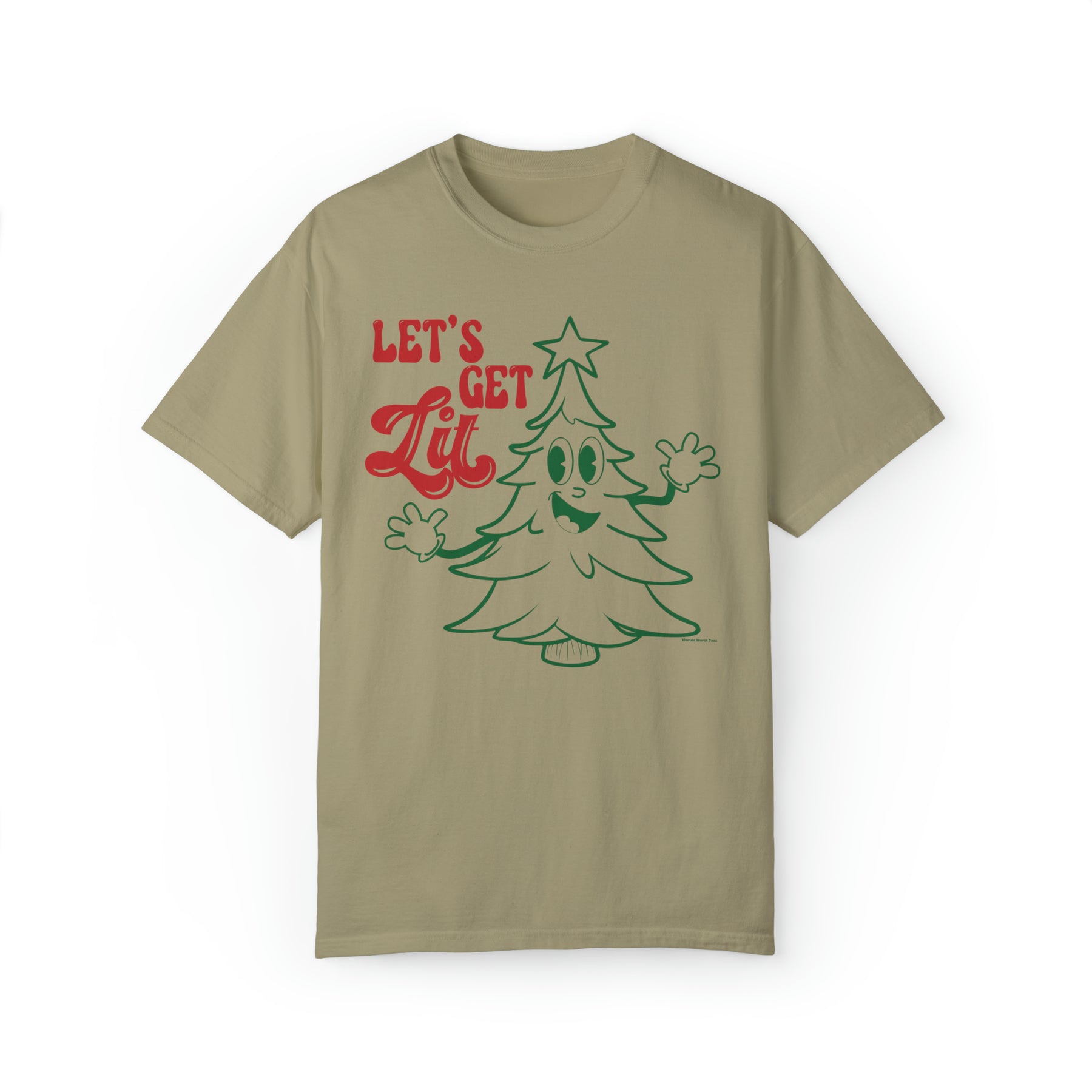 Unisex Let's Get Lit Tee, tan shirt with a cartoon Christmas tree, 80% ring-spun cotton, 20% polyester, relaxed fit, rolled-forward shoulder, back neck patch.
