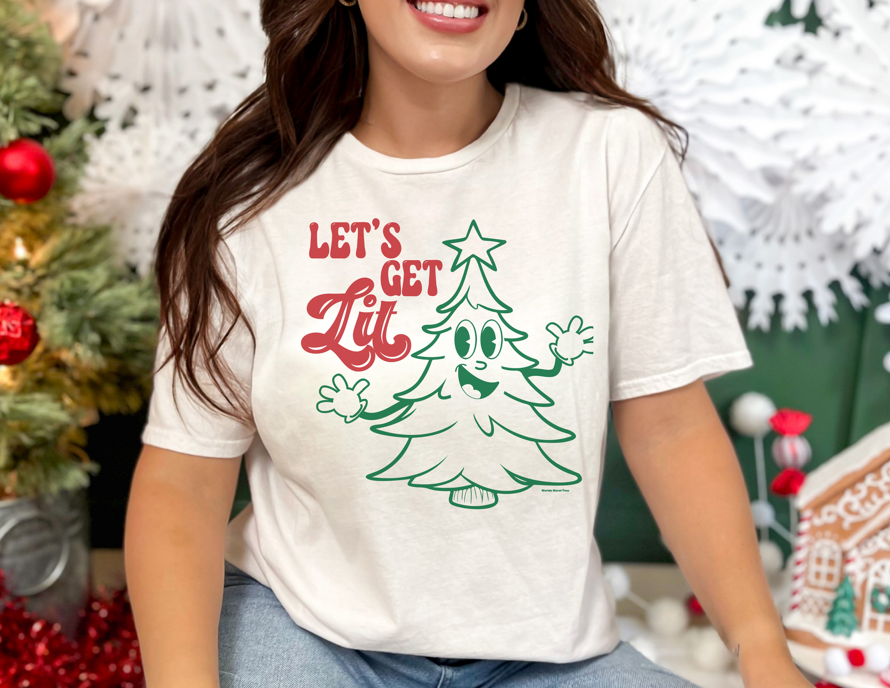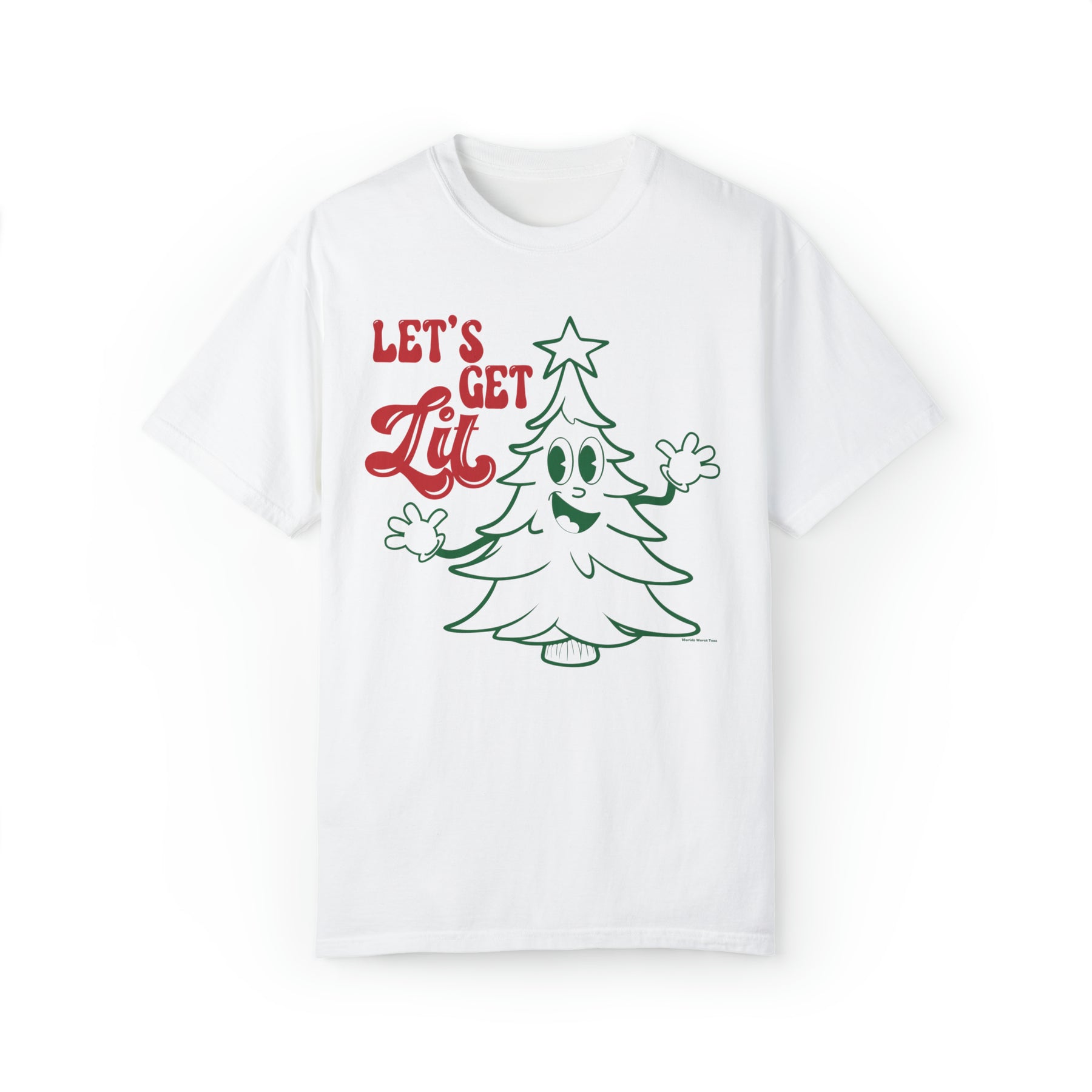 A white t-shirt featuring a cartoon Christmas tree and text, part of the Let's Get Lit Tee collection at Worlds Worst Tees. Unisex, garment-dyed sweatshirt made of 80% ring-spun cotton and 20% polyester with a relaxed fit and rolled-forward shoulder.