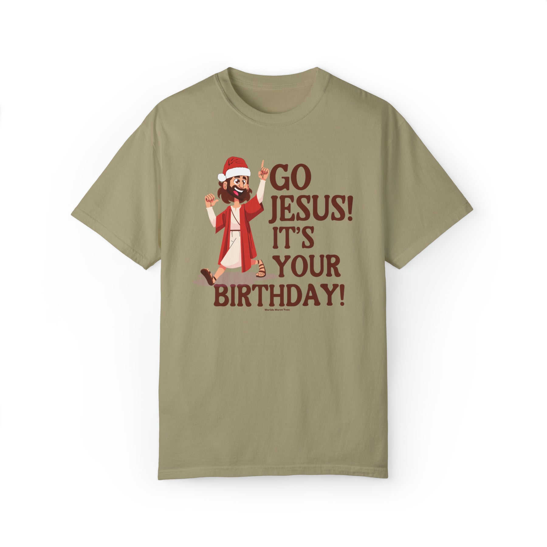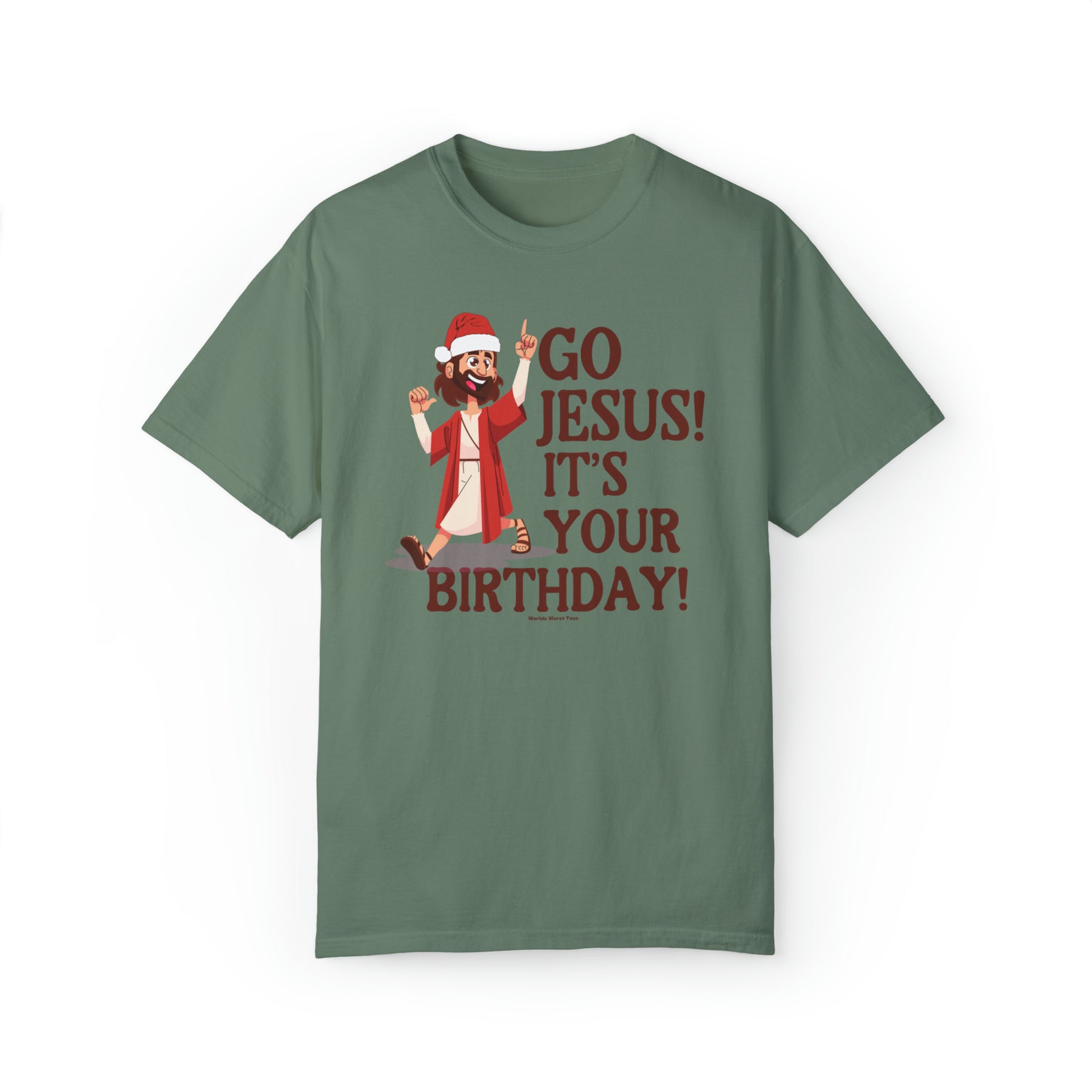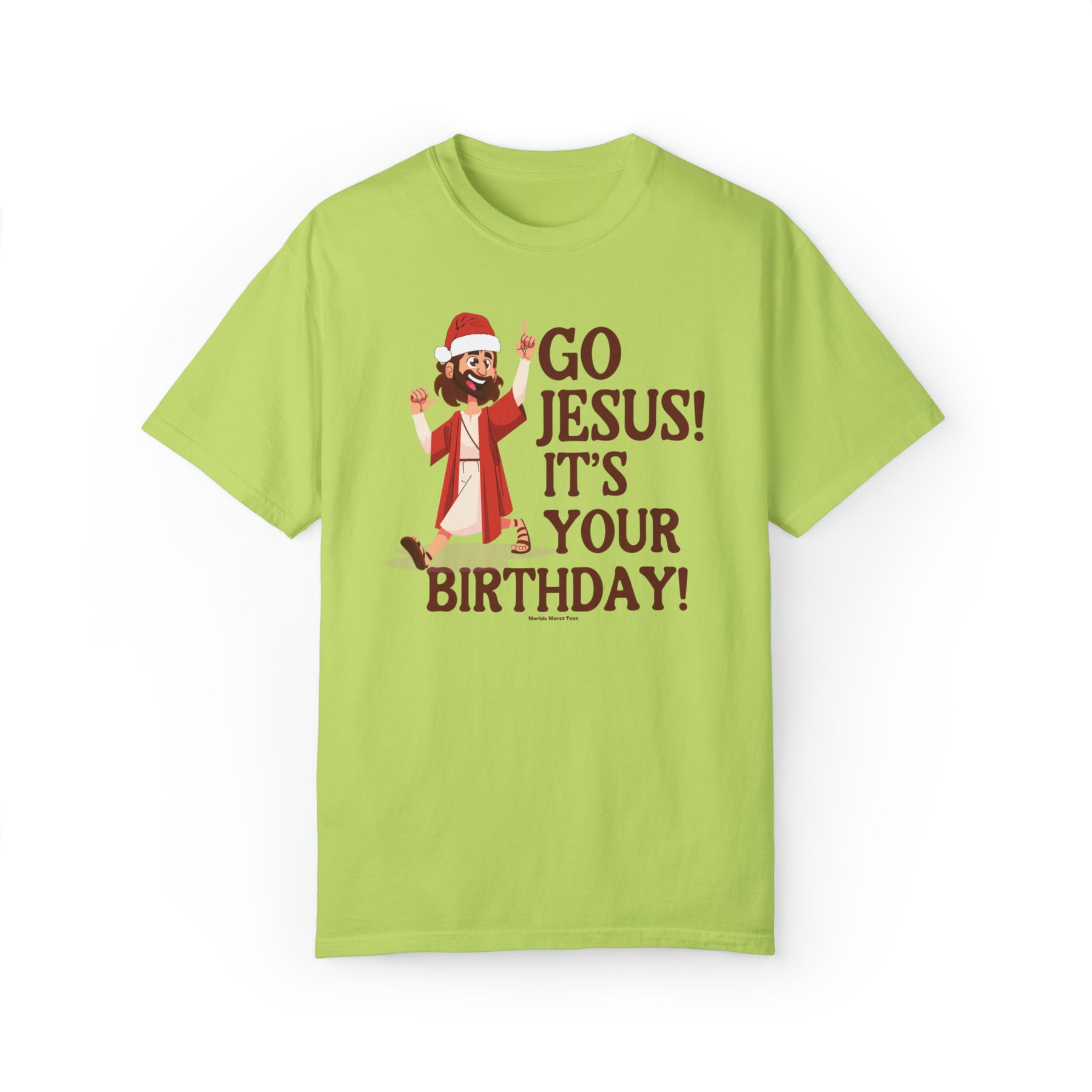 A green shirt featuring a cartoon character pointing up, titled Go Jesus it's your birthday Tee. Unisex sweatshirt made of 80% ring-spun cotton and 20% polyester, with a relaxed fit and rolled-forward shoulder.