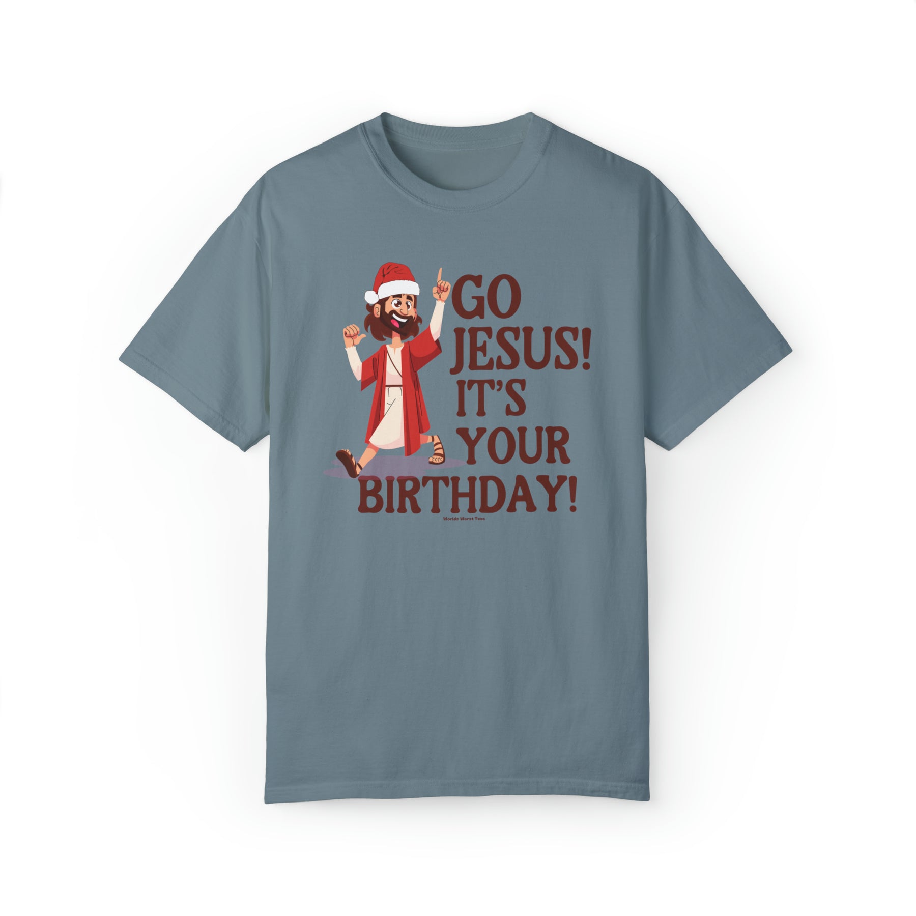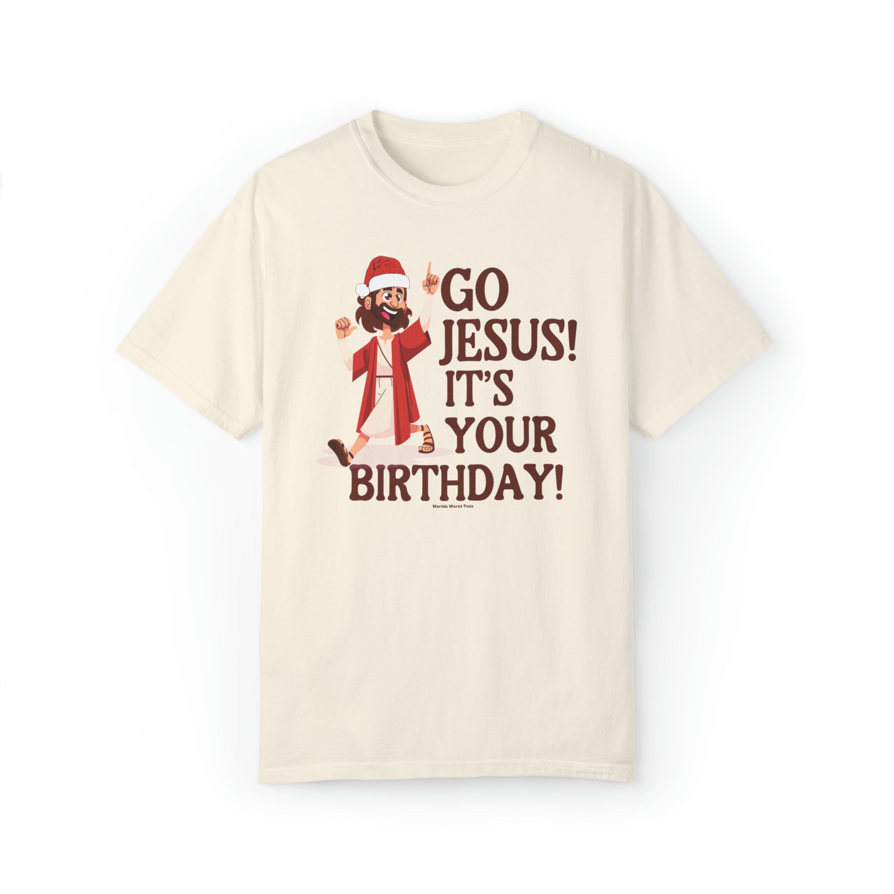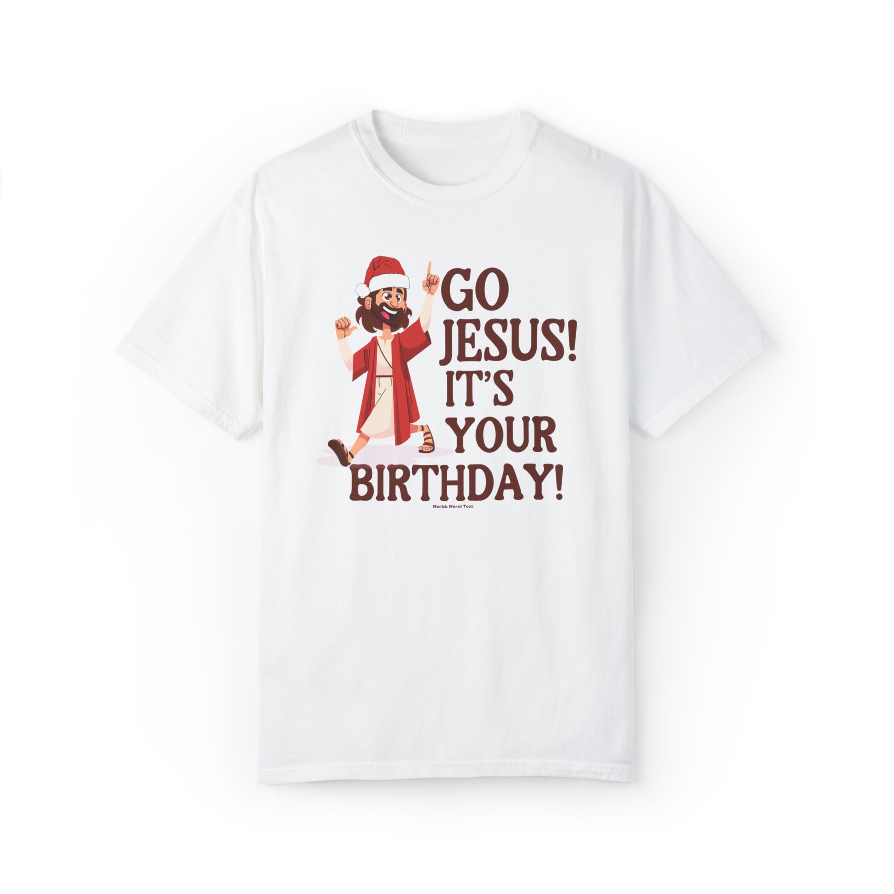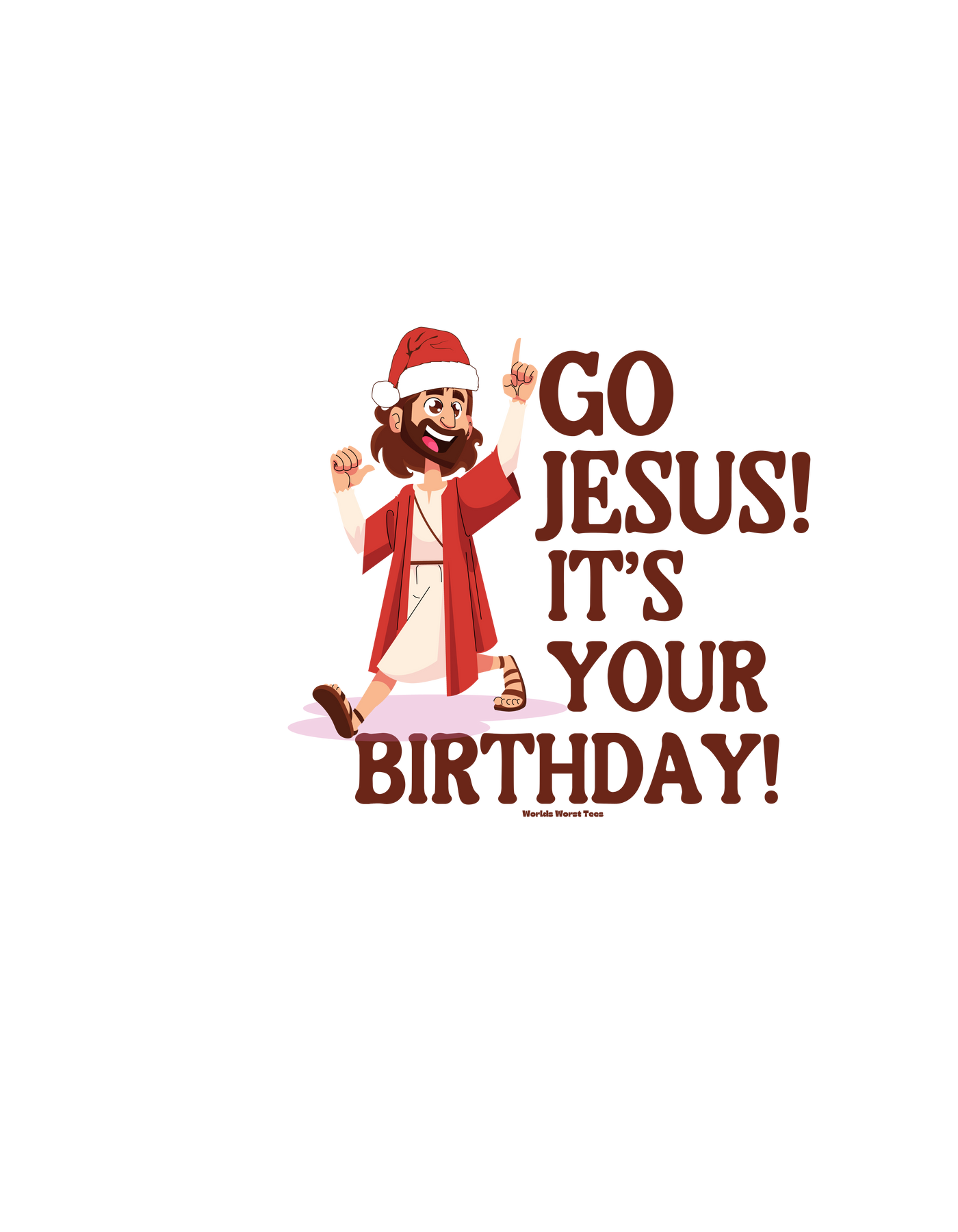 Unisex Go Jesus It's Your Birthday Tee featuring a cartoon character in a Santa hat. Made of 80% ring-spun cotton and 20% polyester, with a relaxed fit and rolled-forward shoulder. From Worlds Worst Tees.