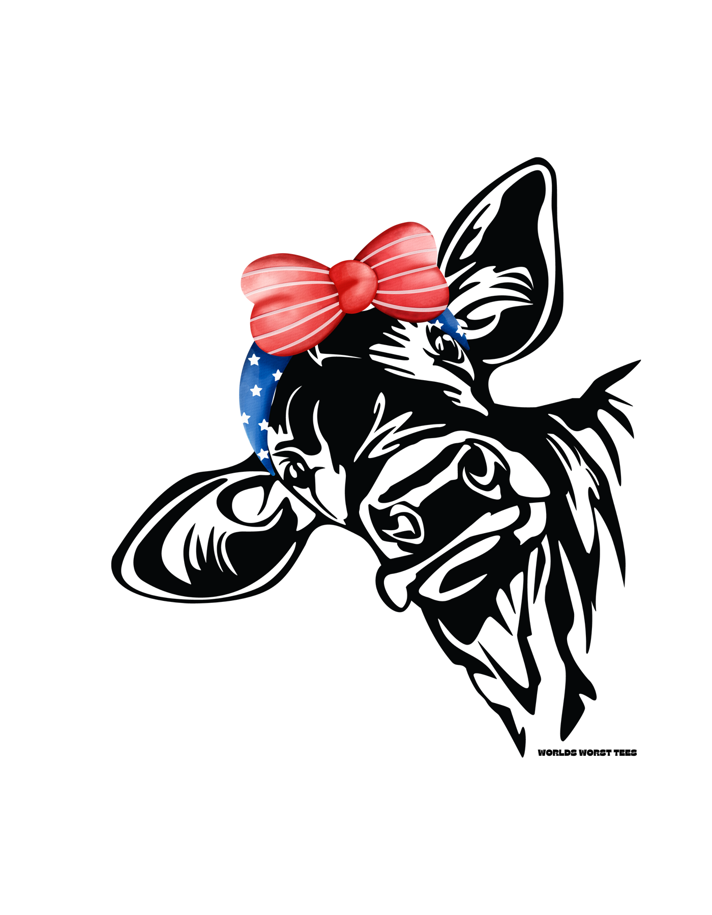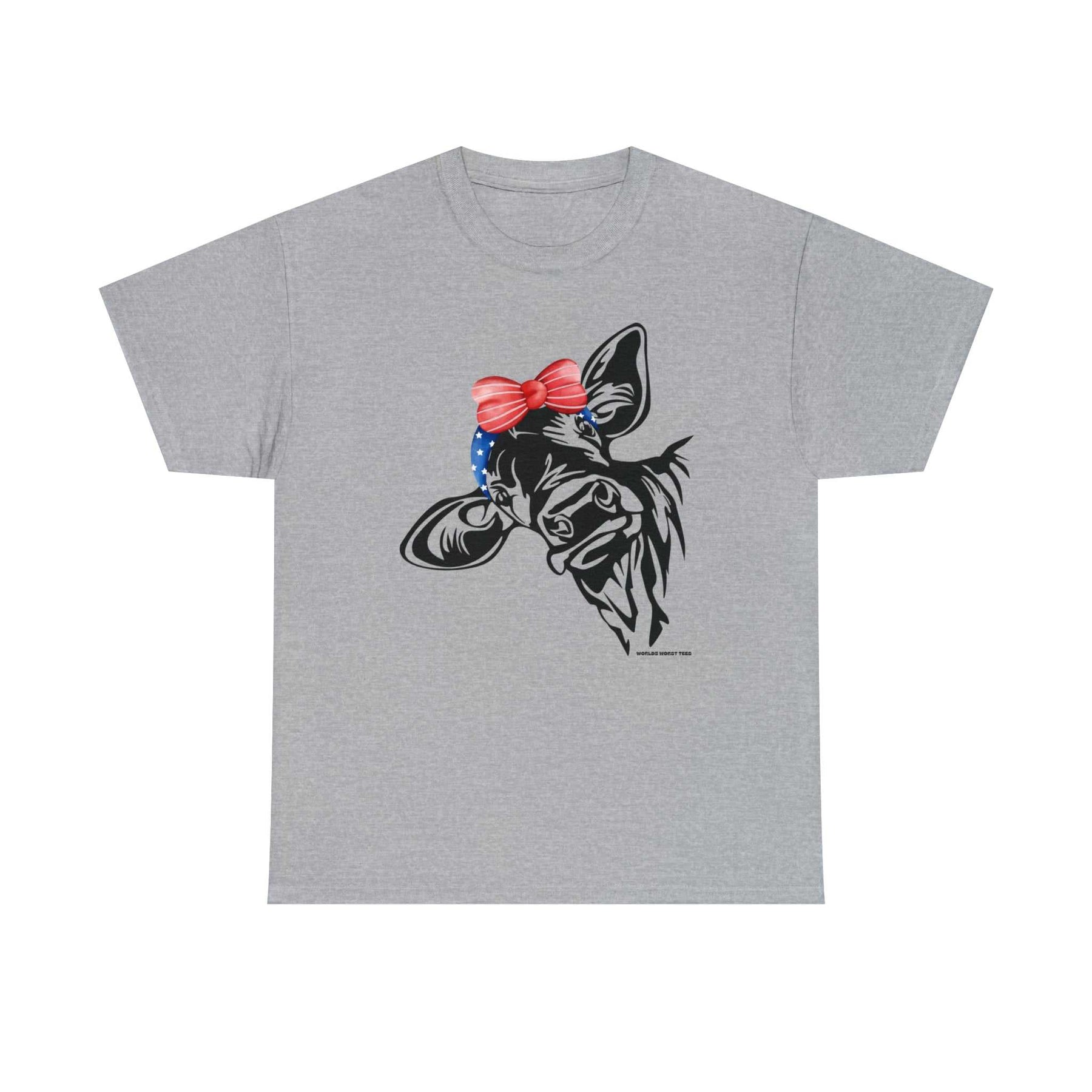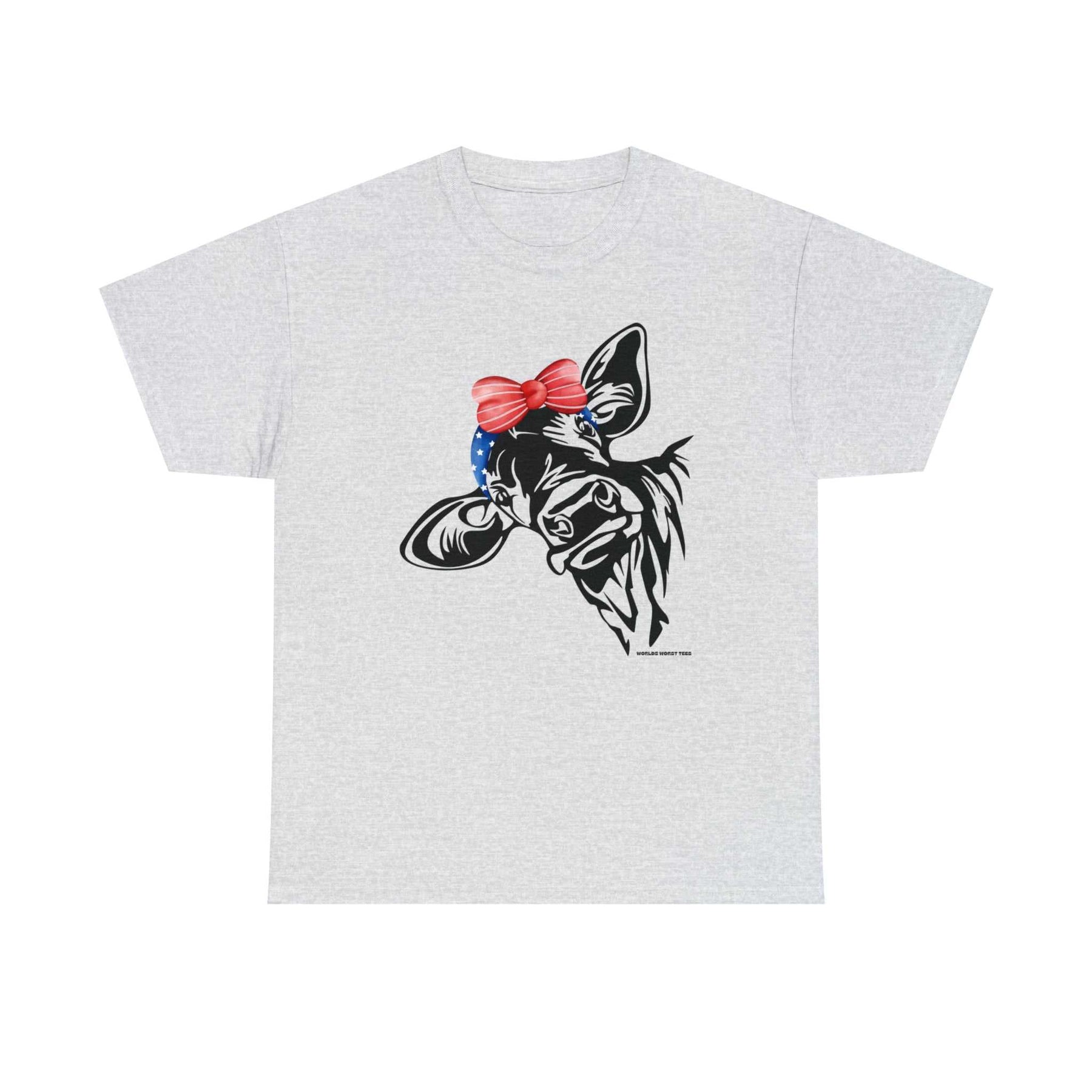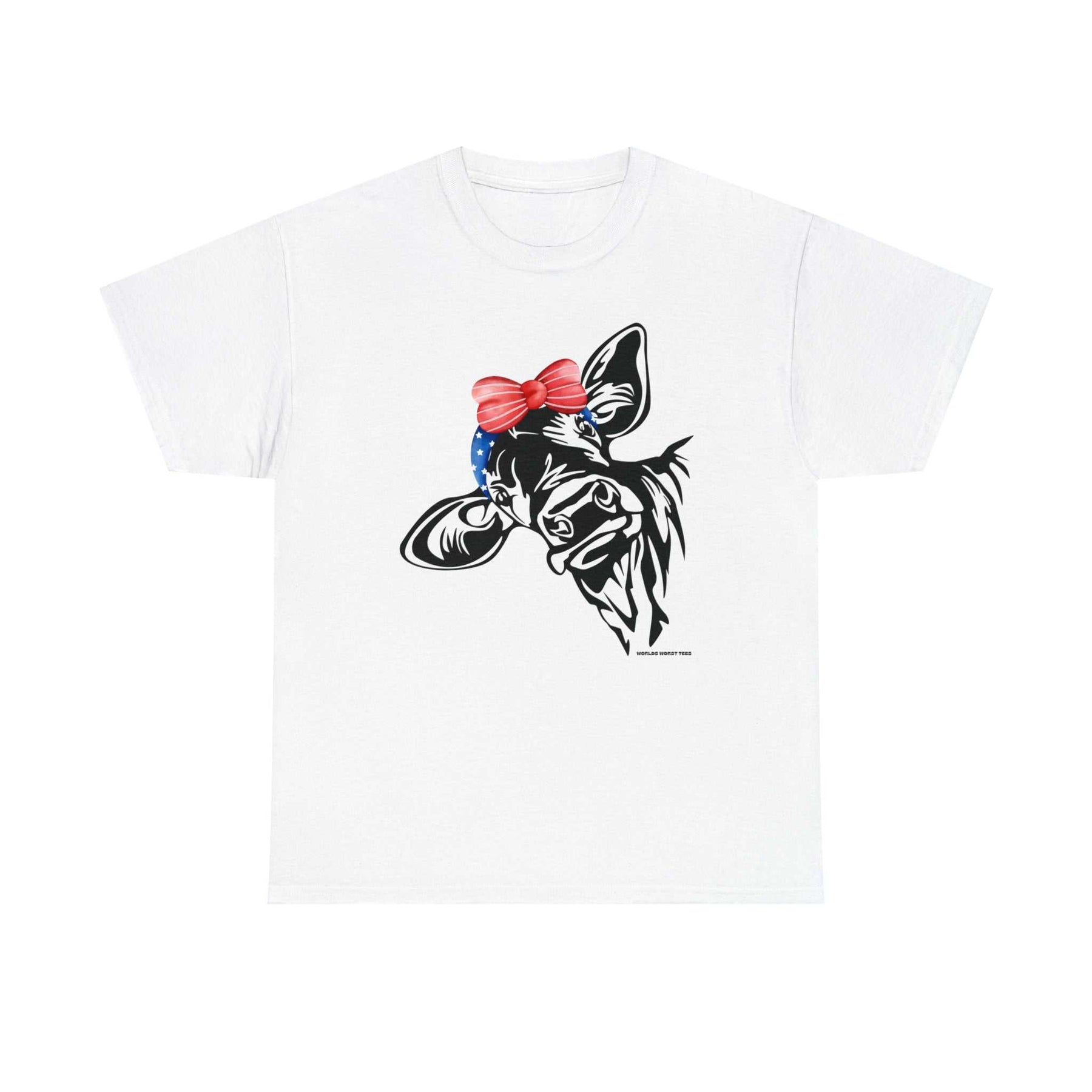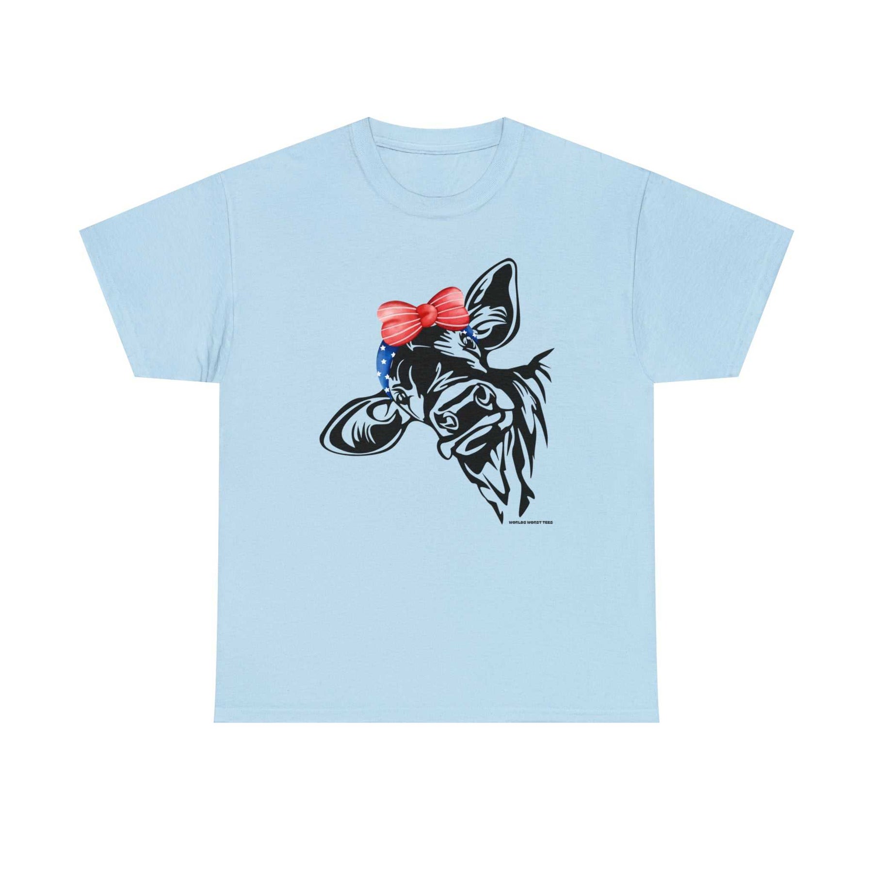 A patriotic cow wearing a headband and bow tie, surrounded by stars and stripes. Unisex heavy cotton tee with no side seams, ribbed knit collar, and durable tape on shoulders. Perfect for casual fashion.