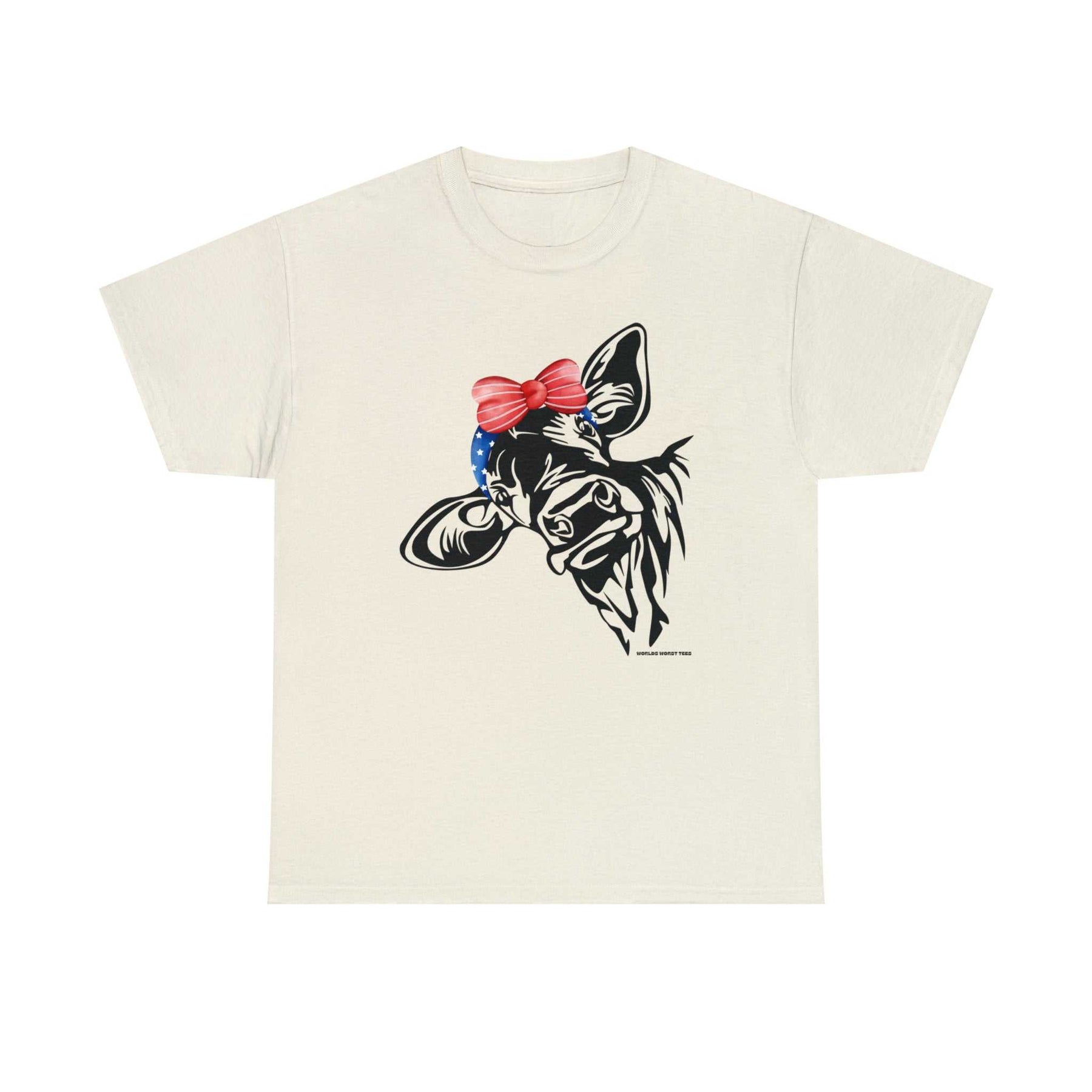 A classic fit unisex heavy cotton tee featuring a cow head with a red bow, perfect for casual fashion. No side seams, durable tape on shoulders, and ribbed knit collar. Ideal for 4th of July Family Mama Cow Tee.
