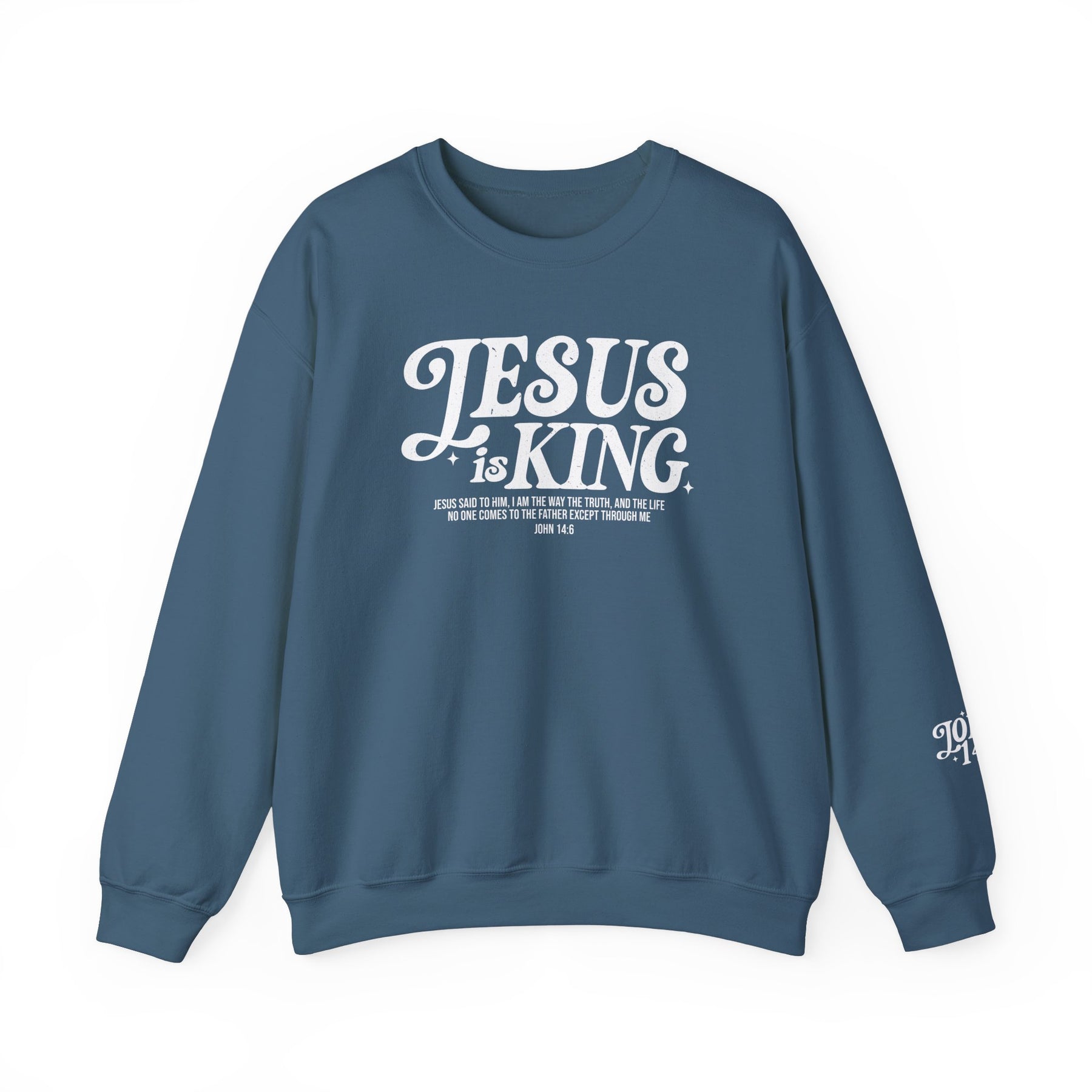 Jesus is King Crew sweatshirt featuring white text on blue fabric, offering a comfortable, unisex fit with ribbed knit collar and no side seams.