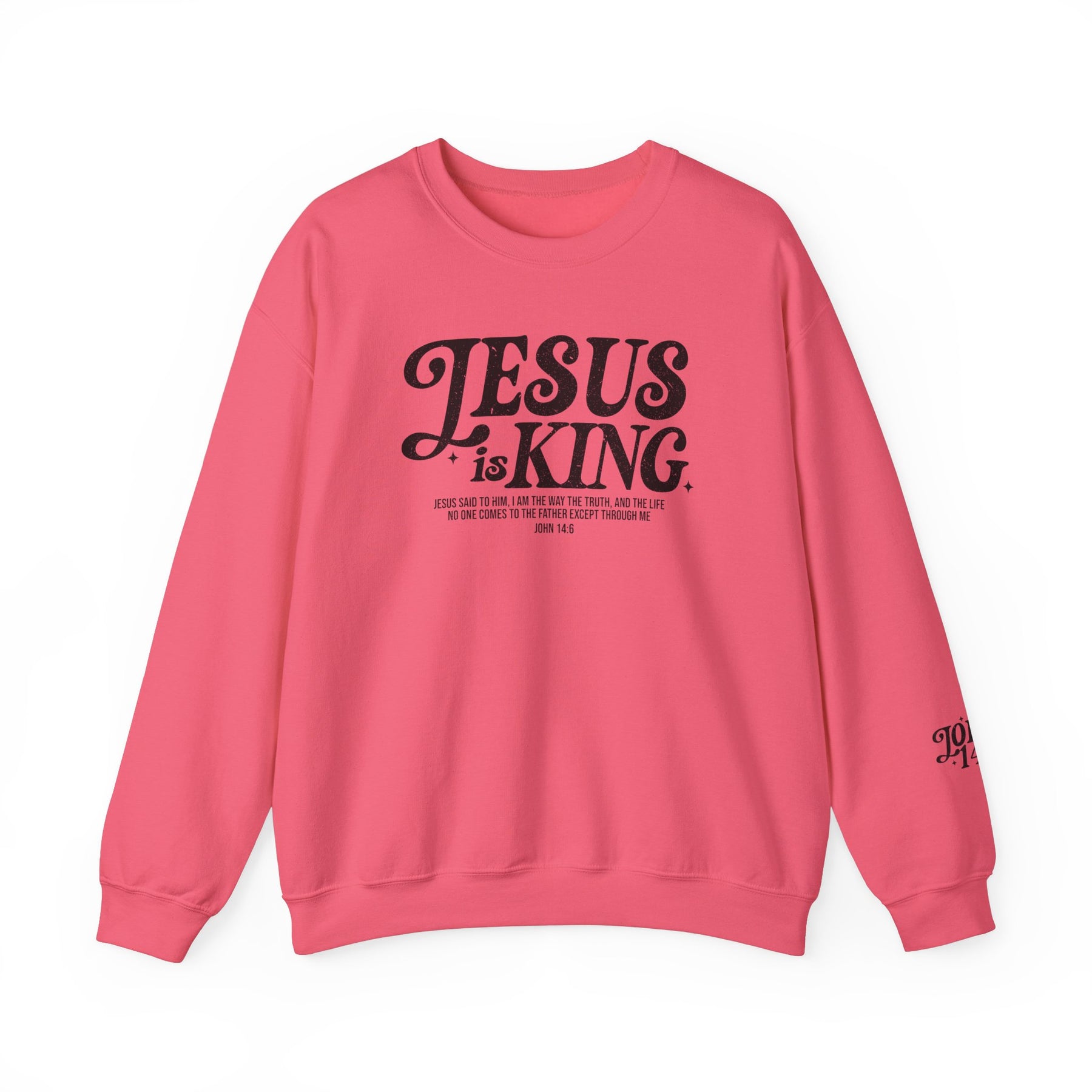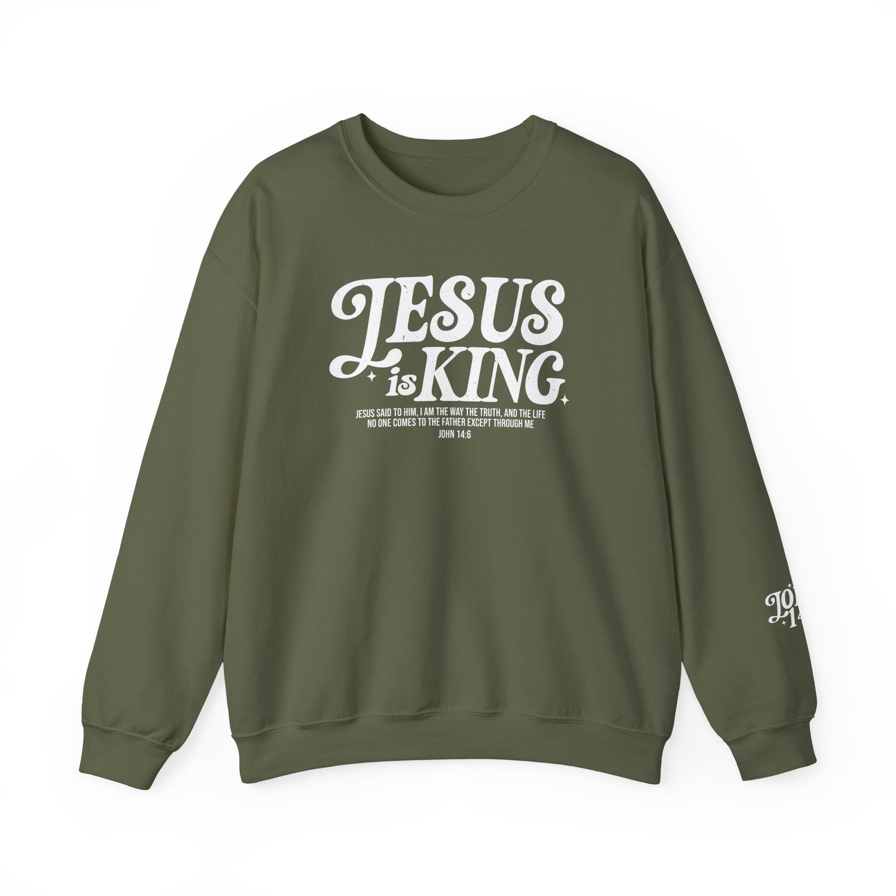 Jesus is King Crew sweatshirt, unisex heavy blend with ribbed collar, showcasing a unique design, ideal for comfort. Available in various sizes, made of polyester and cotton.