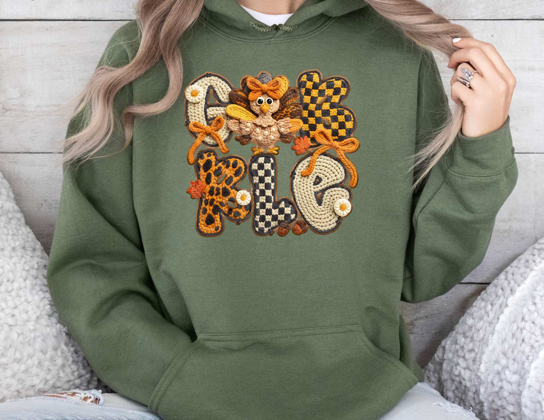 Gobble Hoodie displayed with crocheted fall-themed letters and turkey, highlighting its cozy, stylish fit and perfect for Thanksgiving festivities.