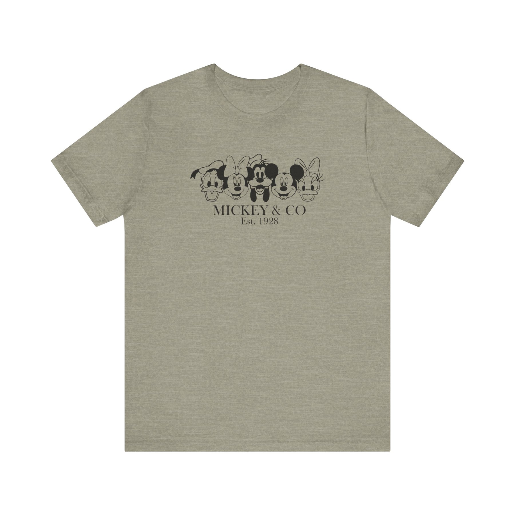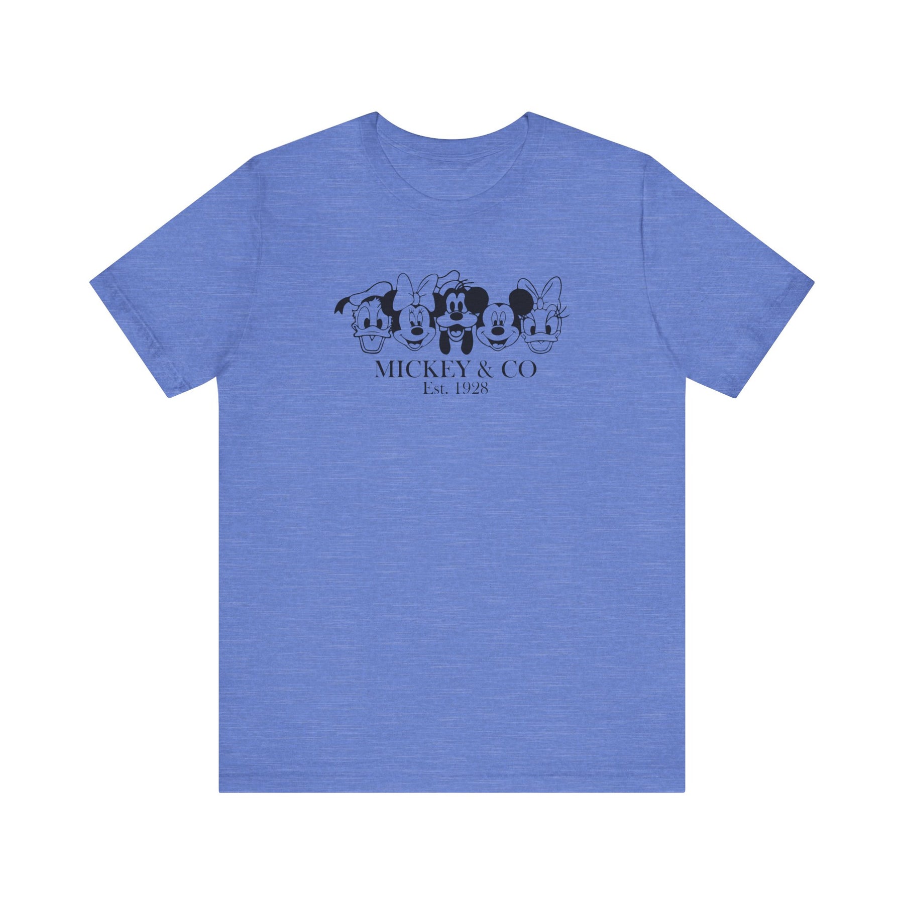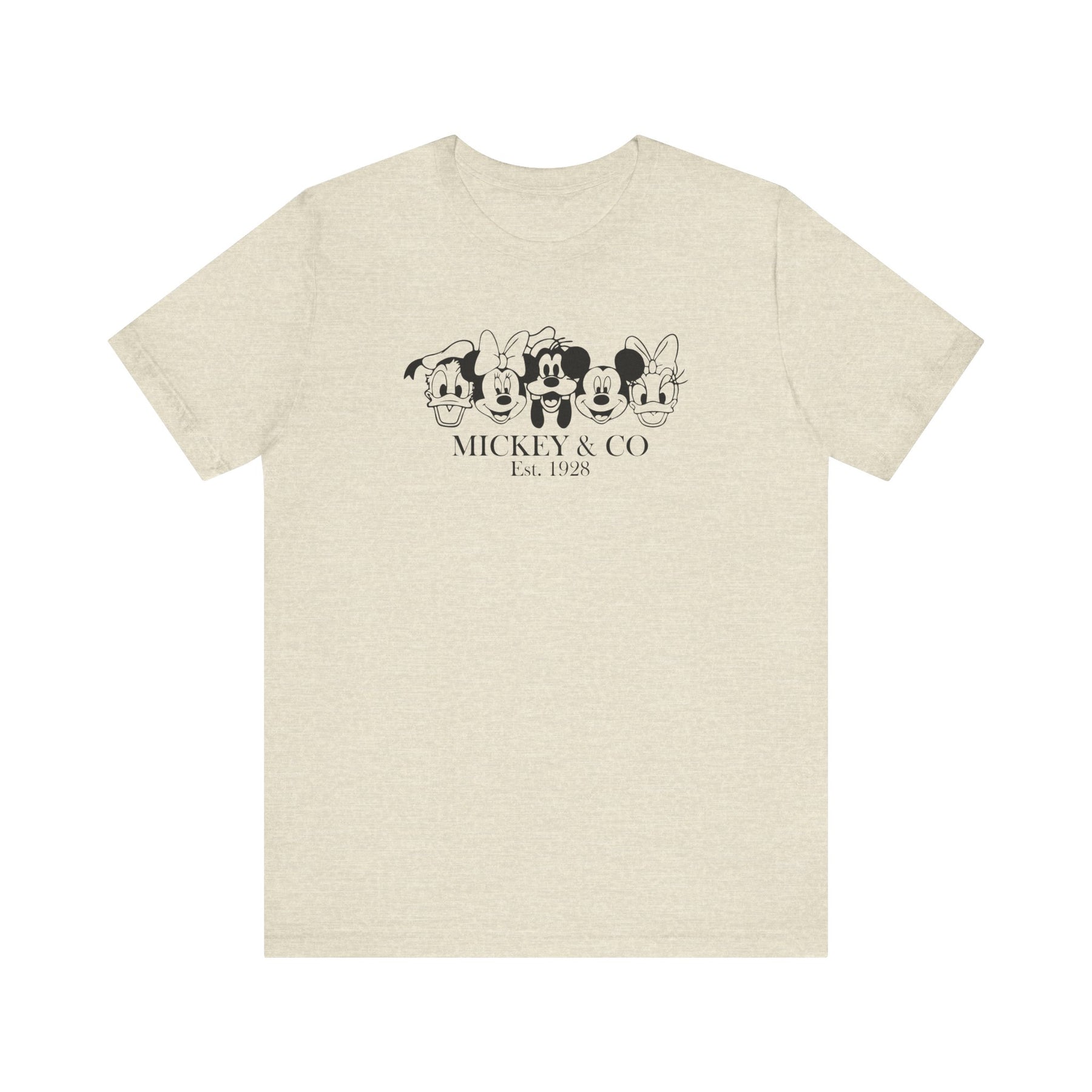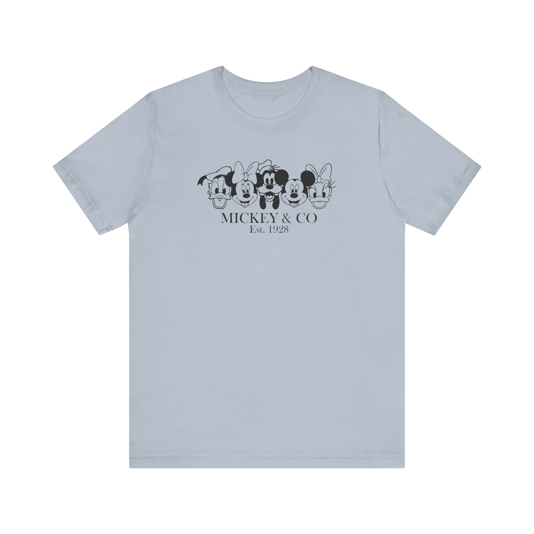 Mickey and CO Tee, a classic unisex jersey short sleeve shirt, featuring soft cotton, ribbed knit collar, and tapered shoulders for a comfortable, enduring fit.