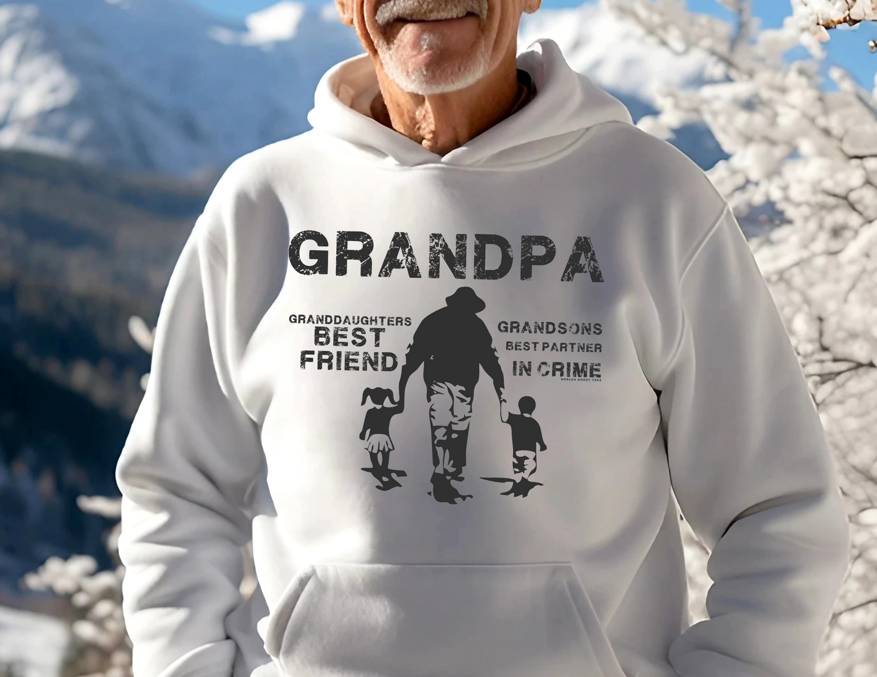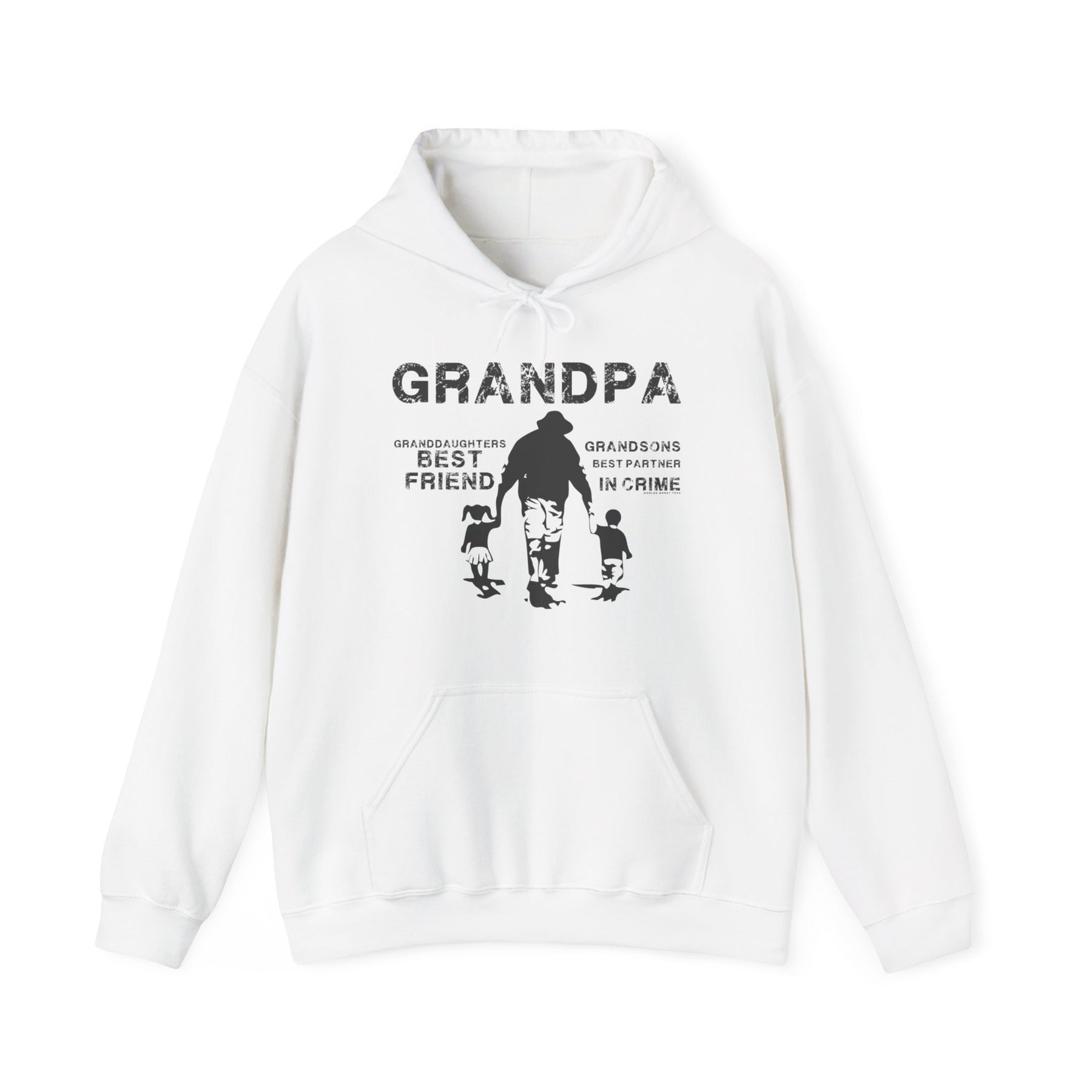 A white sweatshirt with black text featuring a man and child holding hands. Unisex Grandpa and Grandkids Hoodie in cotton-polyester blend, kangaroo pocket, and drawstring hood. Classic fit, tear-away label, medium-heavy fabric.