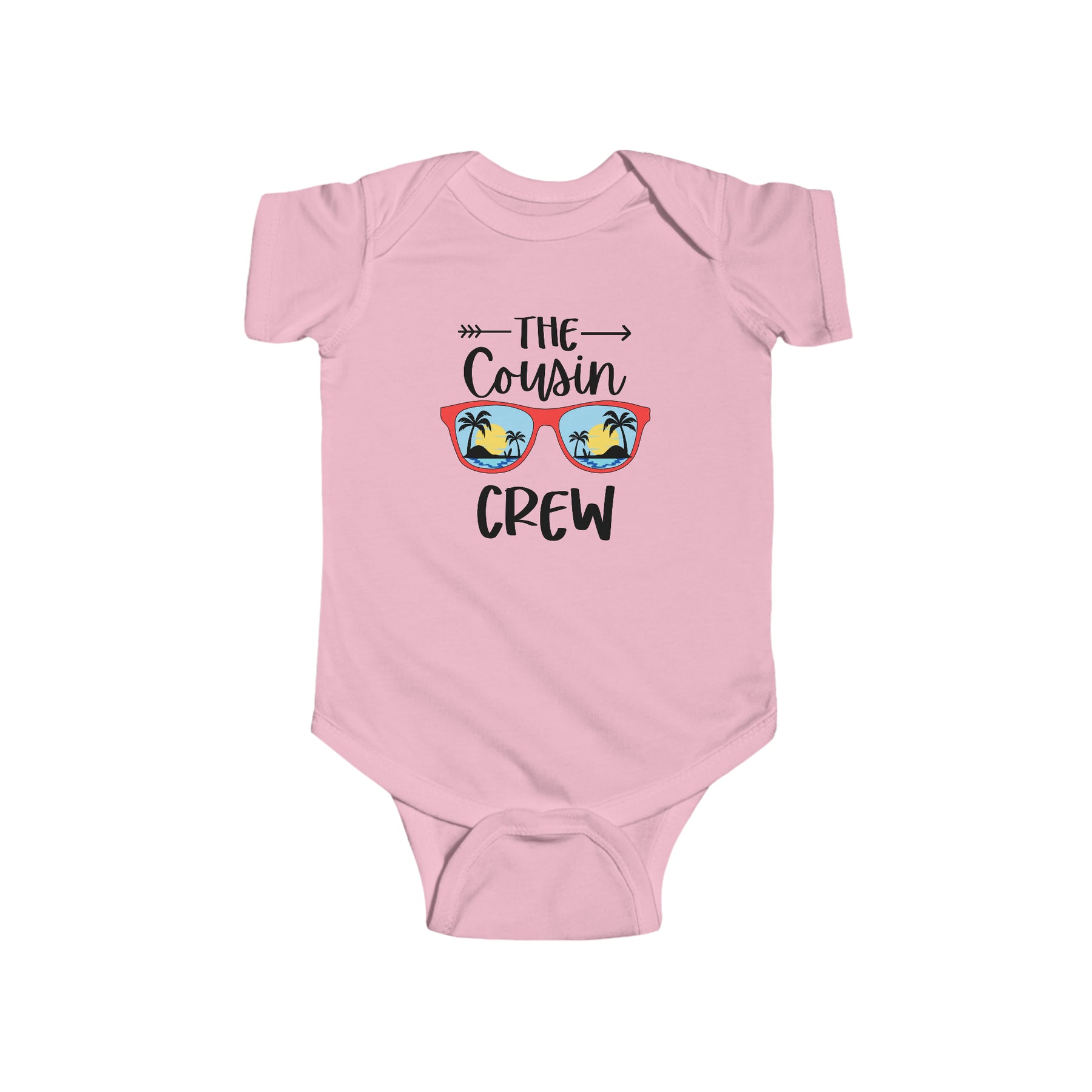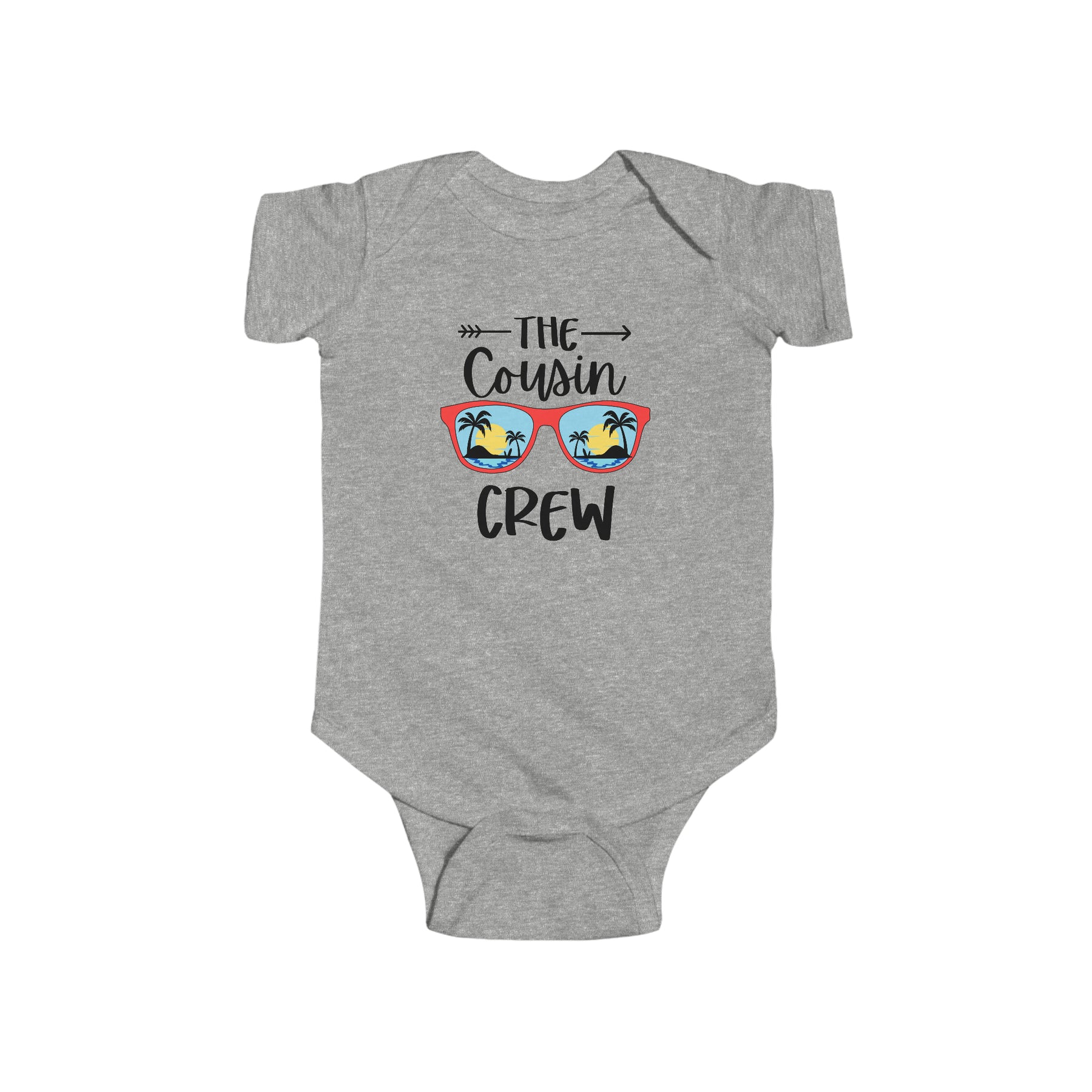 A durable and soft infant fine jersey bodysuit featuring the Cousin Crew Onesie title. Made of 100% cotton with ribbed knitting for durability and plastic snaps for easy changing access.