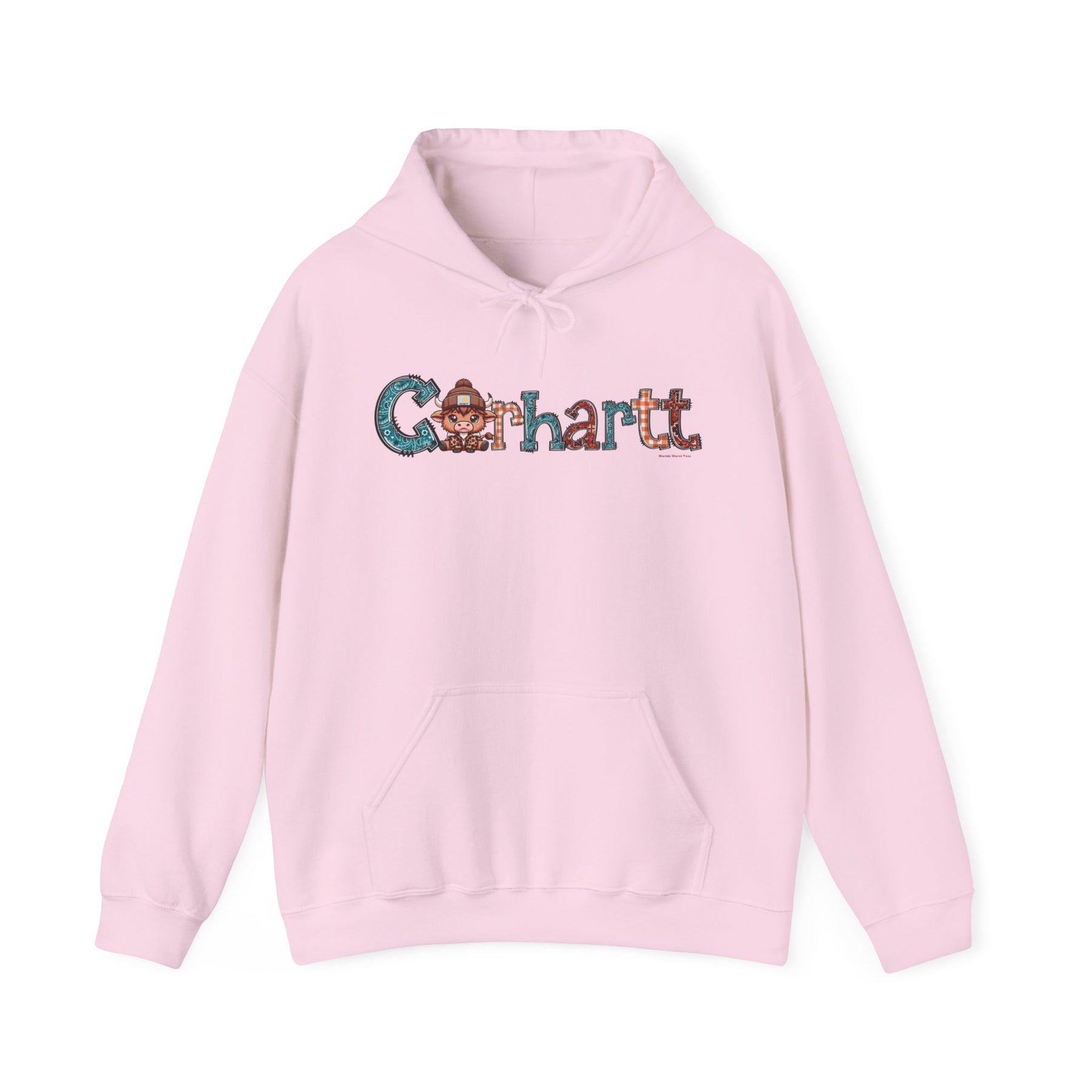 A cozy Cowhartt Hoodie featuring a cartoon cow with a hat and text, perfect for relaxation. Made of 50% cotton and 50% polyester, with a kangaroo pocket and drawstring hood. Classic fit, tear-away label.