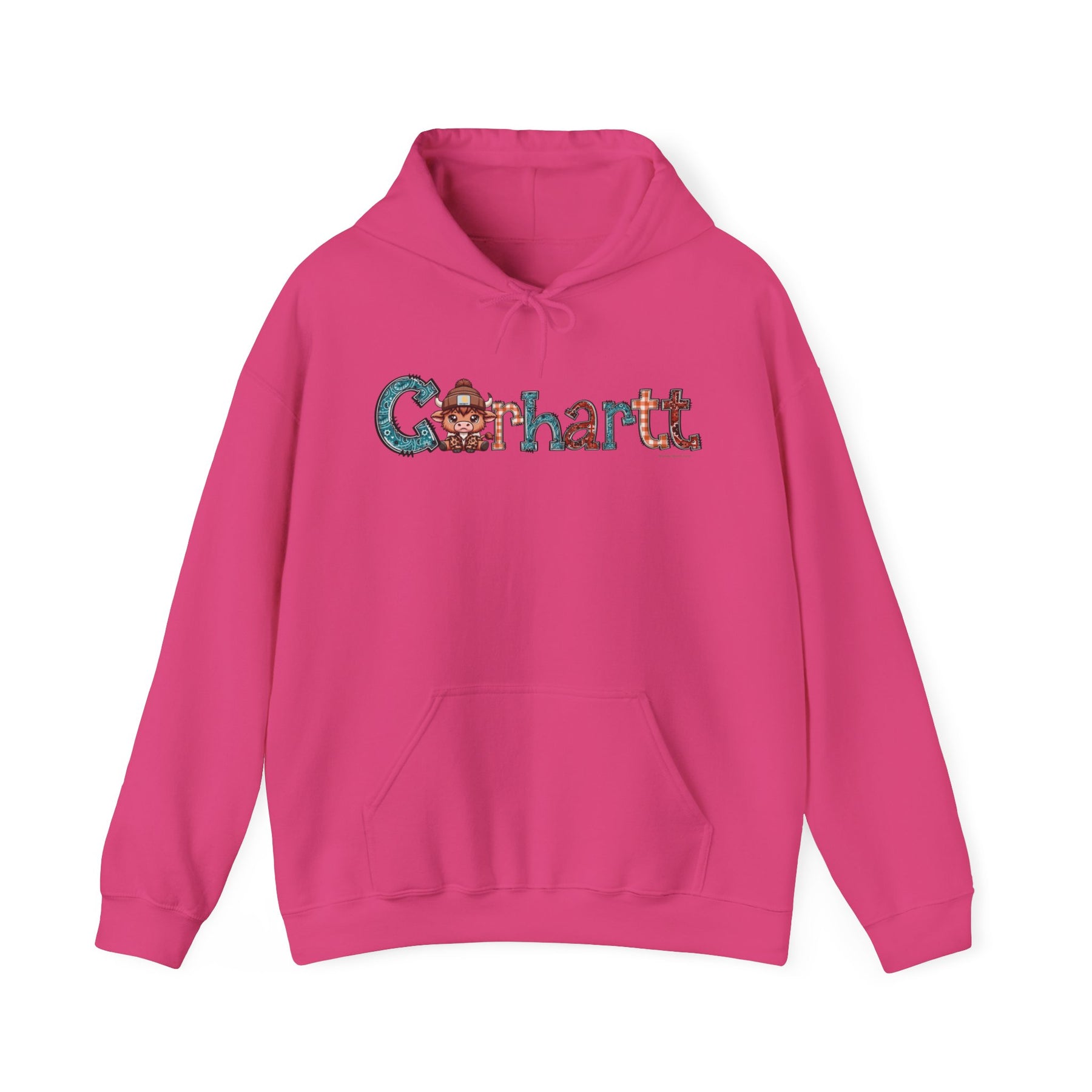 Unisex Cowhartt Hoodie: A plush blend of cotton and polyester, featuring a kangaroo pocket and drawstring hood. Classic fit, tear-away label, ideal for printing. Medium-heavy fabric, cozy and stylish.