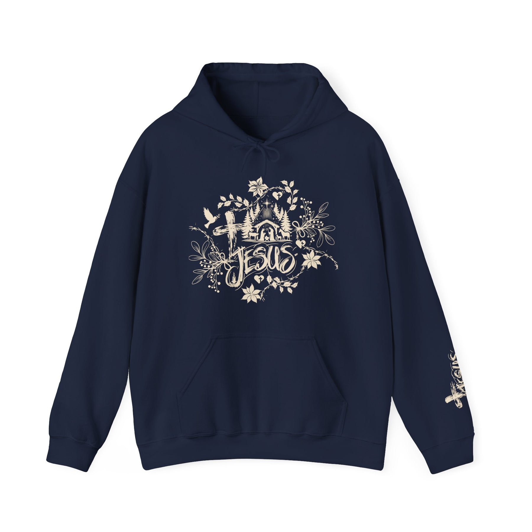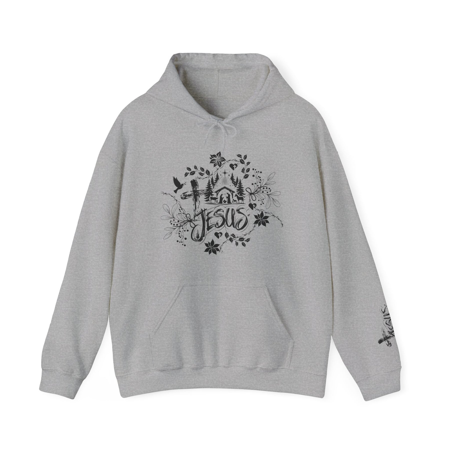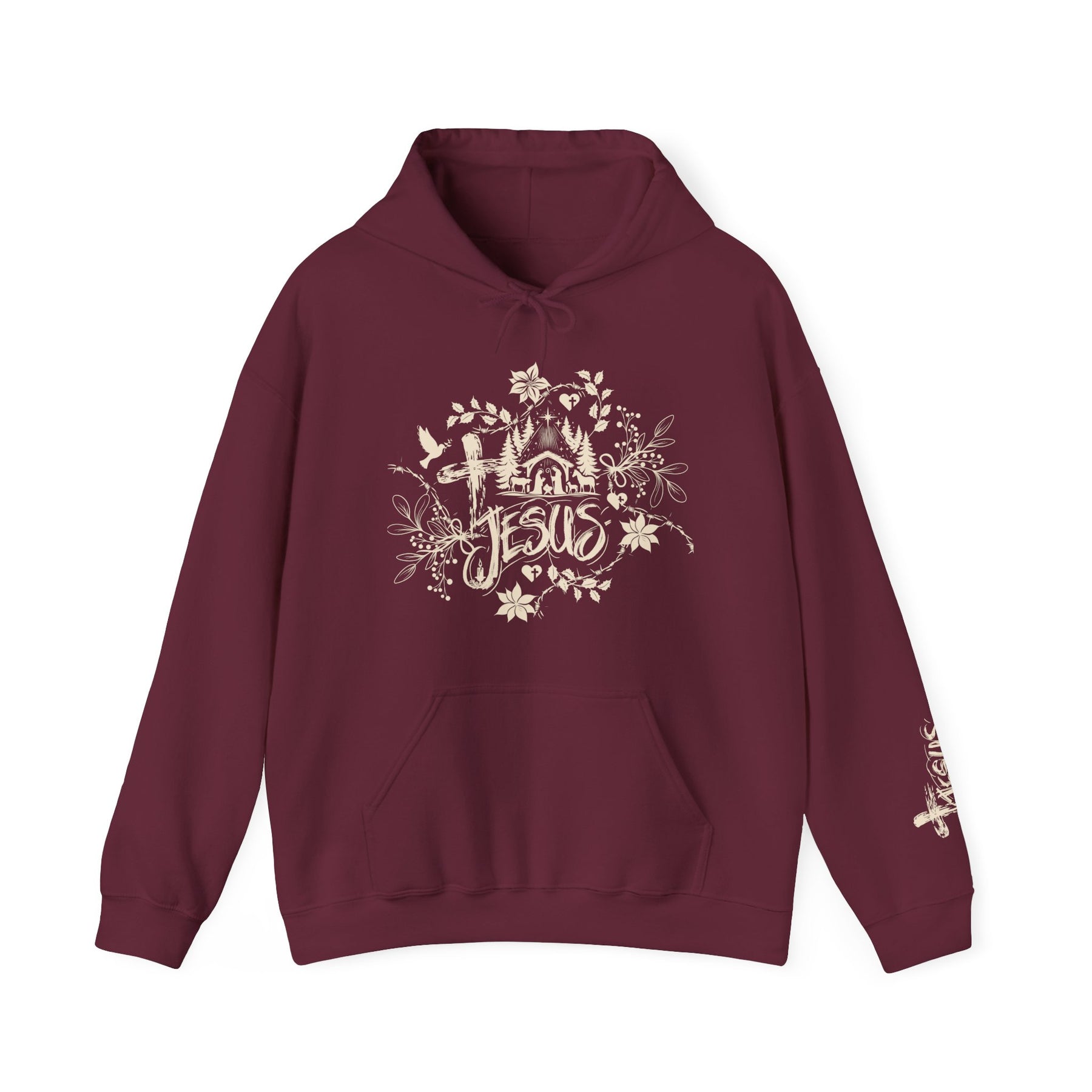 The Jesus Hoodie is a unisex heavy blend hooded sweatshirt is relaxation itself. The material is a thick blend of cotton and polyester. This makes for a plush, soft feel alongside warmth. It's also a great surface for printing. There are no side seams. A spacious kangaroo pocket hangs in front. The hood's drawstring is the same color as the base sweater.