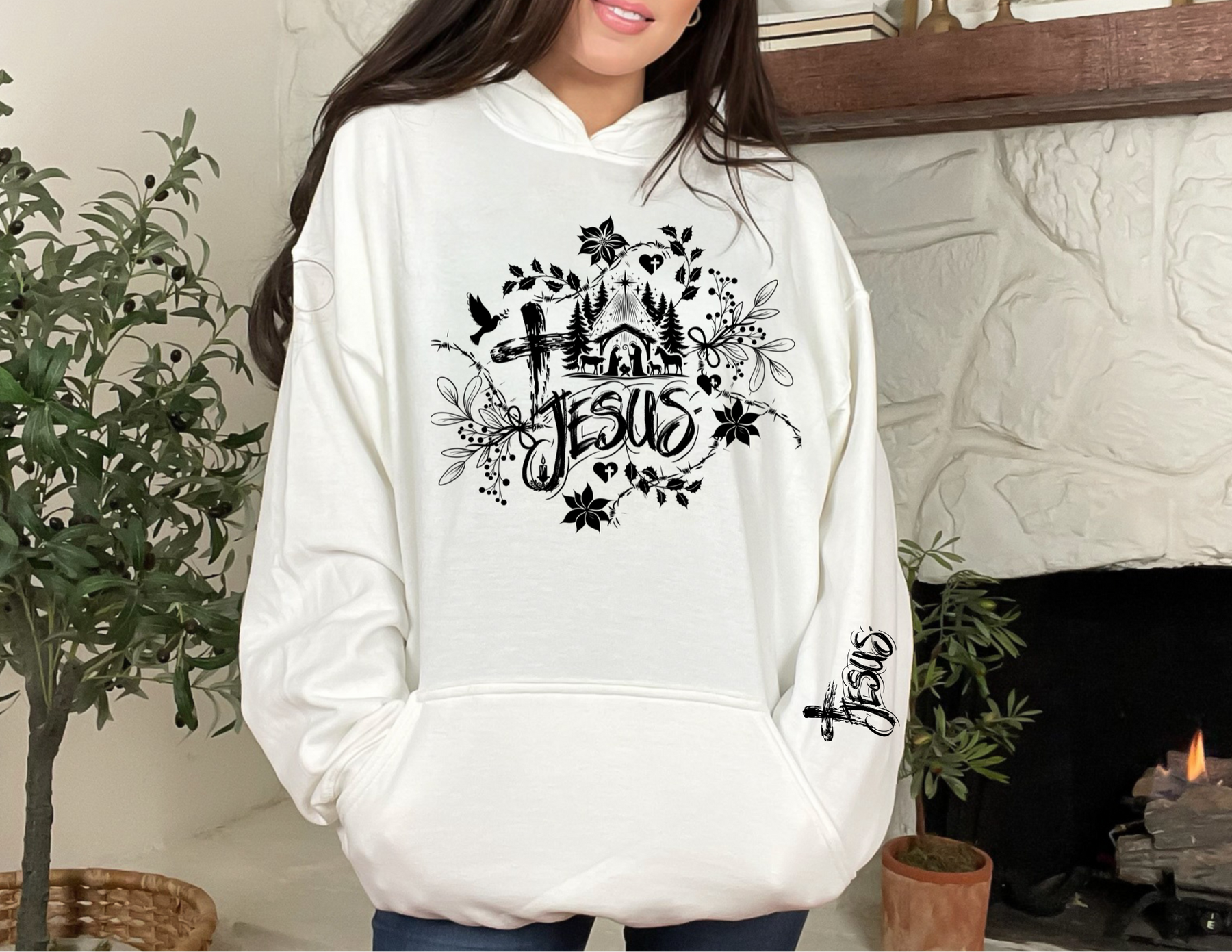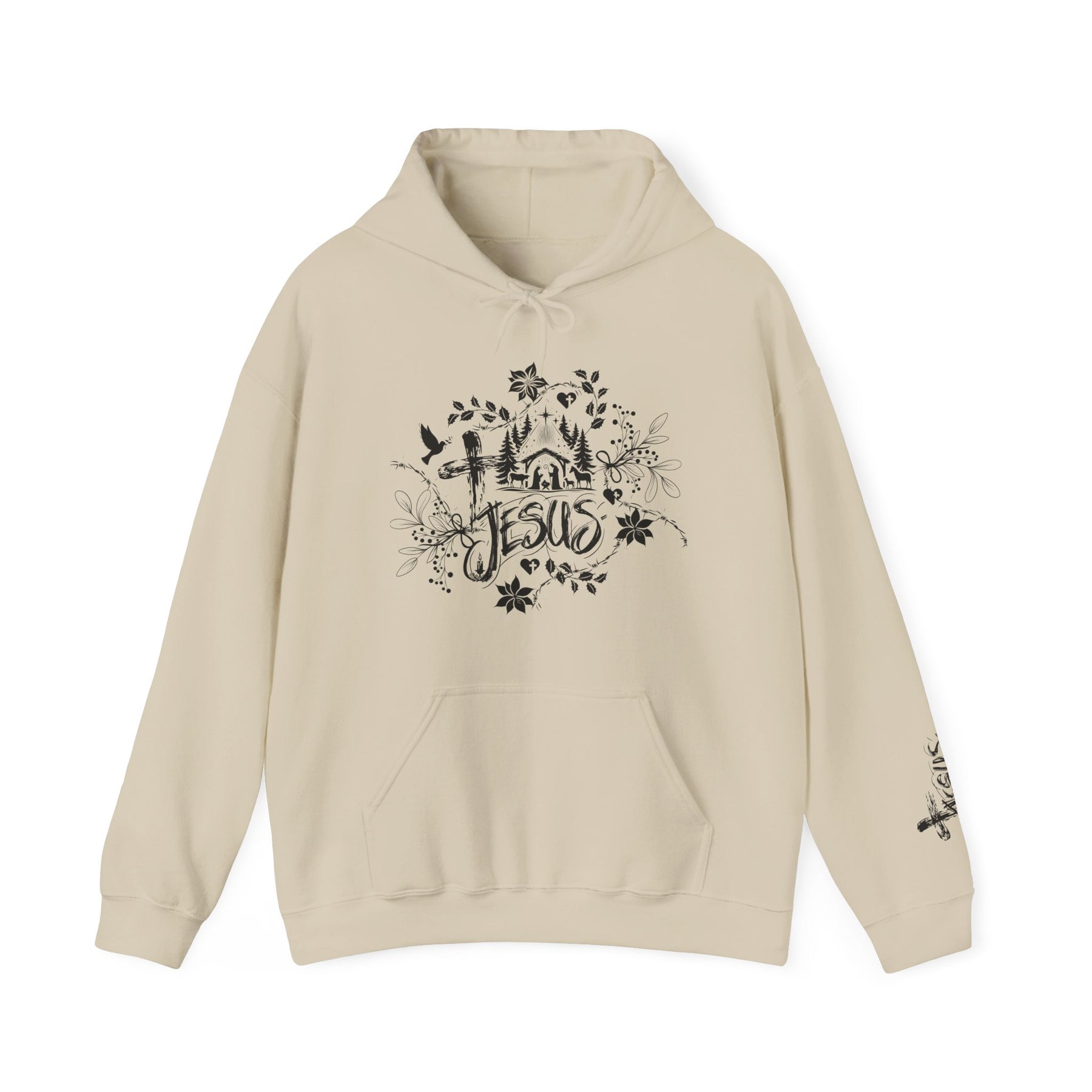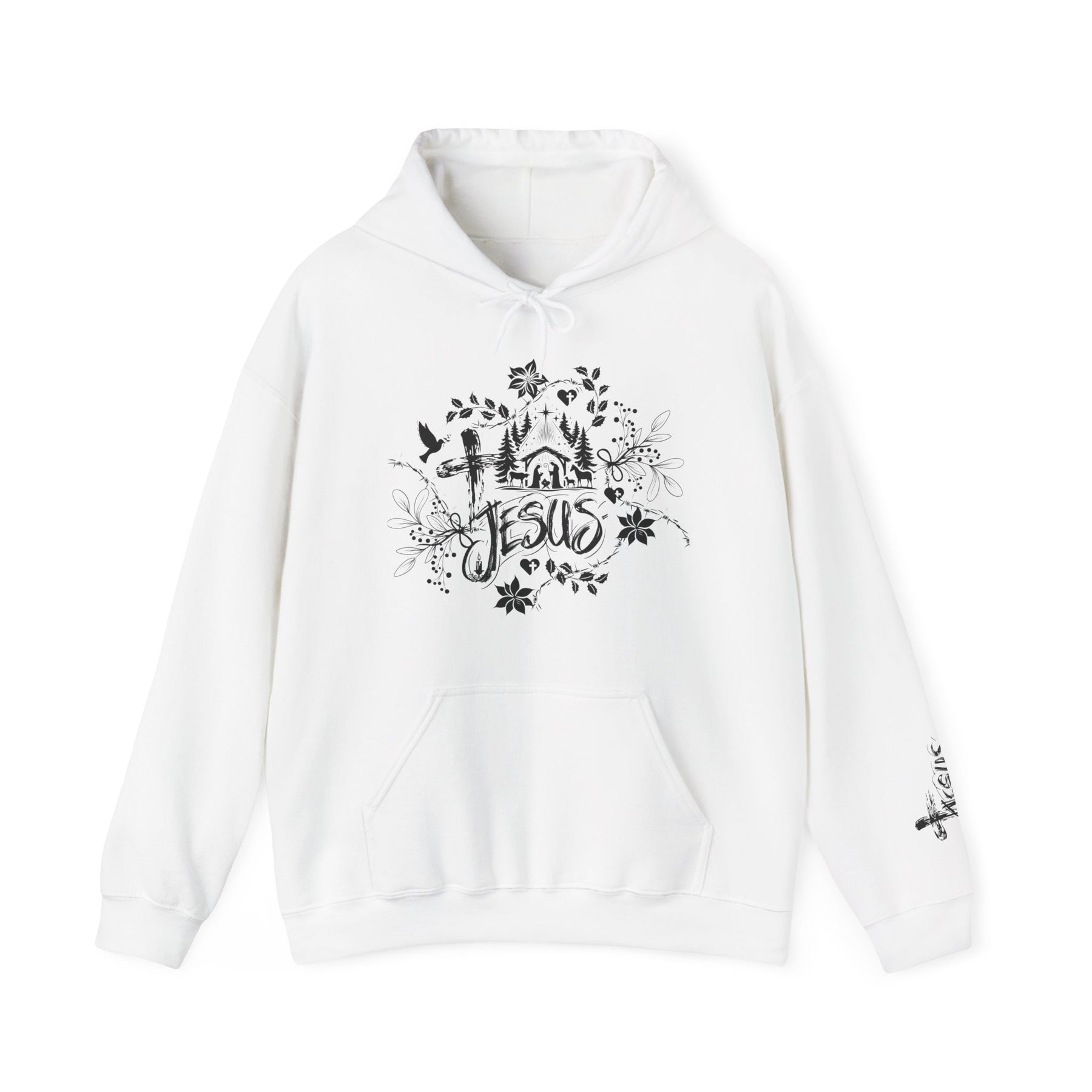 The Jesus Hoodie is a unisex heavy blend hooded sweatshirt is relaxation itself. The material is a thick blend of cotton and polyester. This makes for a plush, soft feel alongside warmth. It's also a great surface for printing. There are no side seams. A spacious kangaroo pocket hangs in front. The hood's drawstring is the same color as the base sweater.
